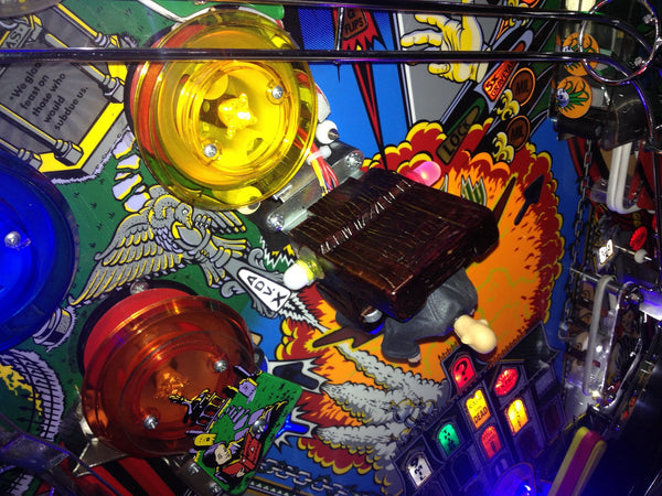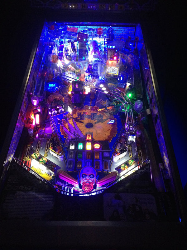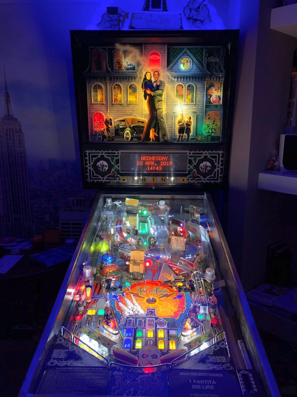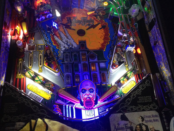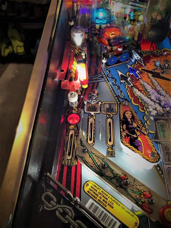 The game features a four flipper layout including numerous Lawlor staples, such as the shot through the bumpers, and the upper-flipper ramp shot. The game has many uniquely notable features including an animatronic hand with a built in magnet that will grab and lock pinballs for multiball, as well as a computer controlled mini flipper that, using artificial intelligence programming, learns to shoot a tricky cross-playfield shot with remarkable consistency. This game is also frequently credited with popularizing the "wizard mode" (despite not being the first game to have one). A true success for Bally/Williams, Addams Family holds an important place in pinball history, and well deserves its sought after status.