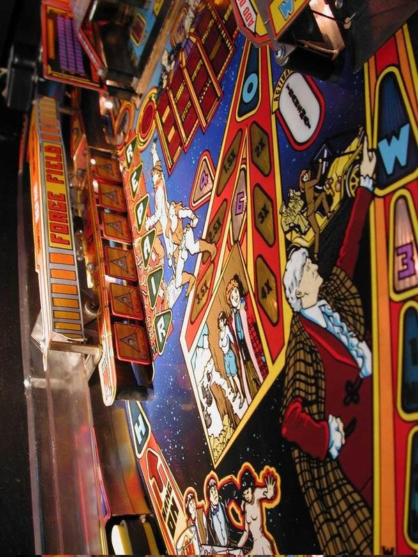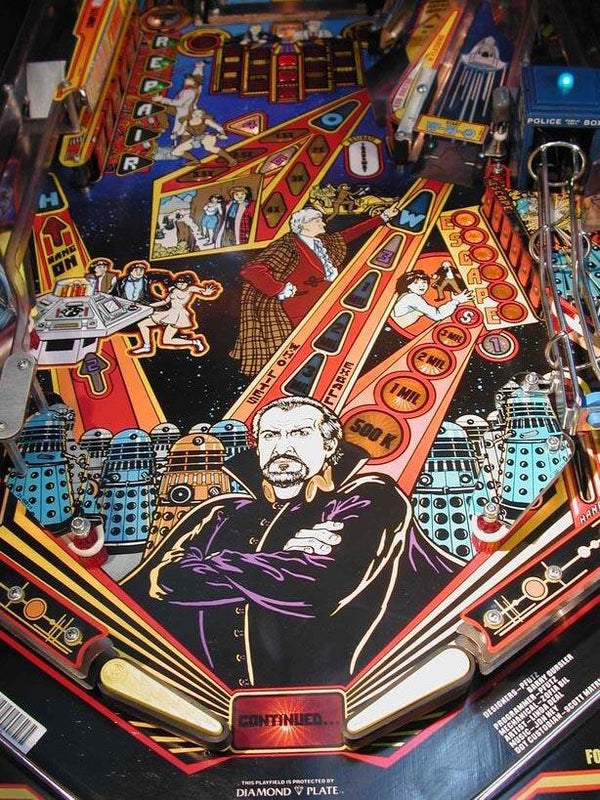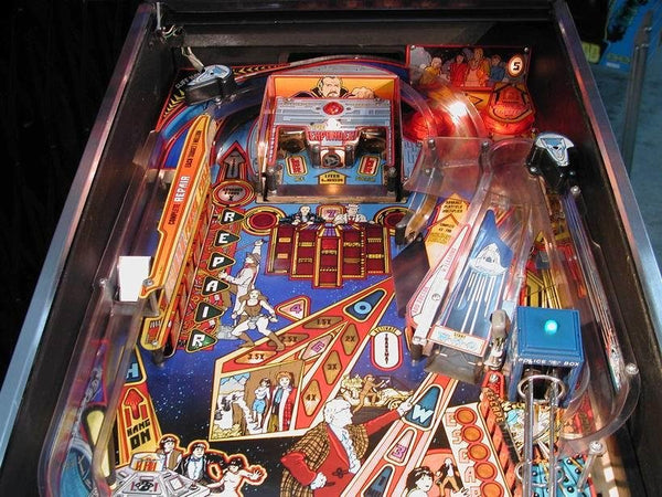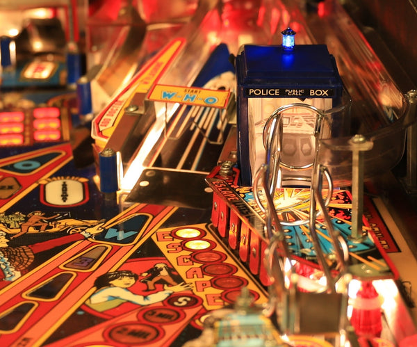 Bally’s Doctor Who is themed upon the British sci-fi television serial which has been in production since 1963. The game itself features the first seven “Doctors” who appeared in the title role--each Doctor is associated with a different playfield scoring feature and can be selected by the player throughout game progression. The main feature of the game is the Time Expander unit, a moving mechanism with different levels where players are challenged to lock balls and collect targets, leading up to the game’s main multi-ball mode. A Dalek topper and the show’s trademark blue “Police Box” on the lower right of the playfield round out the unique “Whovian” traits that appear in this game.