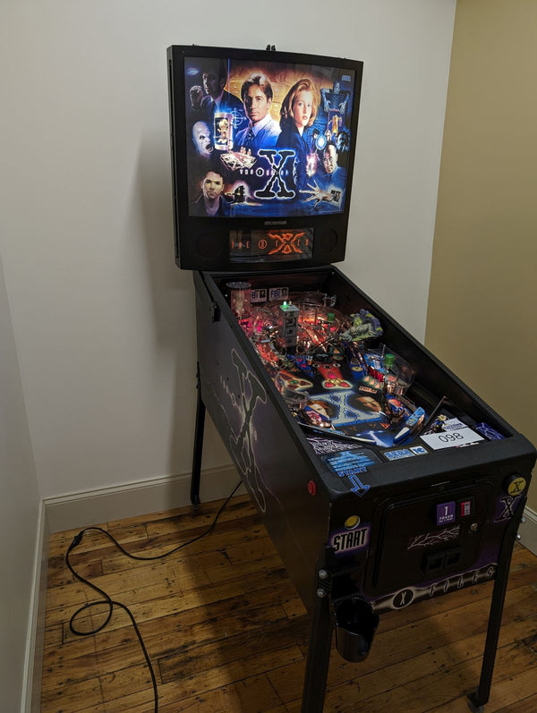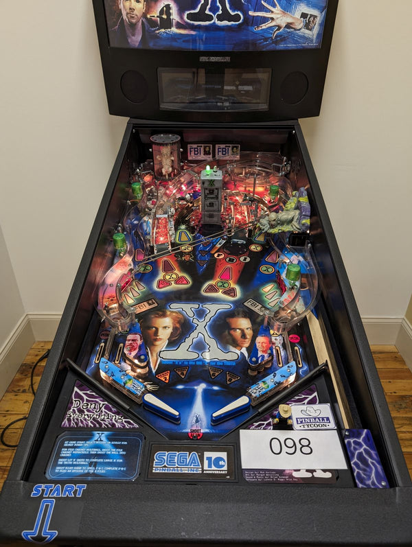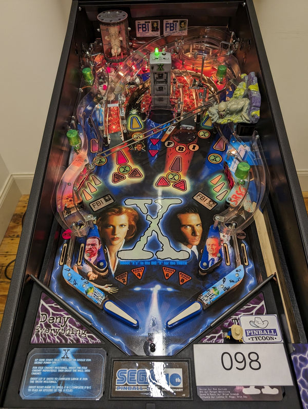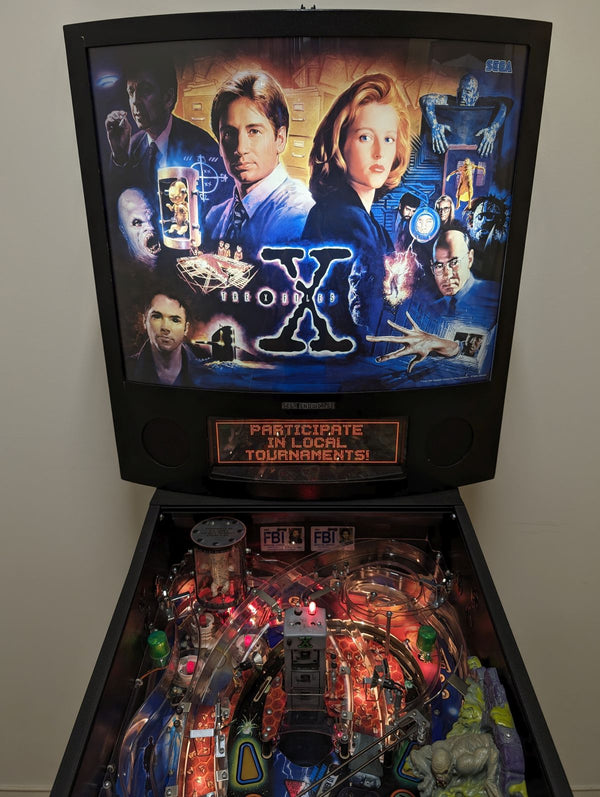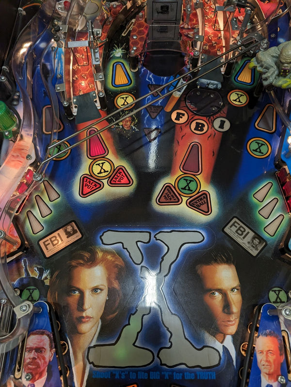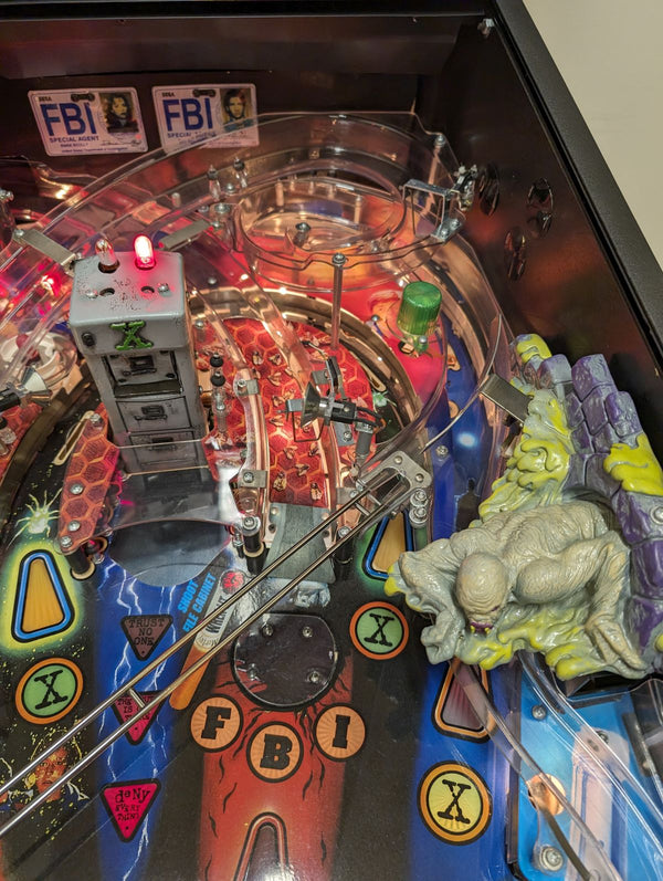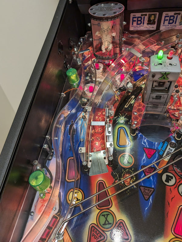 The X-Files pinball set an industry standard with the first premium full 4 color art package making this a seriously good-looking cabinet. There are also plenty of incredible features, gameplay and well realized models including an Alien Baby in an Erlenmeyer Flask, the Flukeman from The Host, trapdoors and a descending X-Files cabinet just like the one in Mulder’s office with a Ball Deflector!