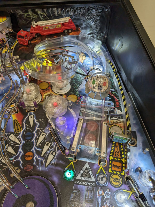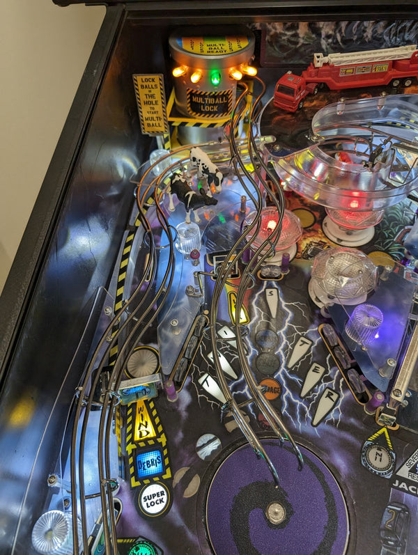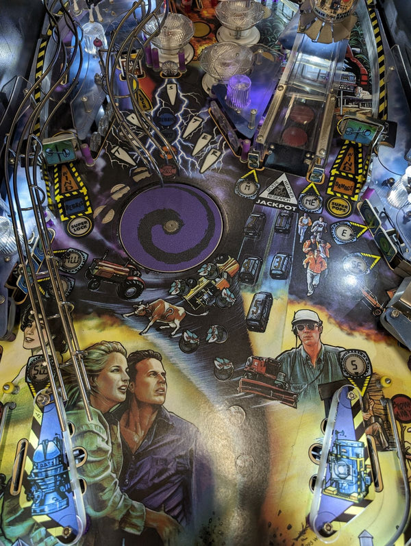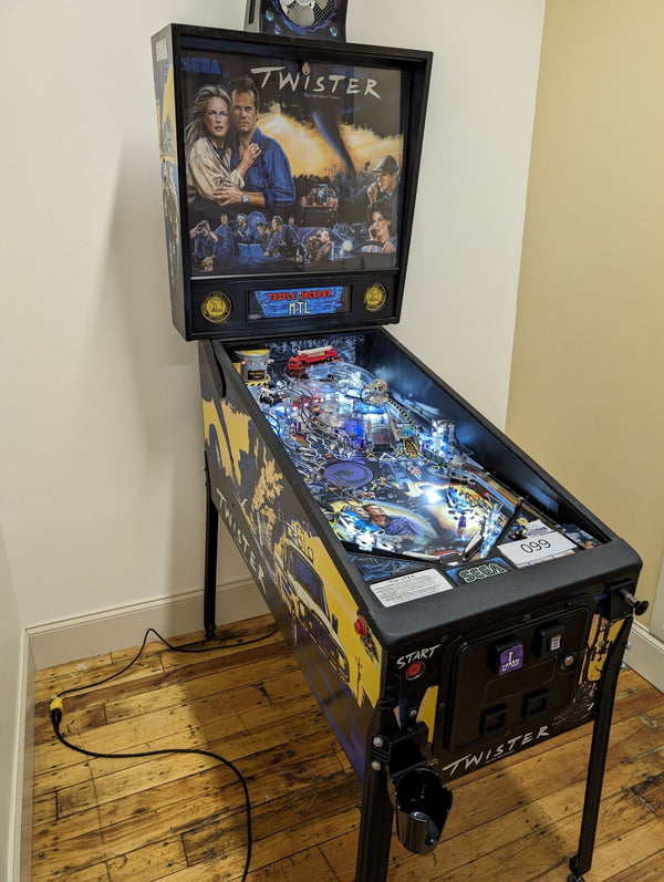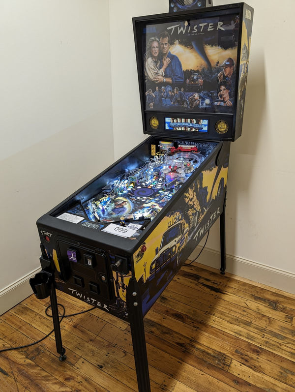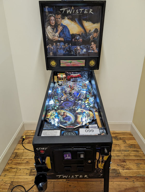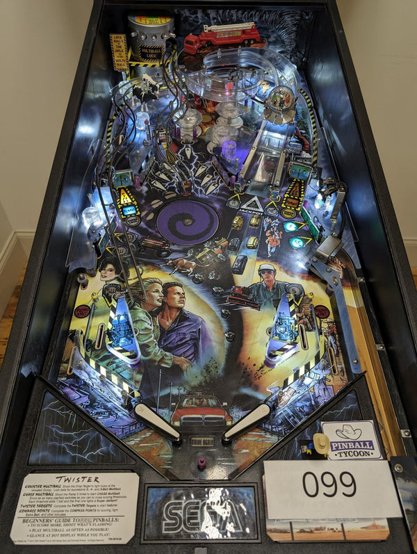 In April 1996 Sega Pinball, Inc. released the Twister pinball machine in tandem with Warner Bros. hit movie of the same name. Packed with images and themes from the movie, and a wind-generating topper to give you a little twister feel, this game is full of challenging shots and fast gameplay. The film Twister became the second-highest grossing film of 1996, and this pinball machine is guaranteed to be a hit for you as well!