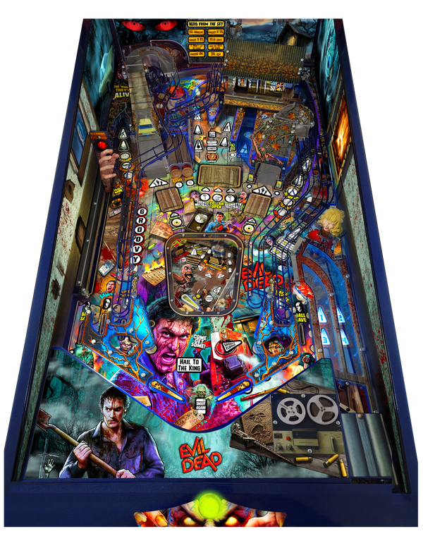 Evil Dead Pinball is a wide body pinball machine set in the world of the first two films of the iconic franchise, The Evil Dead, and Evil Dead 2: Dead by Dawn. The players will be guided along by Ashley Williams, voiced by Bruce Campbell, as they battle the relentless forces of evil. Ash's now evil girlfriend Linda (voiced by Lara Sluyter) and Professor Knowby (Voiced by Scott Innes) will provide an additional level of Deadite trickery and direction to the game. Evil Dead Pinball is our most ambitious game to date, featuring the highest number of mechs in a Spooky Pinball machine yet. The game also features original clips, speech, and sfx from both films. Evil Dead Pinball is the 4th game by the designer duo "Spooky Luke" and Corwin "Bug" Emery. Many other Spooky crew members have returned for this release, including Ben Heck on the code, Matt Montgomery providing the score, Back Alley Creations, on the sculpts. This is also the first in a series of many Spooky Pinball games featuring a full art package by Christopher Franchi. It's time to officially "Join Us" in what we can confidently say is our most beautiful, most loaded, most impressive world under glass yet.