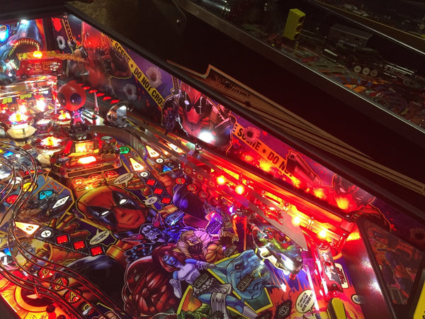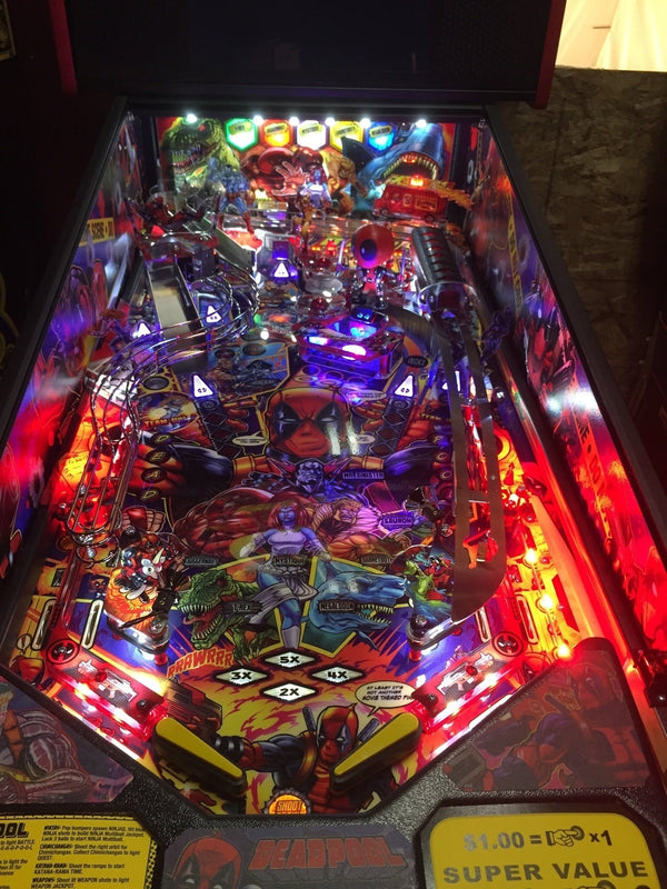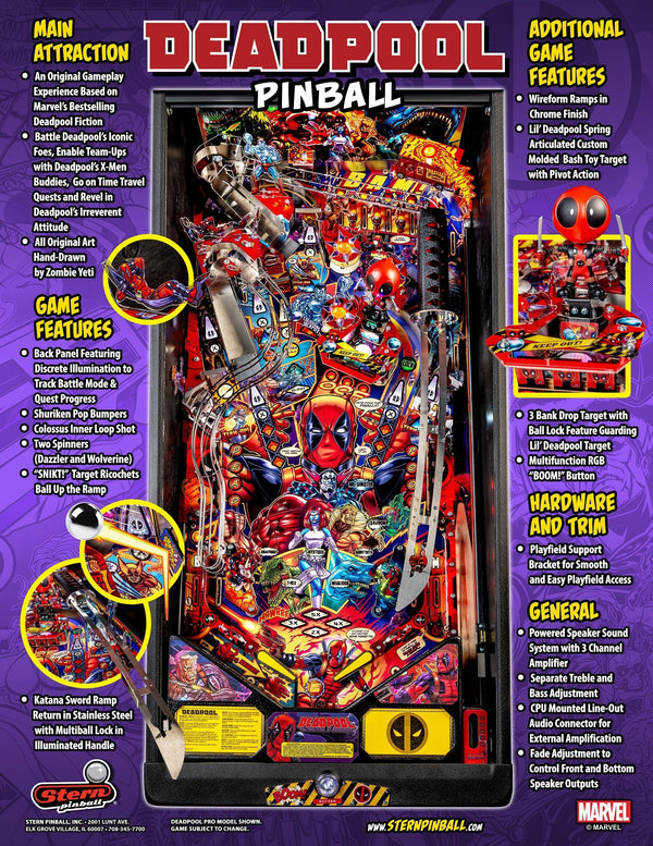Stern’s Deadpool Pro, Premium, and Limited Edition models feature stunning and distinctive hand-drawn art by renowned illustrator Zombie Yeti. Well known actor Nolan North stars as the eccentric voice of Deadpool. Each game features a 3-bank drop target with a ball lock that’s guarding a custom molded Lil’ Deadpool bash toy target. In addition, all models include two stainless steel and wireform ramps with a Katana Sword ramp return. Deadpool pinball entertains with an amazing array of ninjas, vampires, and chimichangas, making it suitable for all skill levels.