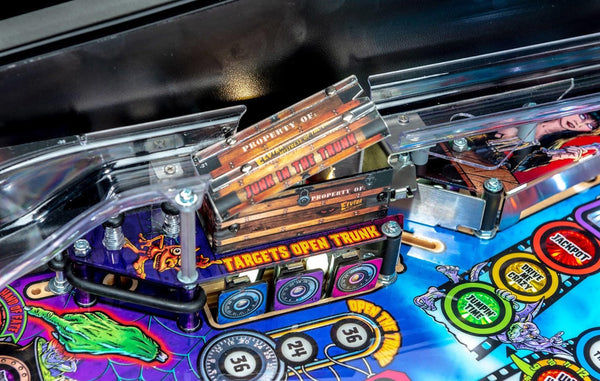 If a haunted mansion wasn’t enough to keep your skin crawling, beware of the “Deadhead Family Crypt”! This mausoleum houses a variety of characters that need an awakening courtesy of a steel silver ball to their head. This interactive crypt will keep players on their toes with the Crypt entrance unleashing balls from a separate location while also becoming a physical bash toy. And with Elvira’s pending move from her hopeful home sale, the interactive Elvira’s “Junk in the Trunk” toy allows players to lock balls for a frantic two-ball multiball.