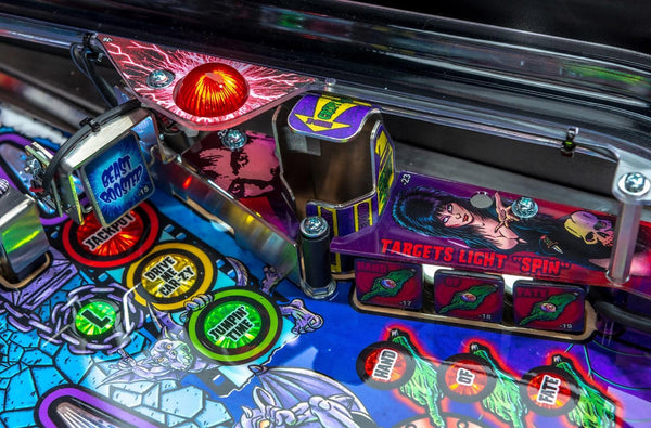 The Premium, Limited Edition, and Signature Edition models all feature Elvira’s “House of Horrors”, a frightening Victorian fixer-upper, full of creepy charm and supernatural surprises. Players can gain access to the mansion through the front door, the cellar, or through the garage which is guarded by a gravestone drop-target. An orchestra of color changing RGB lights accentuates the house in sync with the different “House Haunts” featured throughout the game. Lighted windows and a spinning attic turret track players’ progression on their pinball journey.