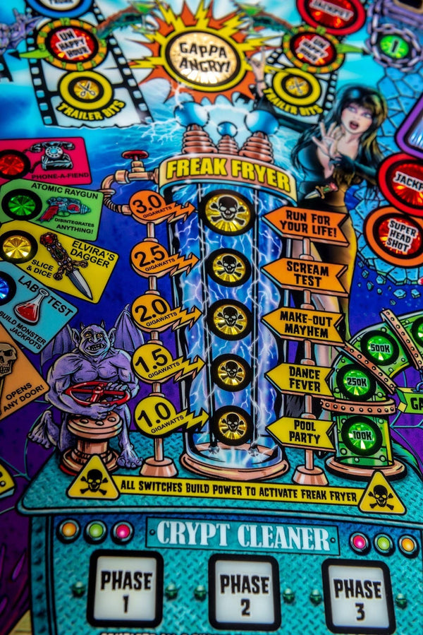 The taunting is over and the haunting begins in the third and campiest installment of the Elvira pinball trilogy! Trying to sell her mansion through “Alternate Realty”, Elvira’s house is haunted by the movie characters from her past. These ghouls, ghosts, monsters, and strange assortment of vintage characters with horrific acting skills seek revenge on Elvira while she and the player confront them, sending them back to the “film” from which they came! Elvira’s House of Horrors immerses players in a fun, campy, B-movie universe filled with all of the humor expected from the Mistress of the Dark including custom speech and, in a pinball first, exclusive filming of Elvira for custom video scenes featured throughout the game!