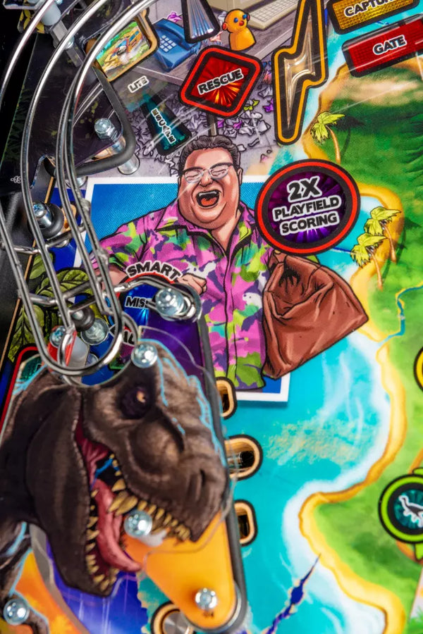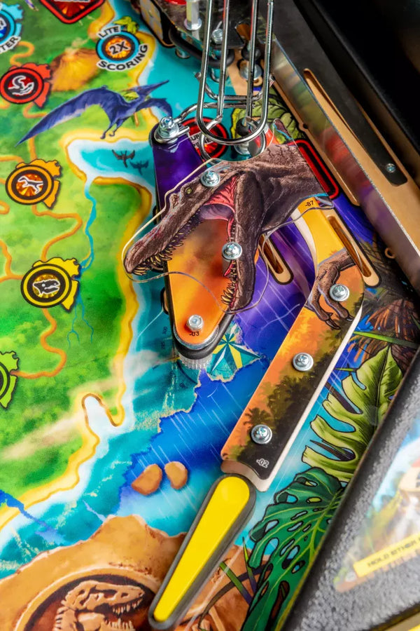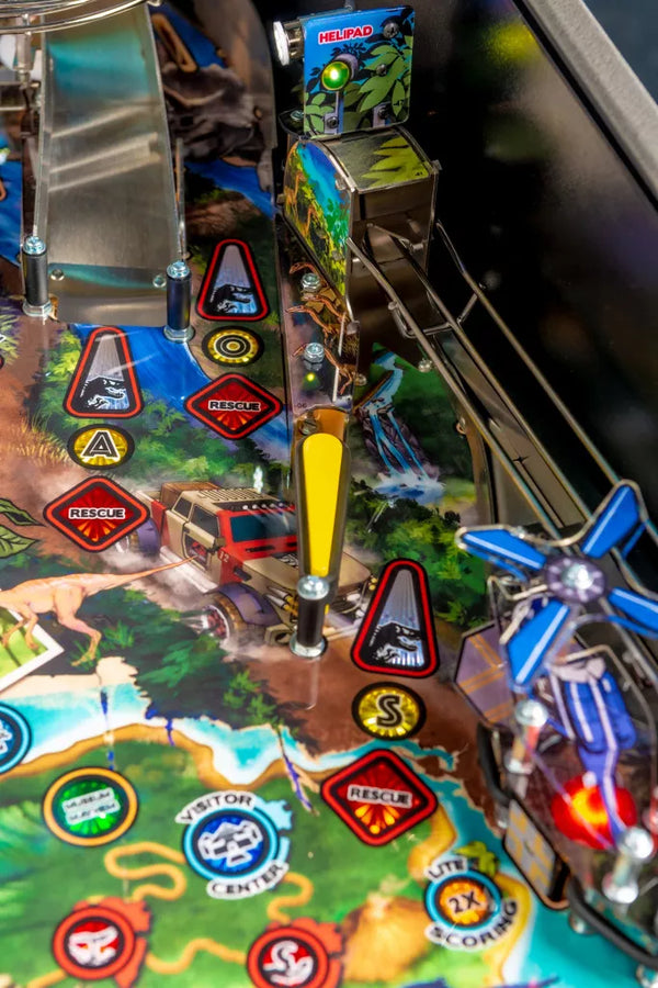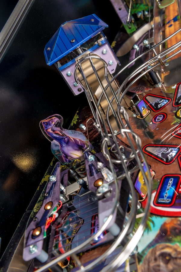 The Premium and Limited Edition models feature an amazing animatronic ball-eating, ball-throwing T. Rex that interacts with the ball and the player. These models also include an interactive Raptor and Raptor Pen featuring a ball-lock mechanism guarded by a motorized gate. The action does not let up with unique mosquito-in-amber pop bumpers and a custom metal horizontal helicopter spinner.