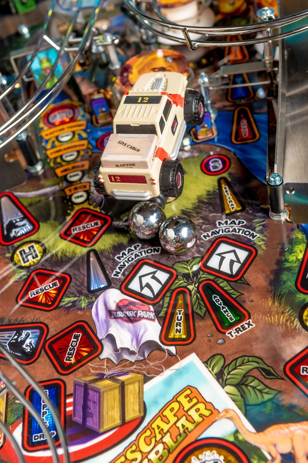 The Pro, Premium, and Limited Edition models also feature a Jungle Adventure Vehicle target in the middle of the playfield that is a spinning Newton Ball. This kinetic target registers direct hits, determines the direction players navigate on the island during gameplay, and lights T. Rex modes. All models include three full sized flippers, four custom ramps, a spinning “Spitter” target, in-lane up/down lock post that sets up critical playfield shots and distinctive hand-drawn art highlighting iconic dinosaurs from the series.