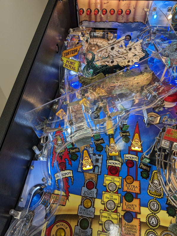 - A mechanical pirate ship that the player strikes with the pinball. With each hit, the ship lowers its sails and eventually sinks into the playfield, thus revealing a shot into the Kraken’s mouth. In this area, the player can sink the ship, destroy the Kraken, and fight Davy Jones.
