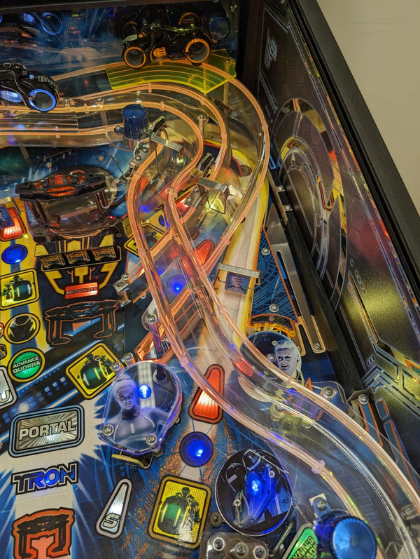 In TRON: Legacy Pinball, players battle as Sam Flynn on the Grid against Clu and Rinzler. Players will enjoy multi-ball rounds themed around scenes from the film: ride the two ramps for Light Cycle battles on different levels of the Grid; defeat the motorized Recognizer target bank to expose Rinzler’s spinning Identity Disc; or fire the ball from Rinzler’s Disc to simulate a Disc War. There are numerous play features for characters in the film, including Kevin Flynn, Gem, Zuse, Quorra and Clu. Play all features to escape the Grid through the Portal.
