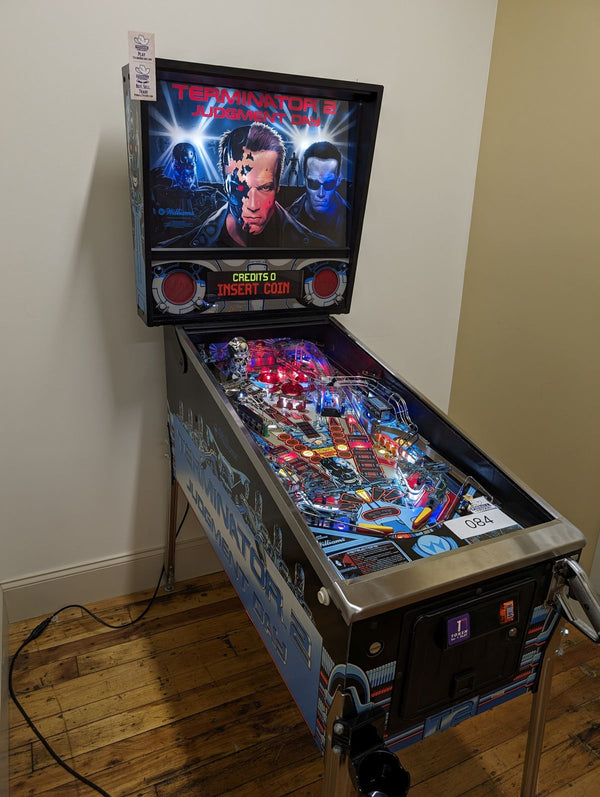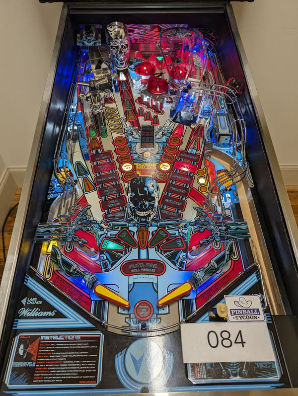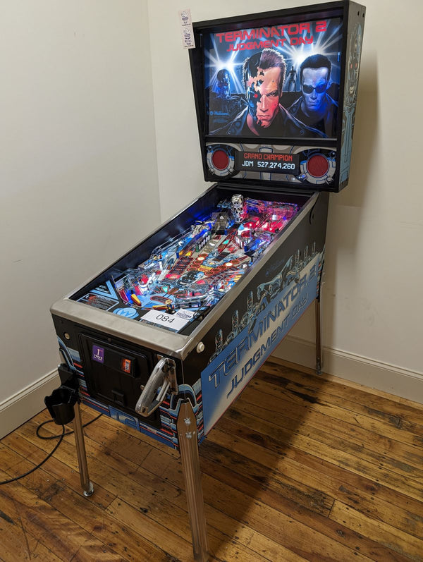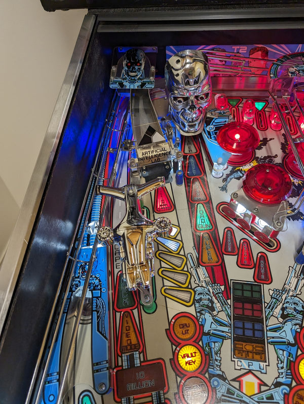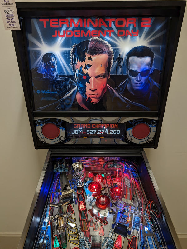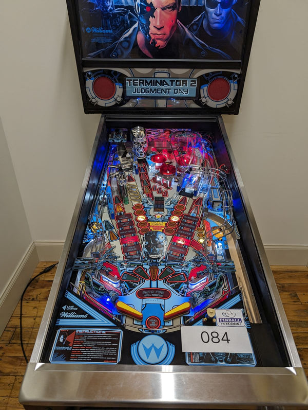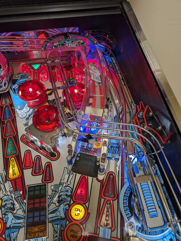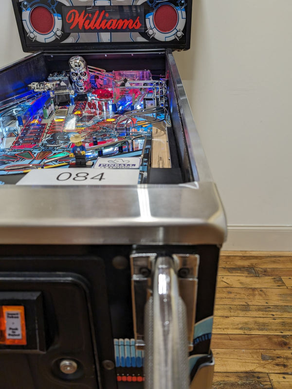 The unstoppable cyborg from the future, the Terminator, is back! Williams captures the essence of the blockbuster action movie with this breakthrough pinball machine. Featuring elements never seen before, like the swingout "cannon" shot mechanism, Terminator 2: Judgment Day the pinball machine is fast, action packed, and ready for a player like you!