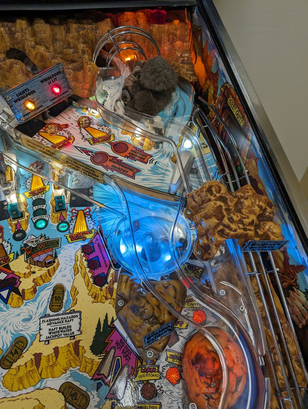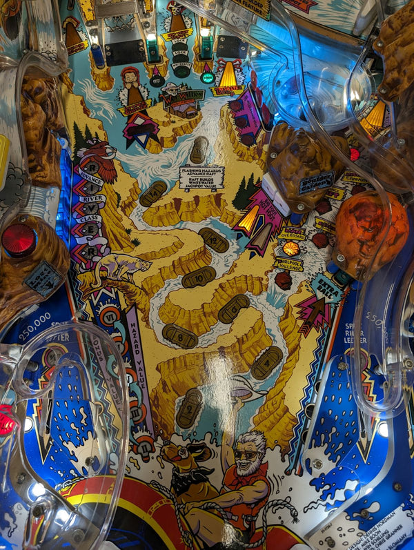 White Water is a non-licensed pinball machine with a primary objective of moving your raft down the river to “Wet Willy’s” in order to get the “Vacation Jackpot.” You move your raft down the river by shooting the flashing “Hazard” shots, each with a unique rafting theme name. Each time you complete a raft, the number of “Hazard” shots you must hit successfully to complete the next raft increases. It takes eight completed rafts to advance to “Wet Willy’s.” Successfully completing “Wet Willy’s” enables the player to attempt the collection of the “Vacation Jackpot."