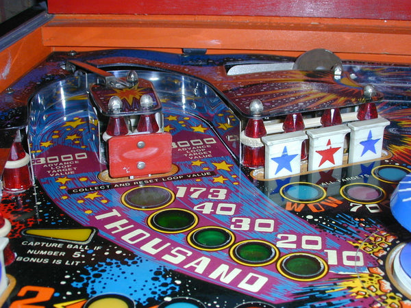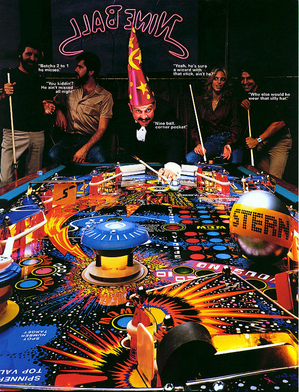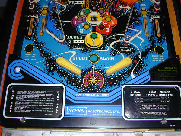 One of Stern's early solid state games, Nine Ball mixes classic shots with some new twists, and represents Stern's first game incorporating multiball. Loaded with their signature drop targets, spinner, and a quick turn horseshoe shot, this game is an enjoyable blend of classic and early 80's style that players can easily enjoy for hours on end.