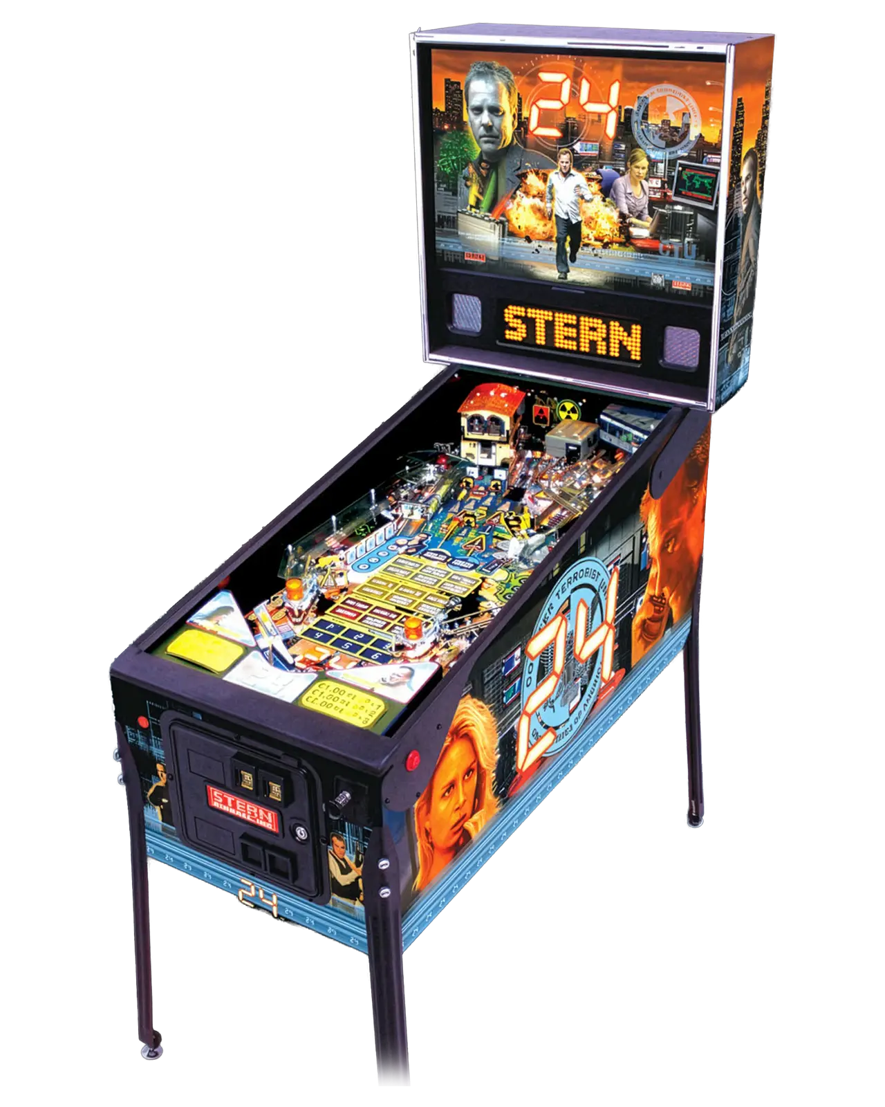 Jack Bauer is back, but this time in Stern Pinball’s new 24™ pinball machine. Designed by Steve Ritchie and Stern’s engineering team, Stern Pinball takes FOX’s hit television show and turns it into one fast-paced pinball machine that will excite both operators and homeowners.