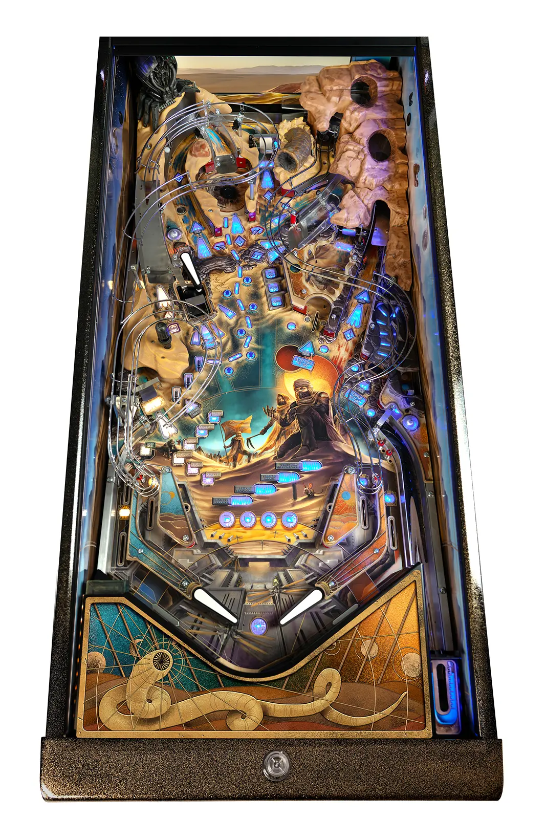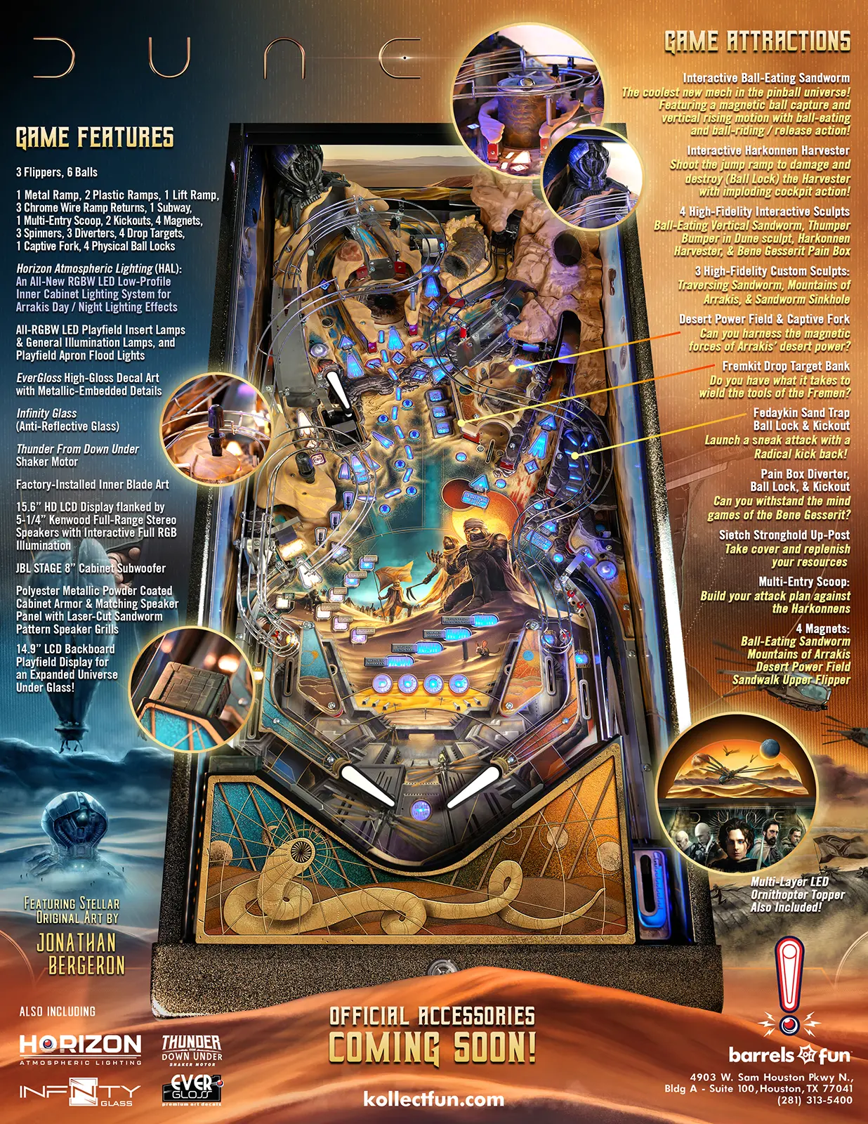 - Step into the world of Arrakis and develop your skills to fight alongside the Fremen and House Atreides against the dreaded Harkonnen army in the Dune pinball machine from Barrels of Fun!