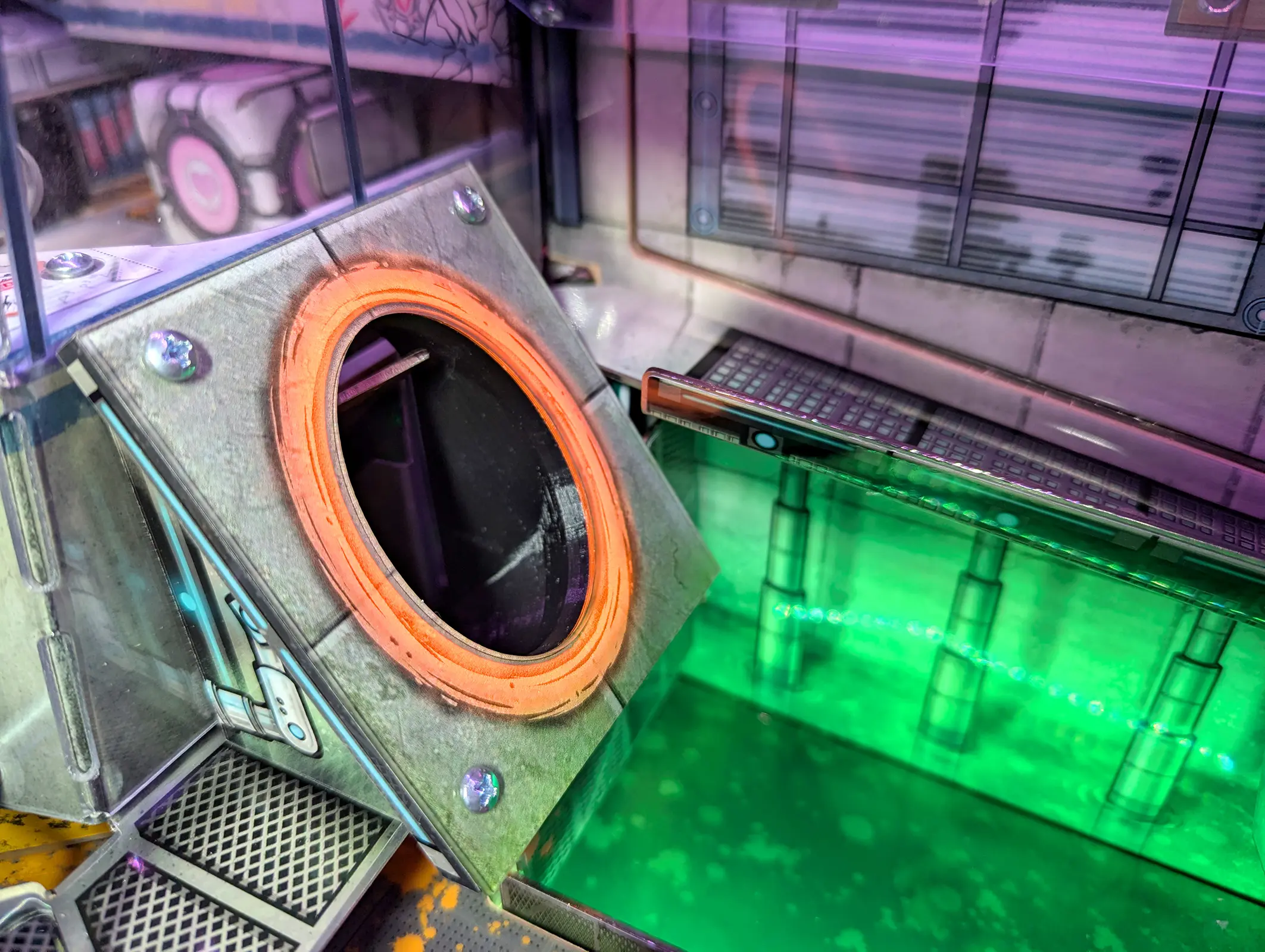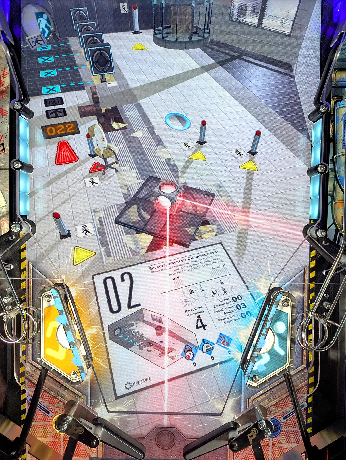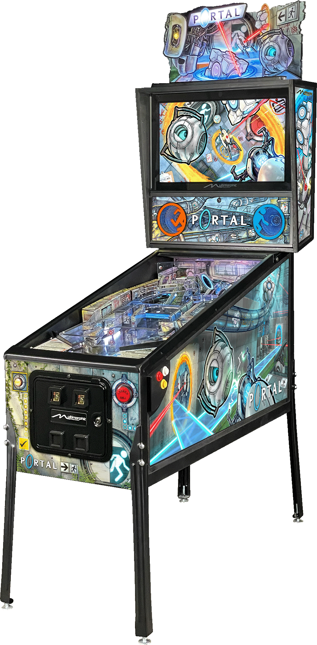 Portal is a pinball game based on the Portal series of video games from Valve. While playing the game, you will interact with many physical and virtual features modeled after elements from the Portal 1 and Portal 2 video games. The physical playfield is packed full of interactive mechs and 10 RGB illuminated physical playfield portals and 6 additional scoop portals, through which the pinball can “travel through” instantly.There are two editions of the game, Portal Standard and Portal Extended. Both editions include the same upper playfield module and game software, while the extended edition also includes the Portal module extension. The Portal module extension floats over the screen and brings gameplay closer to the flippers with additional decorated catwalks, a physical spinner, four physical targets, a third dynamic ramp, the hidden gel tube kickback mechanism, and the elevated, cross-playfield Hard Light Bridge experience. After adding a connection point to your left side target module, swapping in the Portal module extension is as simple as removing the inlane wireforms, lowering the module extension in from above, securing it with 4 screws, and connecting the cable harnesses to their mates on the sides of the upper playfield module. The game software detects the presence of the module extension and adjusts the game rules accordingly. Portal Standard is a 3-flipper game (including the flipper in the LOFT on the module). Portal Extended also uses the left side target flipper, making it a 4-flipper game. The Portal Extended Game Kit therefore requires a Left Side-Target Flipper Assembly. New P3s come with this flipper assembly pre-installed. P3s built prior to 2022 did not.