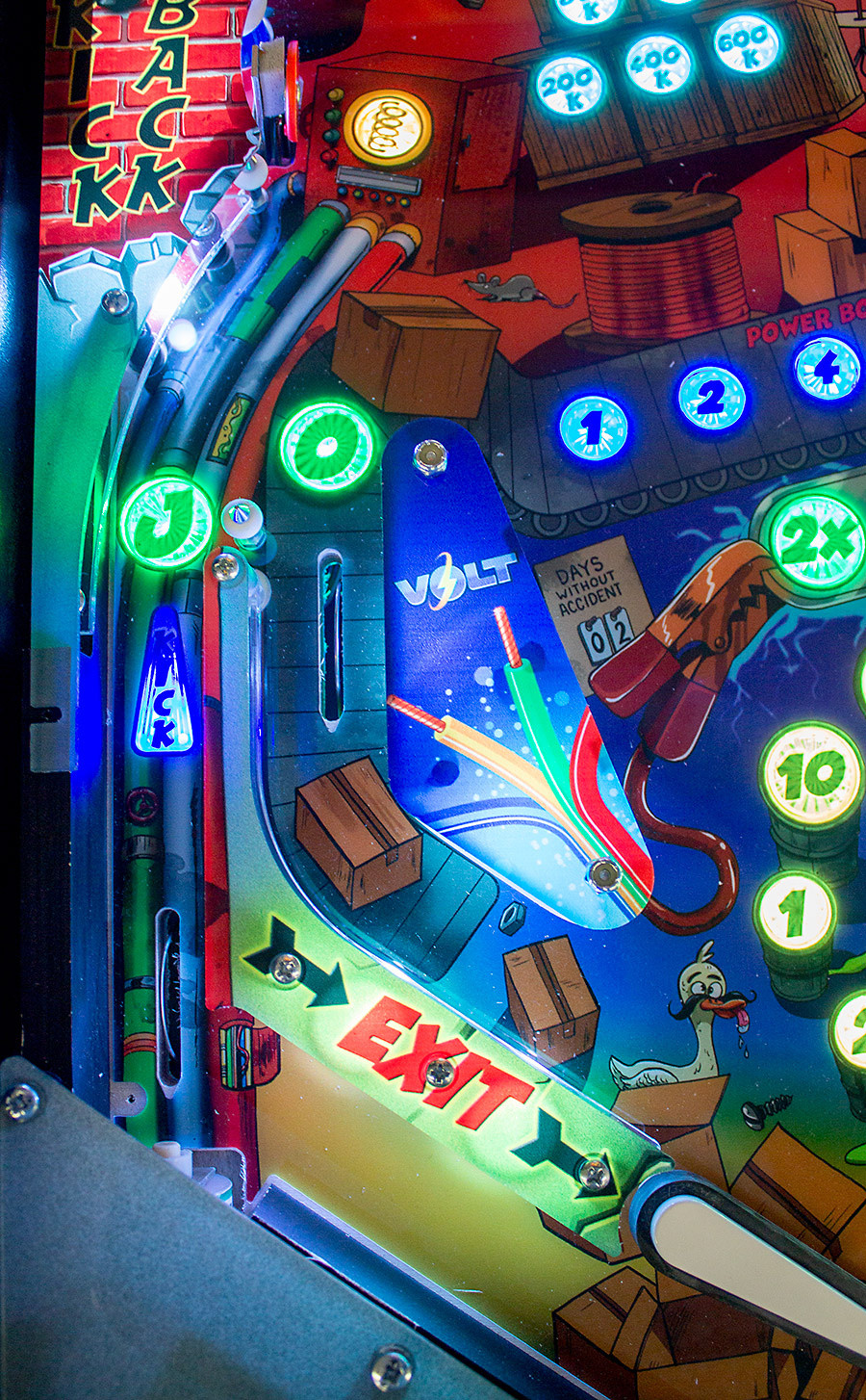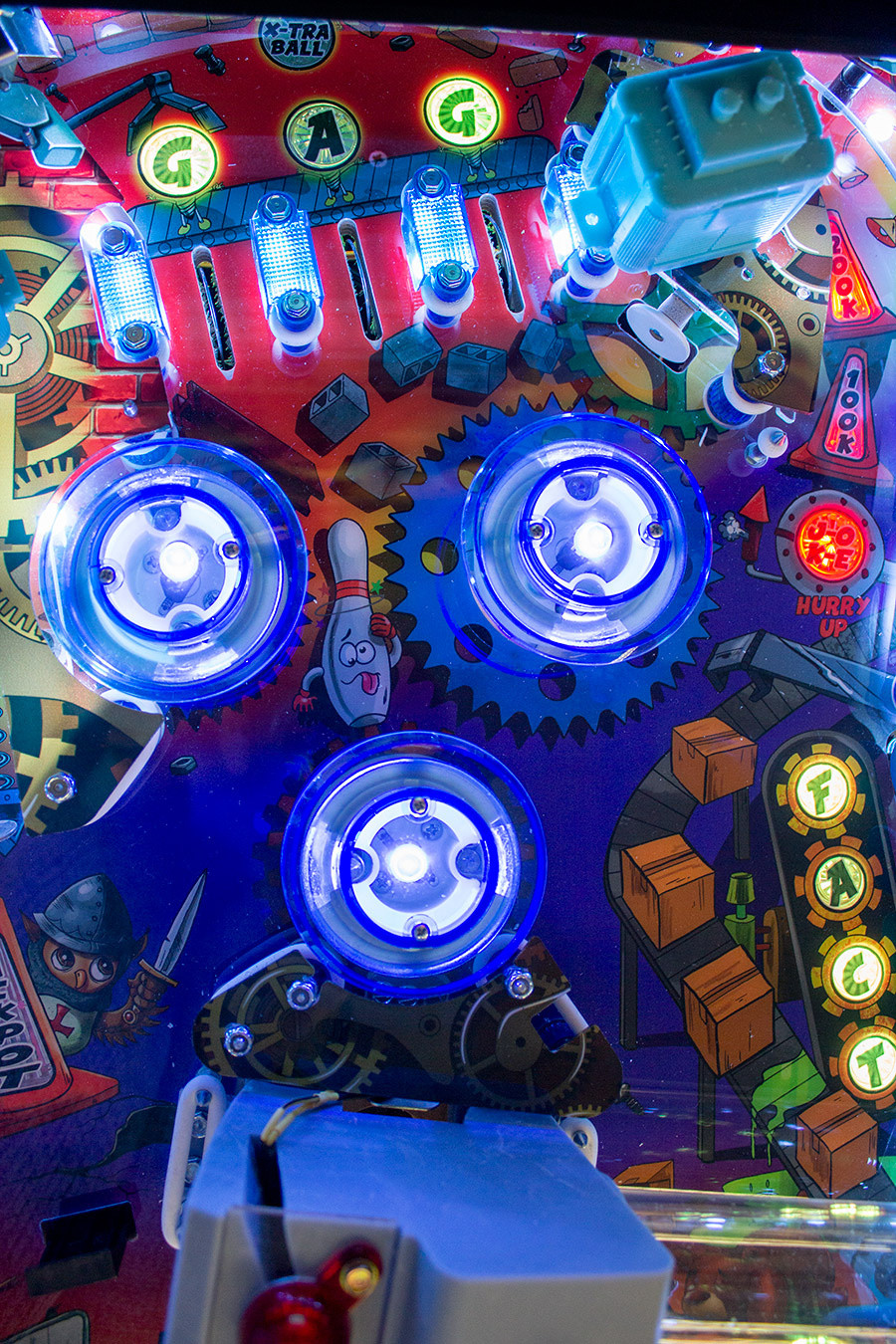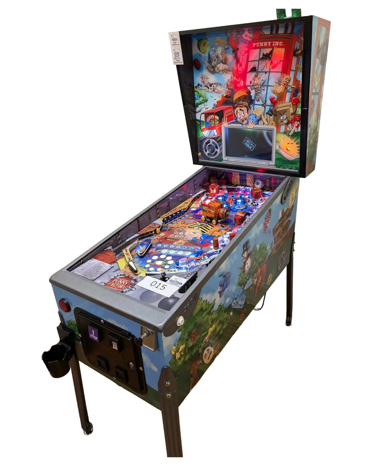 The Punny Factory delivers a professional solid platform that cradles a fun yet challenging playfield that appeals to all. Punny Factory features the beloved old school unique Vari-Target as well as a one of a kind ball press in the middle of the playfield. We’ve also added three of our double shot danger targets along with everyone’s favorite pop bumpers, slingshots and kickbacks for non-stop action.As an industry first, we implemented an Interactive Smokestack system that simulates factory smoke. The Interactive Smokestack system can be triggered during gameplay while catching puns and in attract mode. Eye catching LED lights are incorporated into every aspect of the machine. Integrated throughout the backglass and playfield, the bright and colorful lighting design and synchronization is a definite eye-catcher. A high definition 13″ LCD display is mounted in the backbox, playing randomized full color animations when completing the objectives of the game.