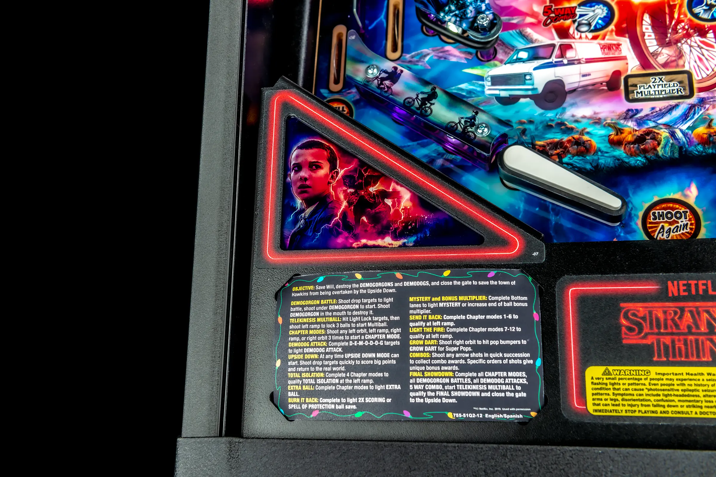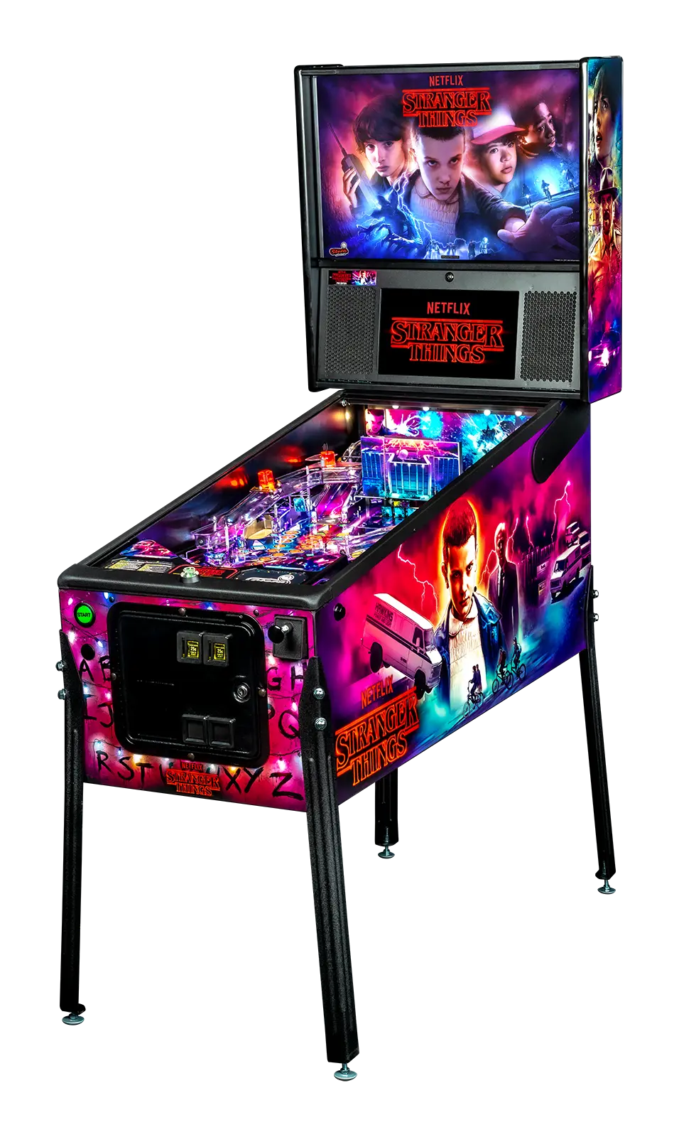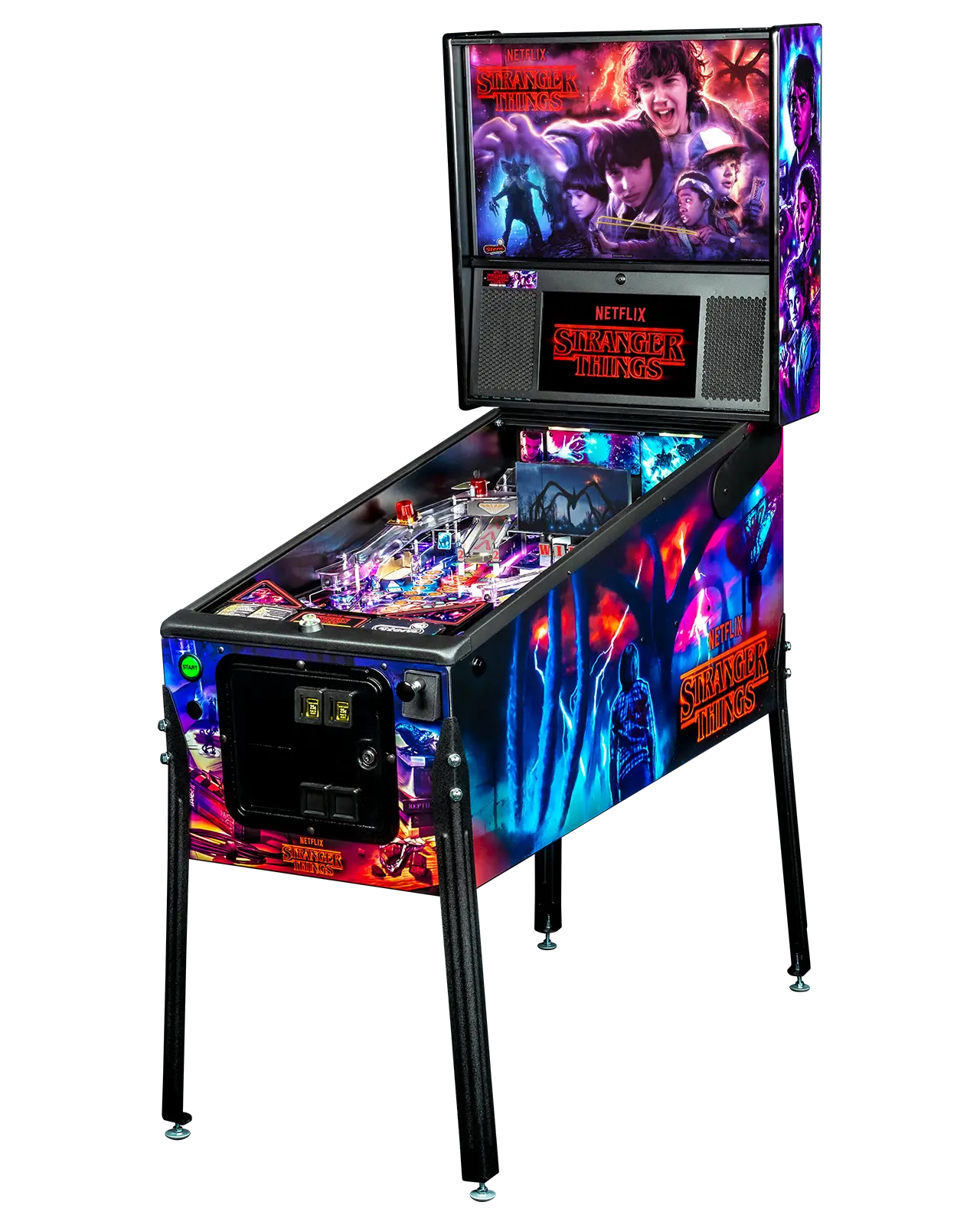 - All models feature distinct hand-drawn art in addition to the custom sculpted, interactive Demogorgon bash toy, guarded by drop targets and a rotating ramp.