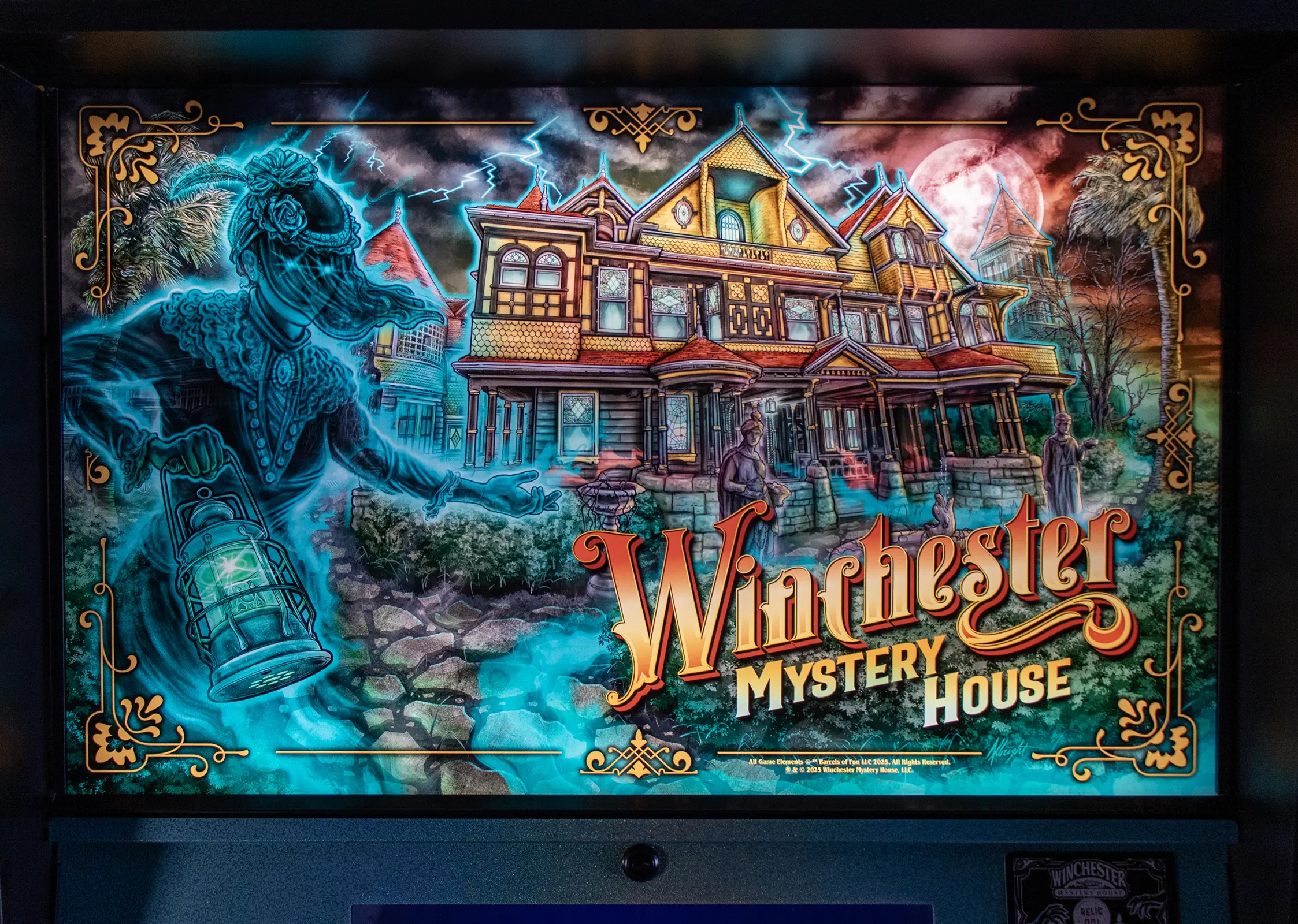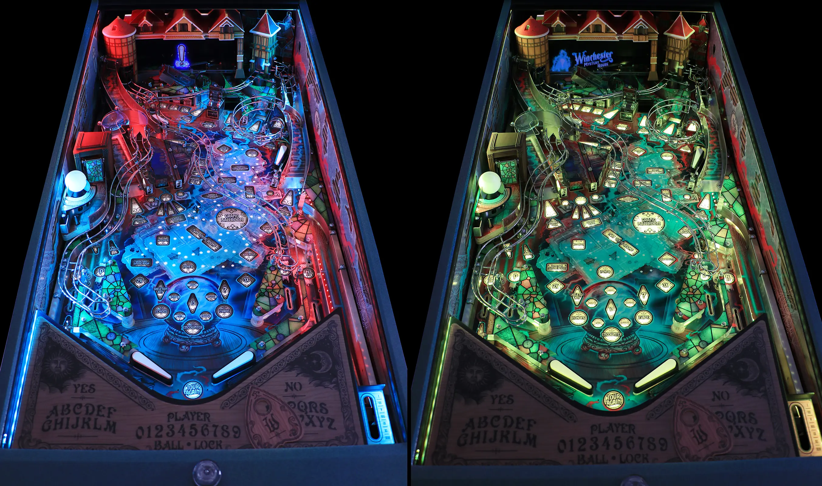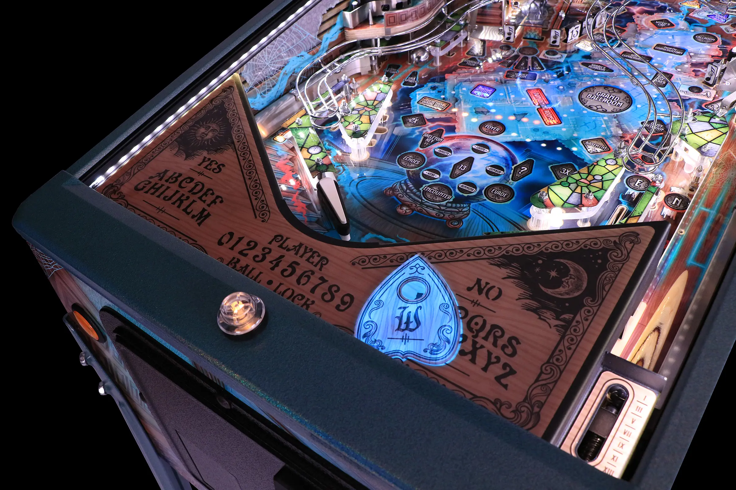 - A 12.3" LCD Pepper's Ghost display positioned under the pinball glass features ghosts that interact with the ball.