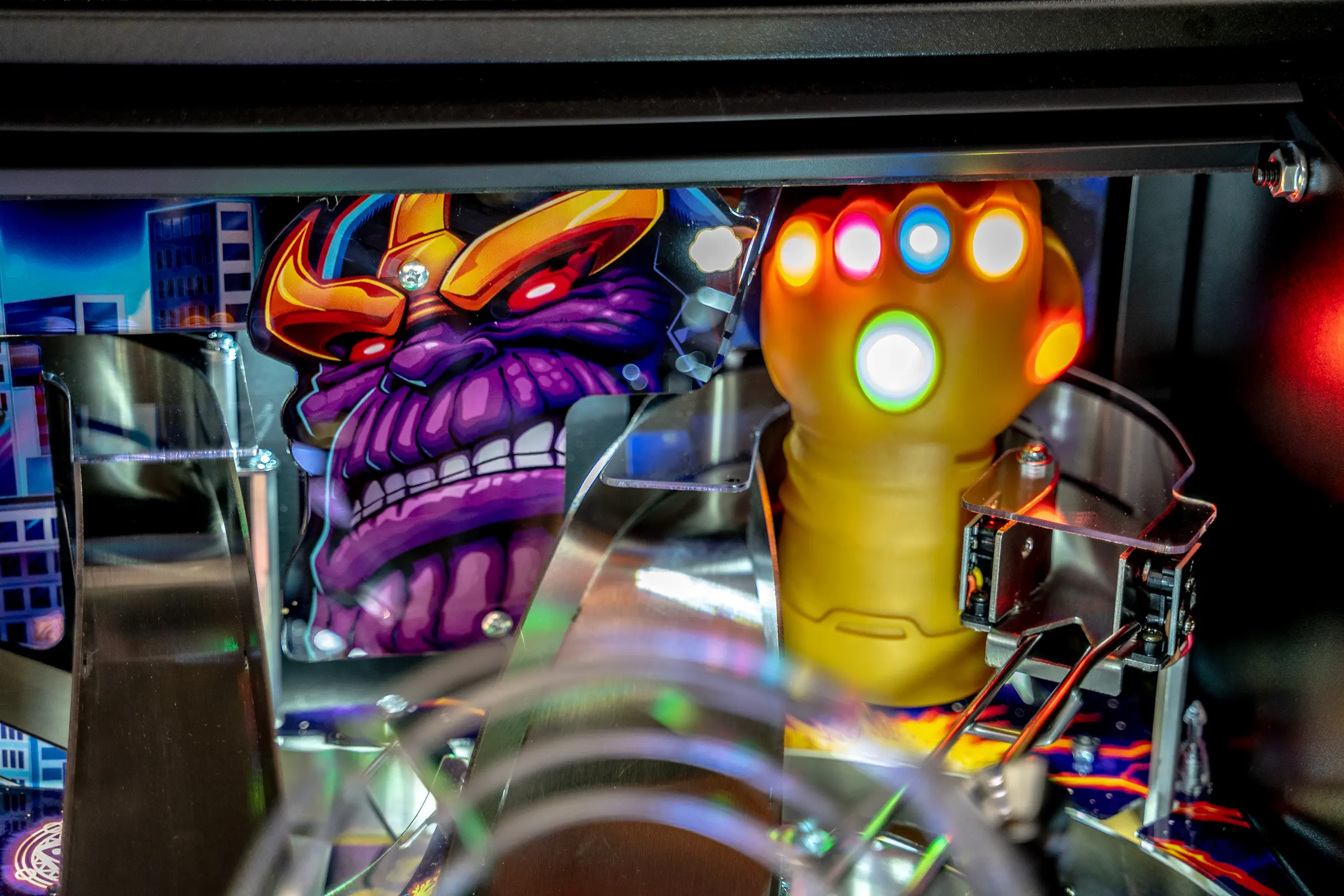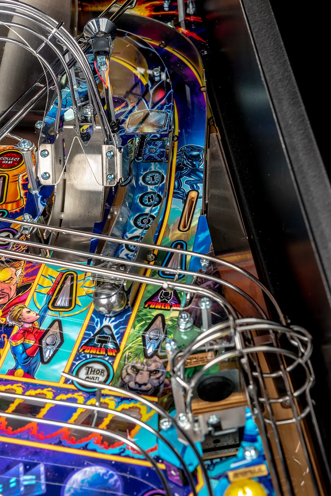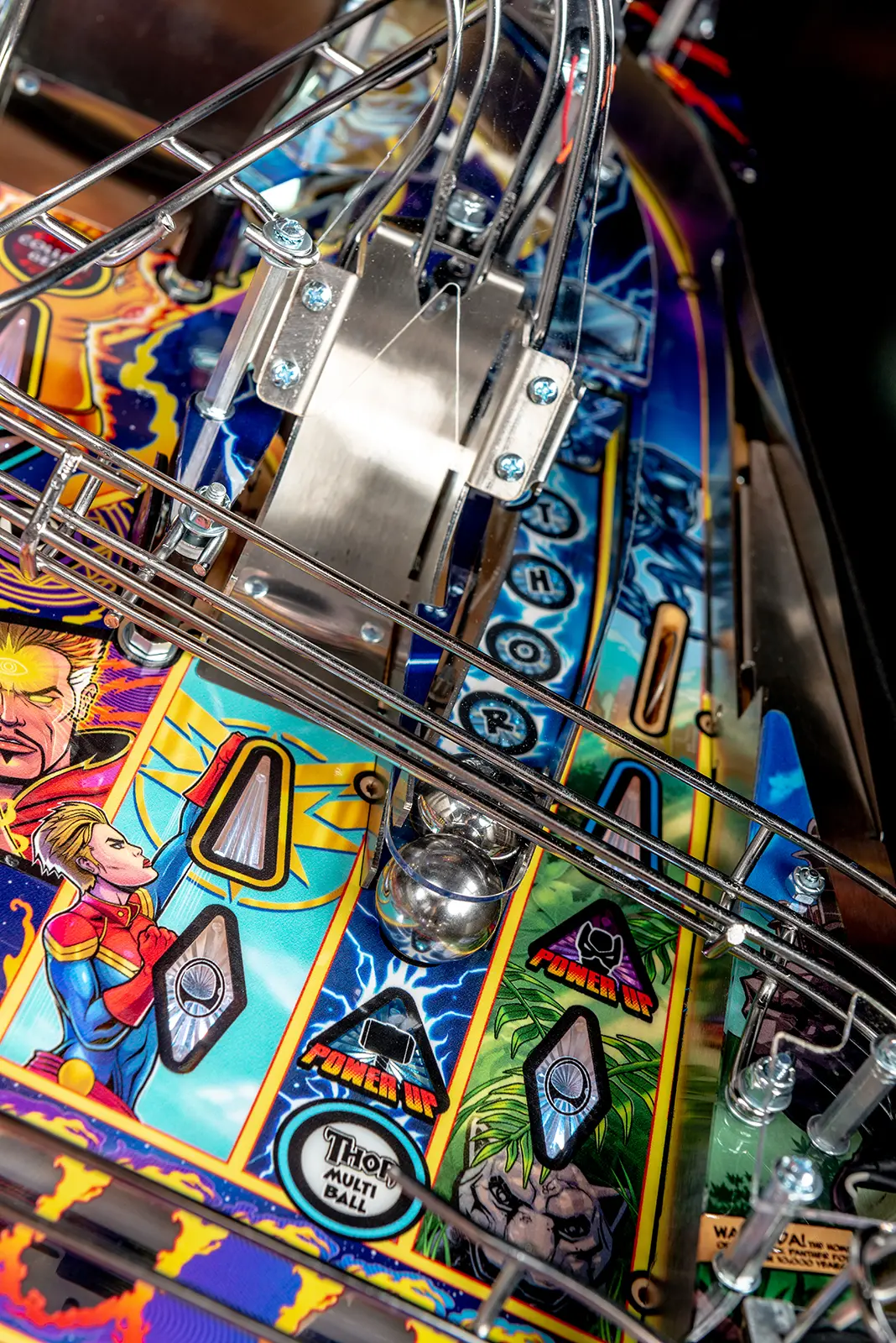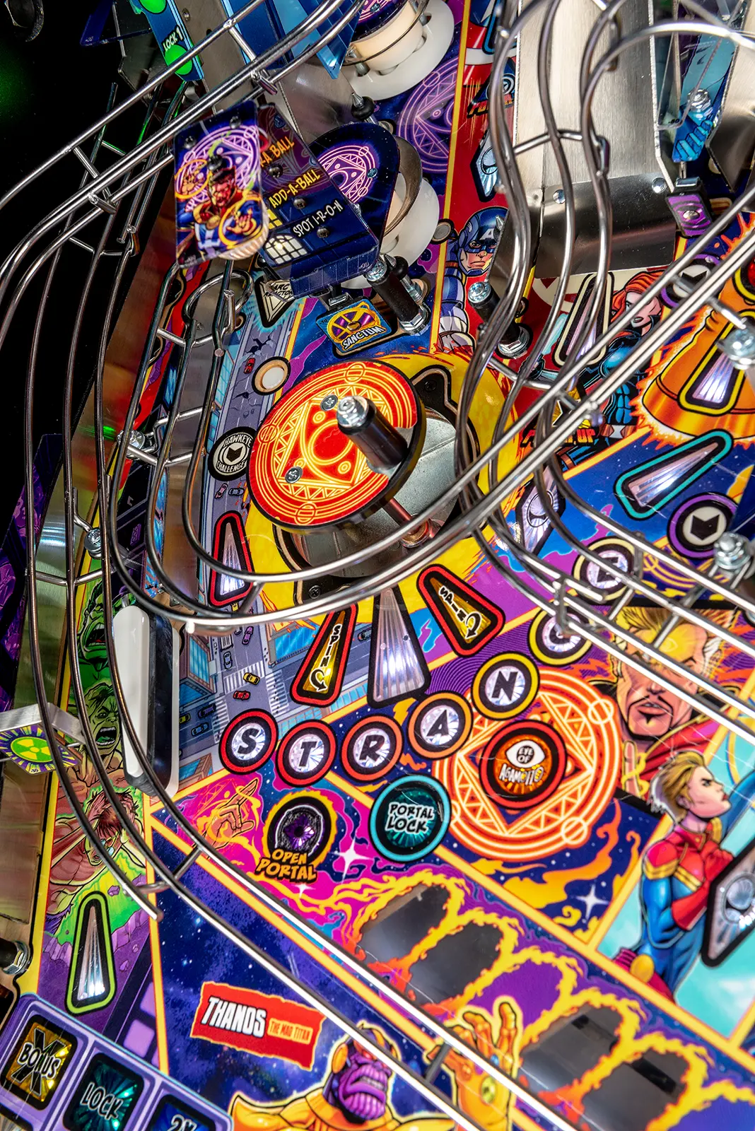 The Premium and Limited Edition models feature an interactive Dr. Strange motorized pop-up disc scoop, transporting pinballs into an underground Portal, a visible subway capable of holding and staging up to 3 balls through custom playfield windows accentuated with dynamic RGB lighting effects. These models also include a custom sculpted Thanos Infinity Gauntlet integrated with atmospheric light-up gems, a Captain Marvel inverse gravity custom wireform ramp, and a Pym Laboratories vertical up-kicker.