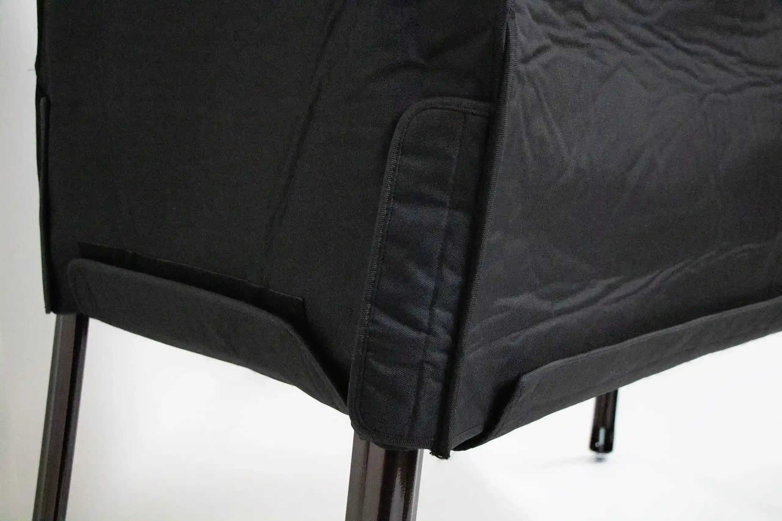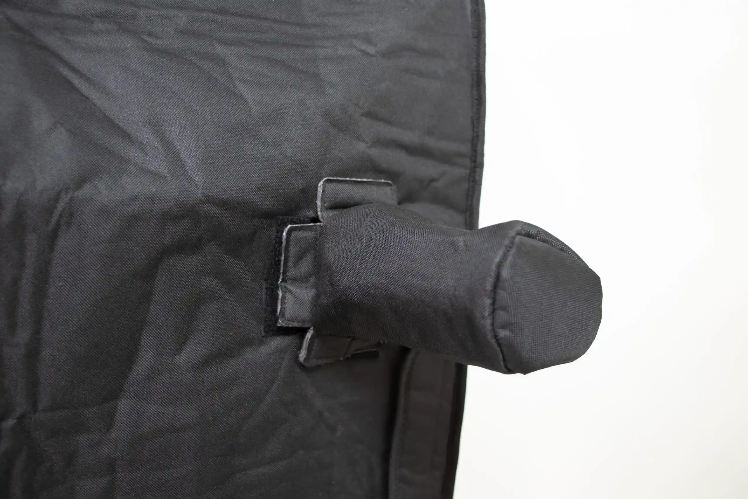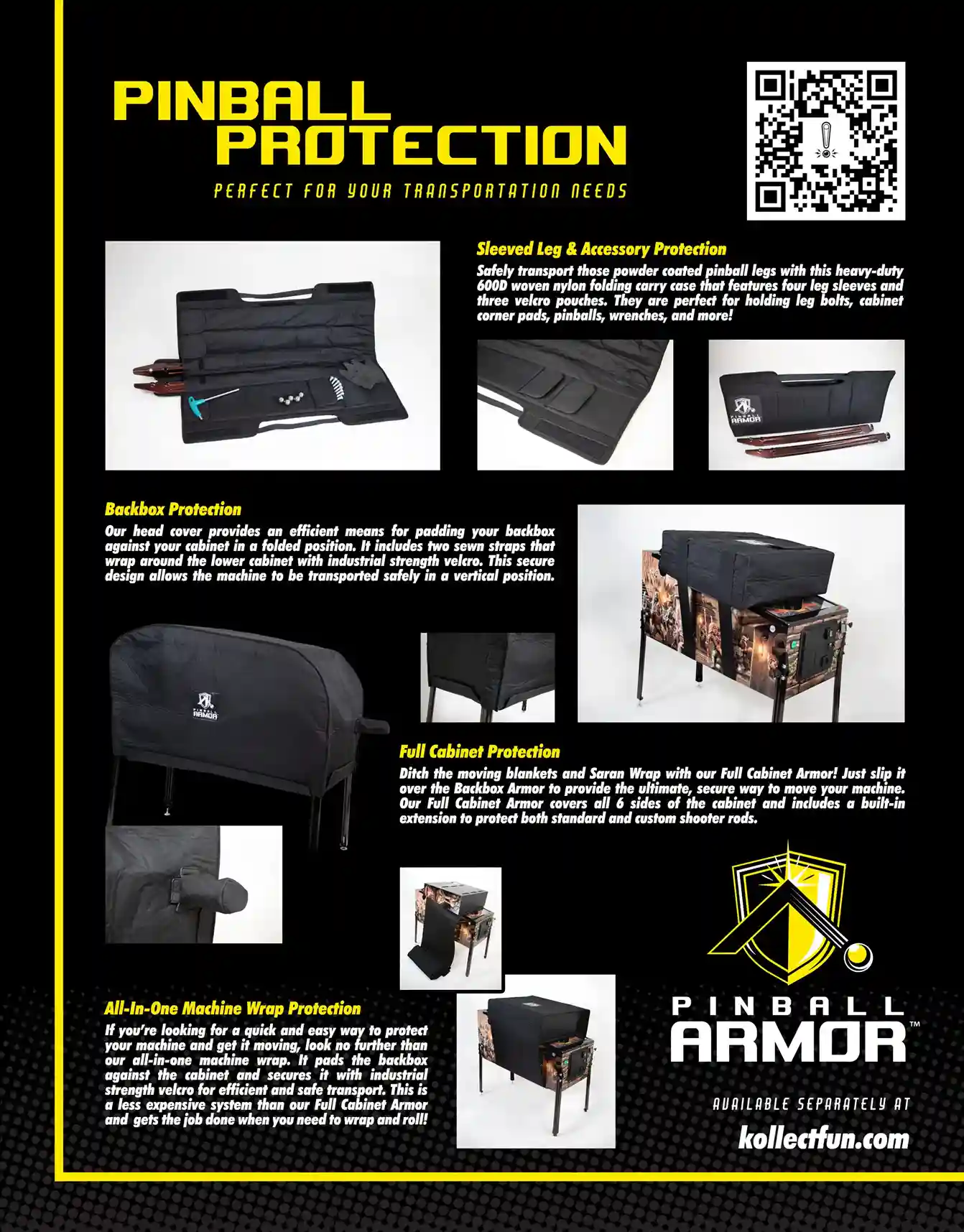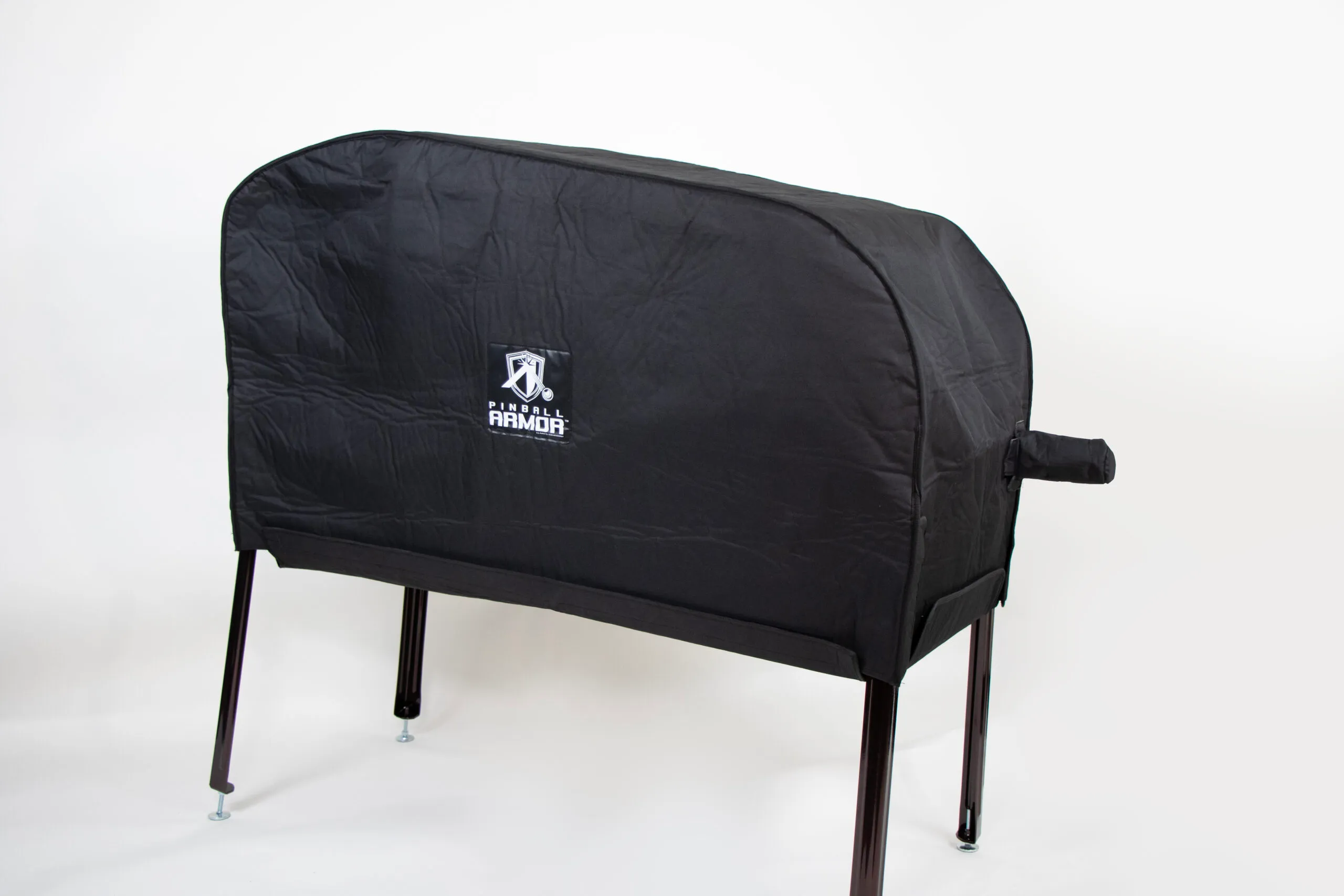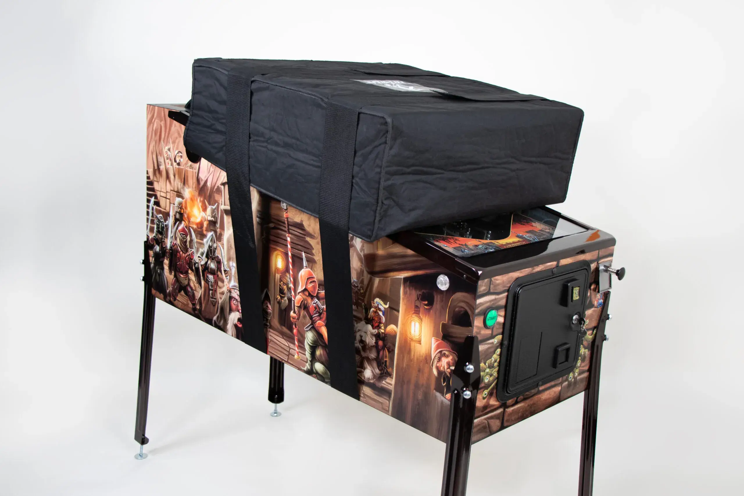 Moving your machines to a show? Shipping to another location? Your machines deserve to be armored! The set comes with the Head Cover, Full Machine Body Cover with shooter rod protection and the Leg Bag. These padded pieces are made from high grade 600D woven nylon. With a denier count of 600, this nylon fabric is known for its exceptional strength and durability. It is commonly used in the production of bags, backpacks, luggage, and other heavy-duty applications where sturdiness is essential.To cover a machine, first put the head cover over the head and fold it down. Secure the head with the straps. Secondly, put the Full Machine Body Cover over the top and secure with the velcro tabs. You are now ready to stand the machine up and remove the legs. Finally, slide your legs into the padded Leg Bag. There are even pockets for your bolts, pinballs and assembly tools!