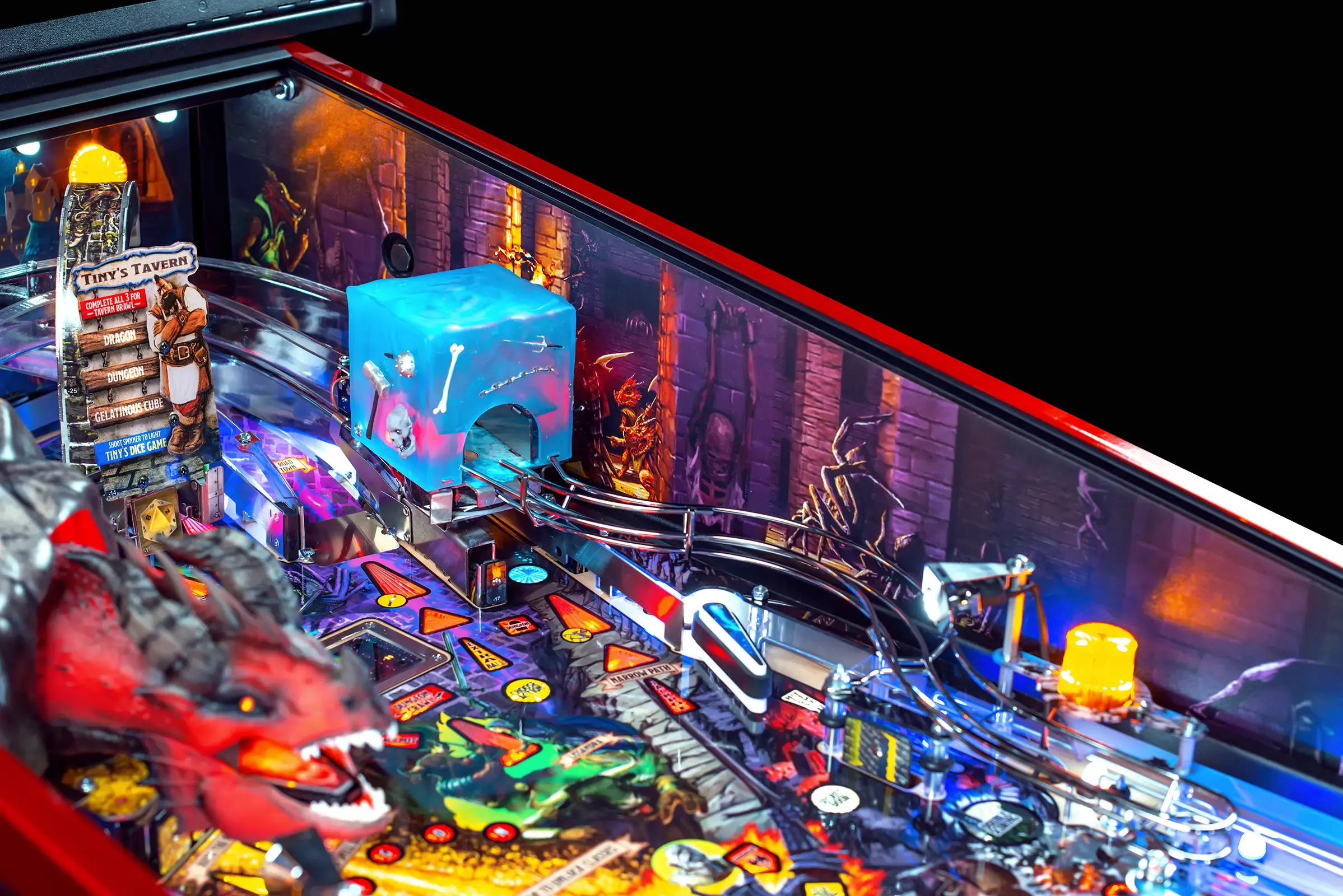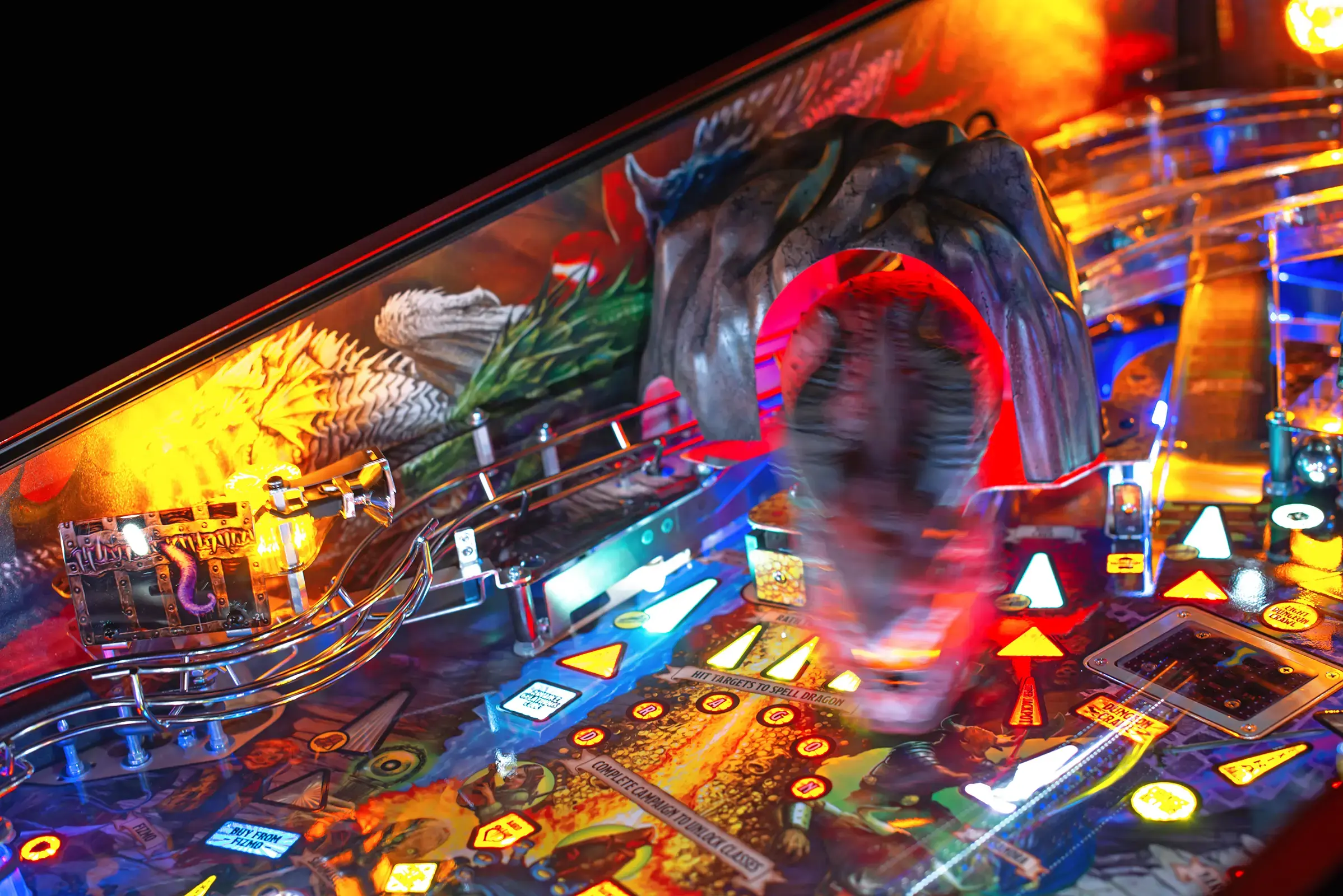 Enjoy mysterious and exciting features by navigating through hidden passageways, experience an electromagnet-powered gelatinous cube that freezes the pinball, and explore dynamic dungeon levels that are accessed through a disappearing playfield trap door. Other features include Fizmo’s store that allows players to acquire unique items, a treasure chest that unleashes mimic monsters, and more secrets to uncover.