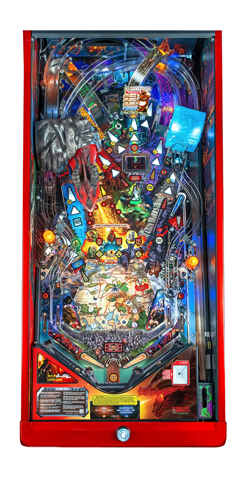 To honor the original release of DUNGEONS & DRAGONS (D&D) from 1974, the Limited Edition model will be limited to 740 games globally. This highly collectible model includes the Speaker Expression Lighting System with D&D-themed game effects, a full-color Dragon-inspired mirrored backglass, full-color reflective foil Tiamat and Xanathar high-definition cabinet decals with hand-drawn artwork by Vincent Proce, exclusive custom D&D “Dragon Red” powder-coated pinball armor, a custom designer-autographed bottom arch, upgraded audio system, anti-reflection pinball playfield glass, shaker motor, a sequentially numbered plaque, a signed Certificate of Authenticity, and a digital Insider Connected LE owner’s badge on registration.