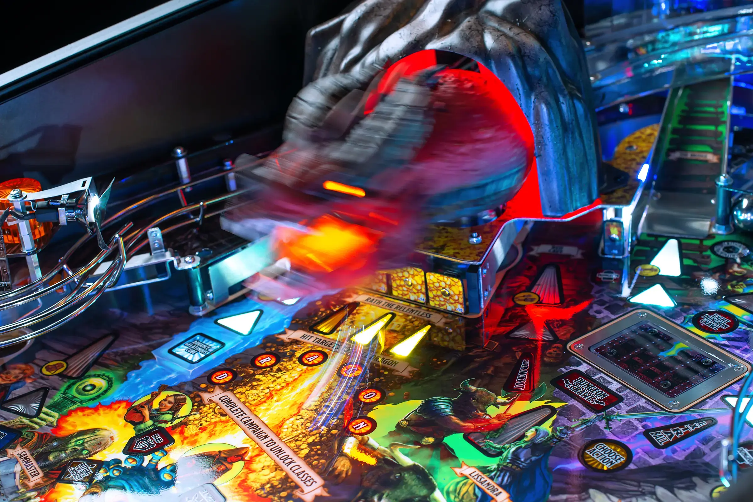 Battle Rath the Relentless, the red dragon, the most advanced animatronic mech in pinball, intelligently reacts to player action with multi-axis motion and features omnidirectional impact sensing technology. Voiced by the iconic Michael Dorn, players will attempt to defeat Rath the Relentless with pinballs and by hitting the 3-bank target, steal its treasure. When Rath the Relentless breathes his magnificent fire, multiple pinballs shoot from its mouth but be prepared. Players can activate a metal shield between the flippers to not only defend against attacks but also assist with playfield shots.