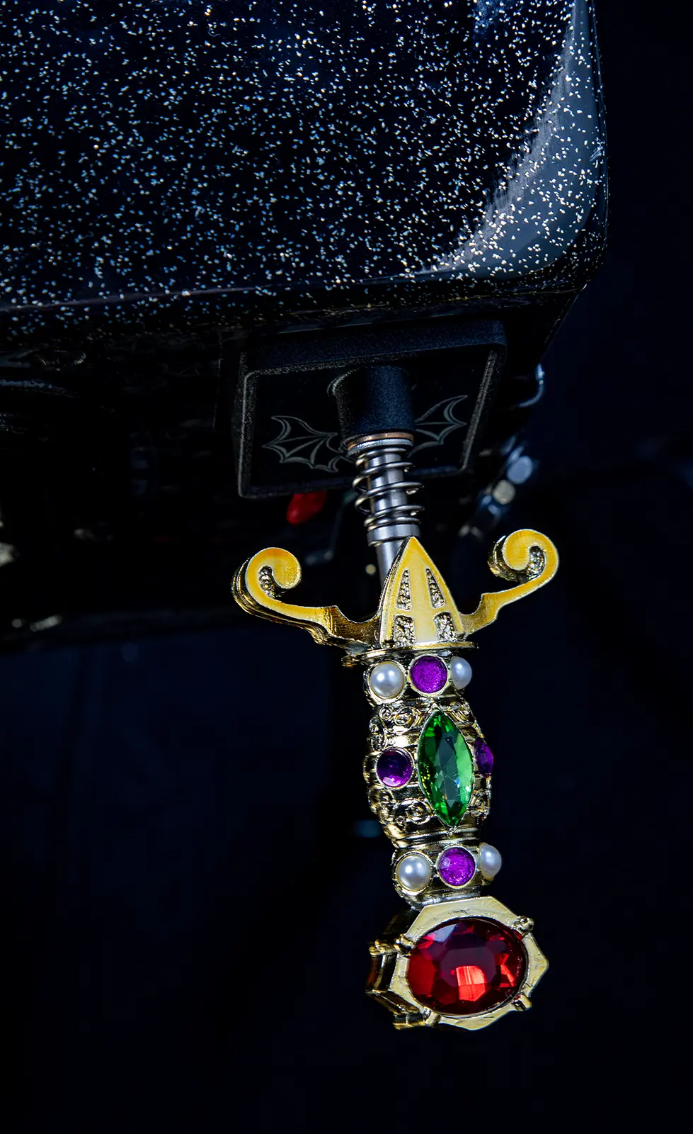 - Beautifully trimmed with Elvira’s favorite color armor – Deadly Nightshade Black Sparkle!