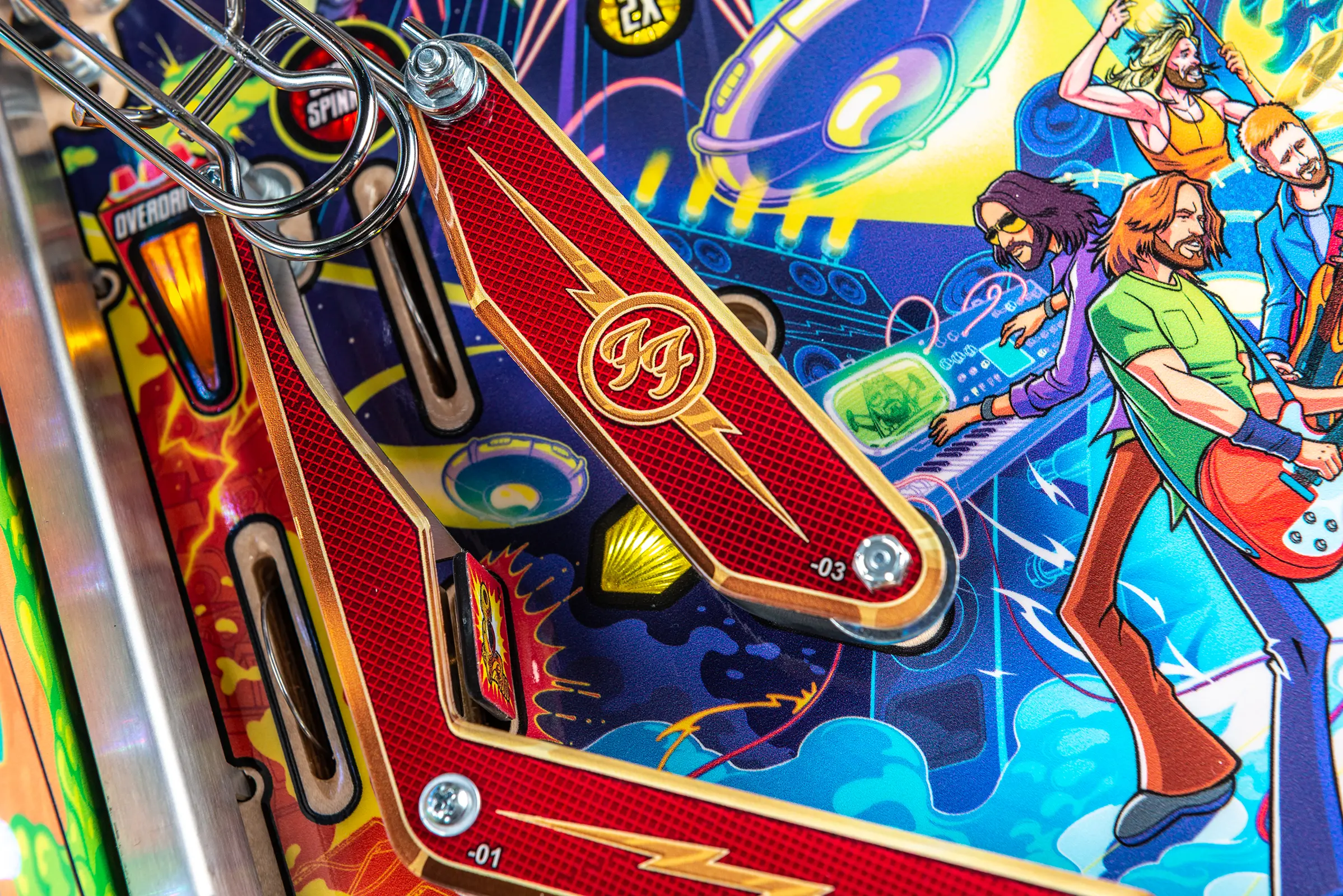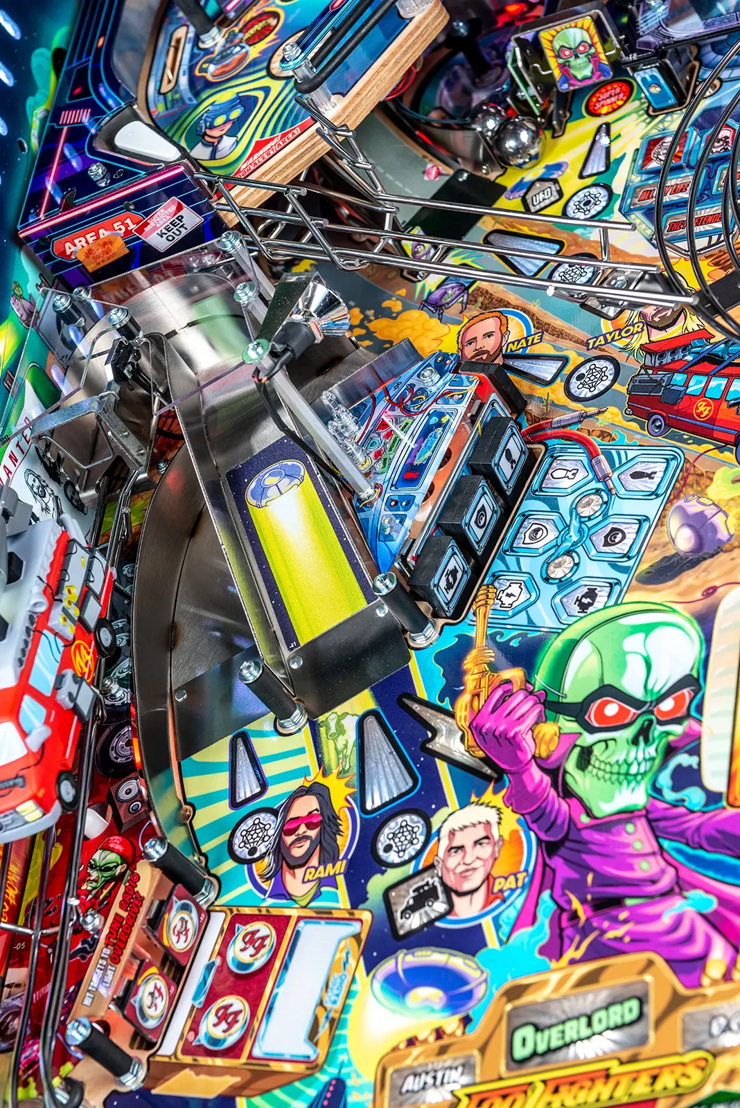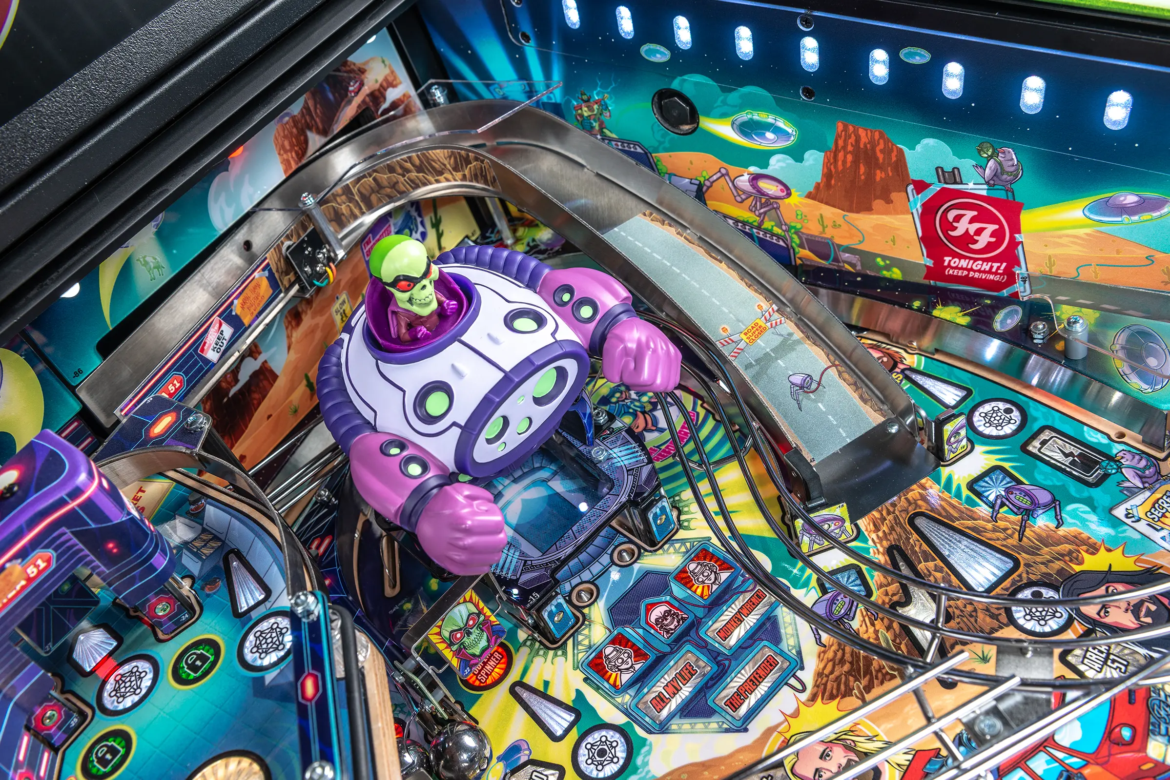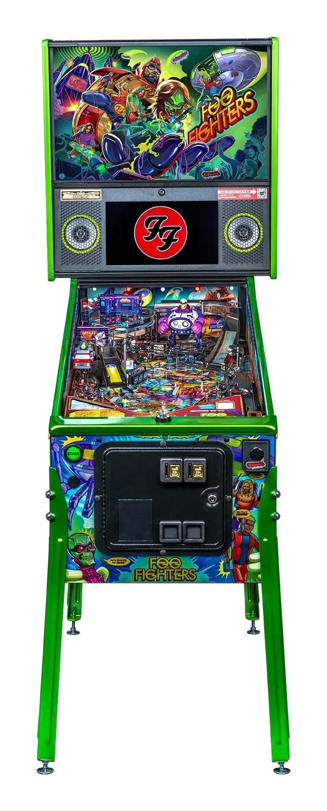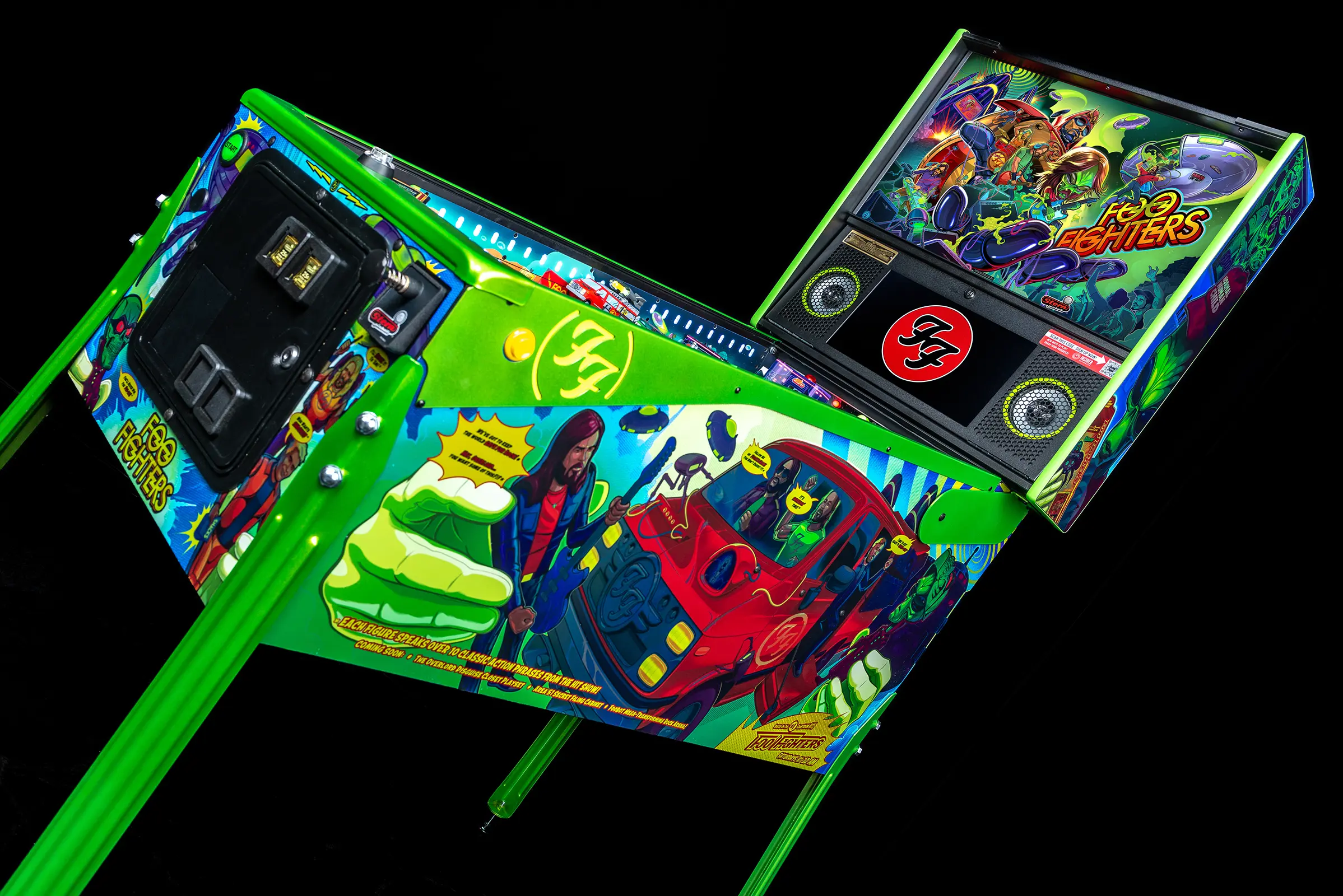 More than two years in the making and with creative input from the band’s own Dave Grohl, Nate Mendel, Pat Smear, Chris Shiflett, Rami Jaffee, and the late, great Taylor Hawkins, Stern’s Foo Fighters is a top-shelf pinball machine—and so much more. An entire new universe has been developed with jaw-dropping hand-drawn artwork and custom animations including “Foo Fighters Saturday Morning Action Time!”—a fictional TV series chronicling the band’s quest to save rock and roll… AND THE WORLD! Join Foo Fighters on this rescue mission to thwart the evil, mysterious alien Overlord and his army of bots. Search the Area 51 upper playfield to break into and unleash pinball chaos. Jump in the van for a righteous tour of duty to save humanity from extinction and let rock rule!