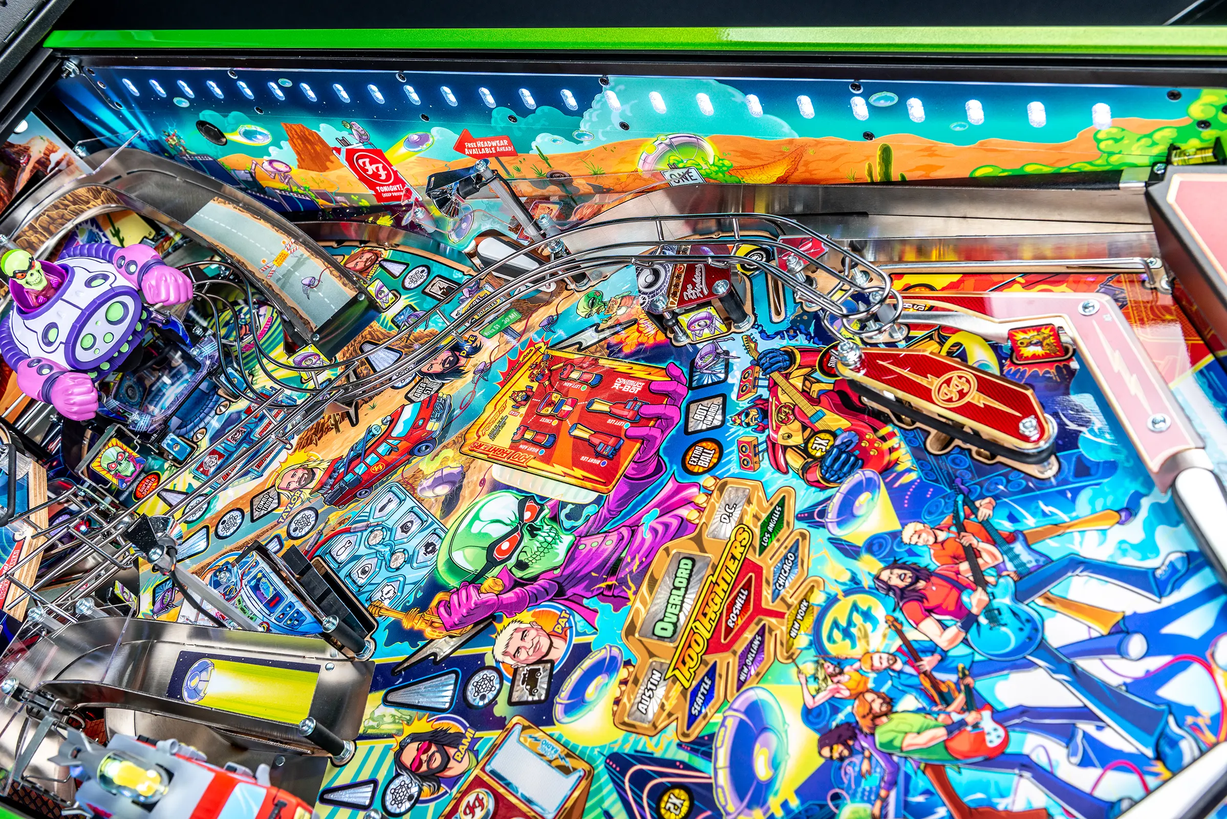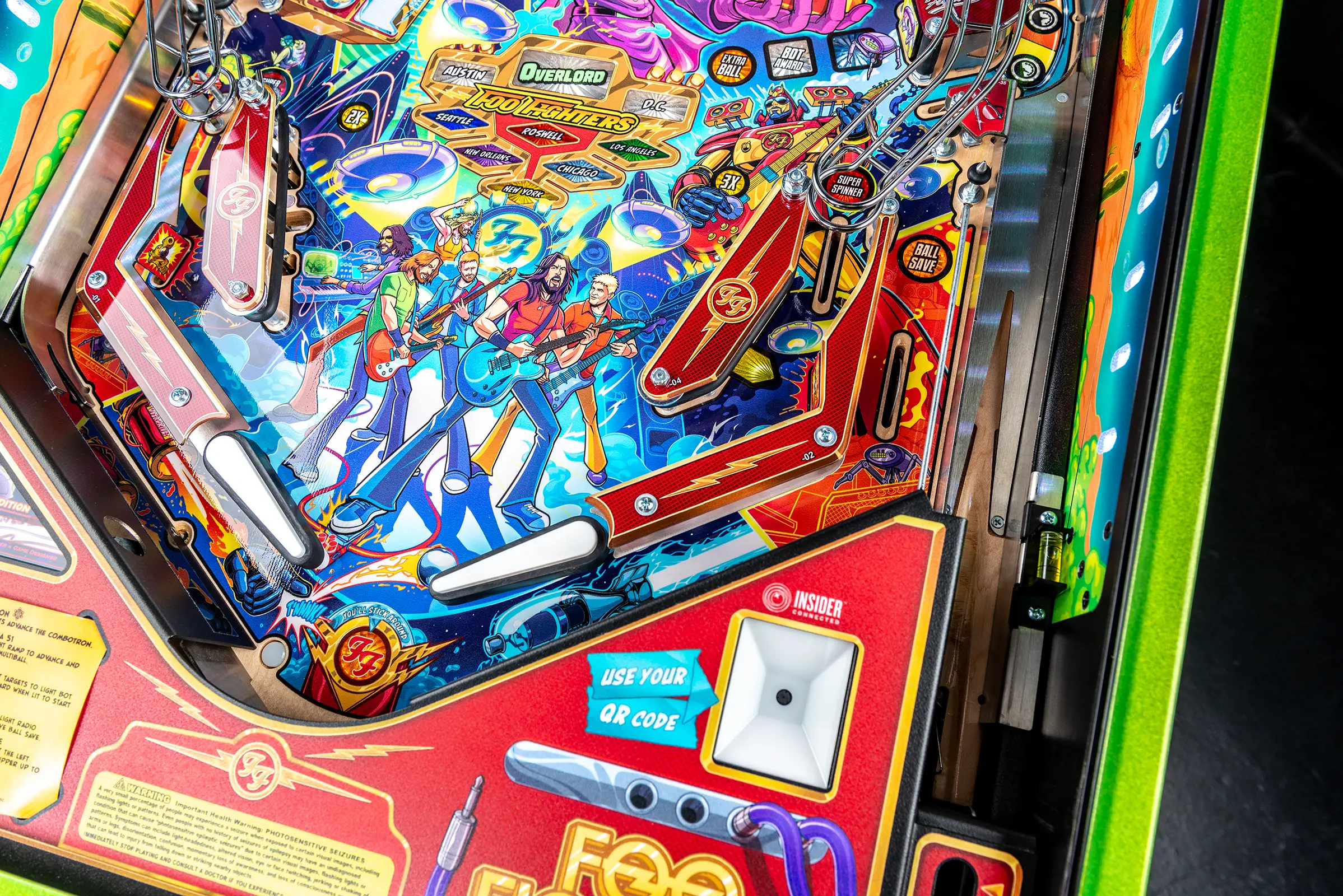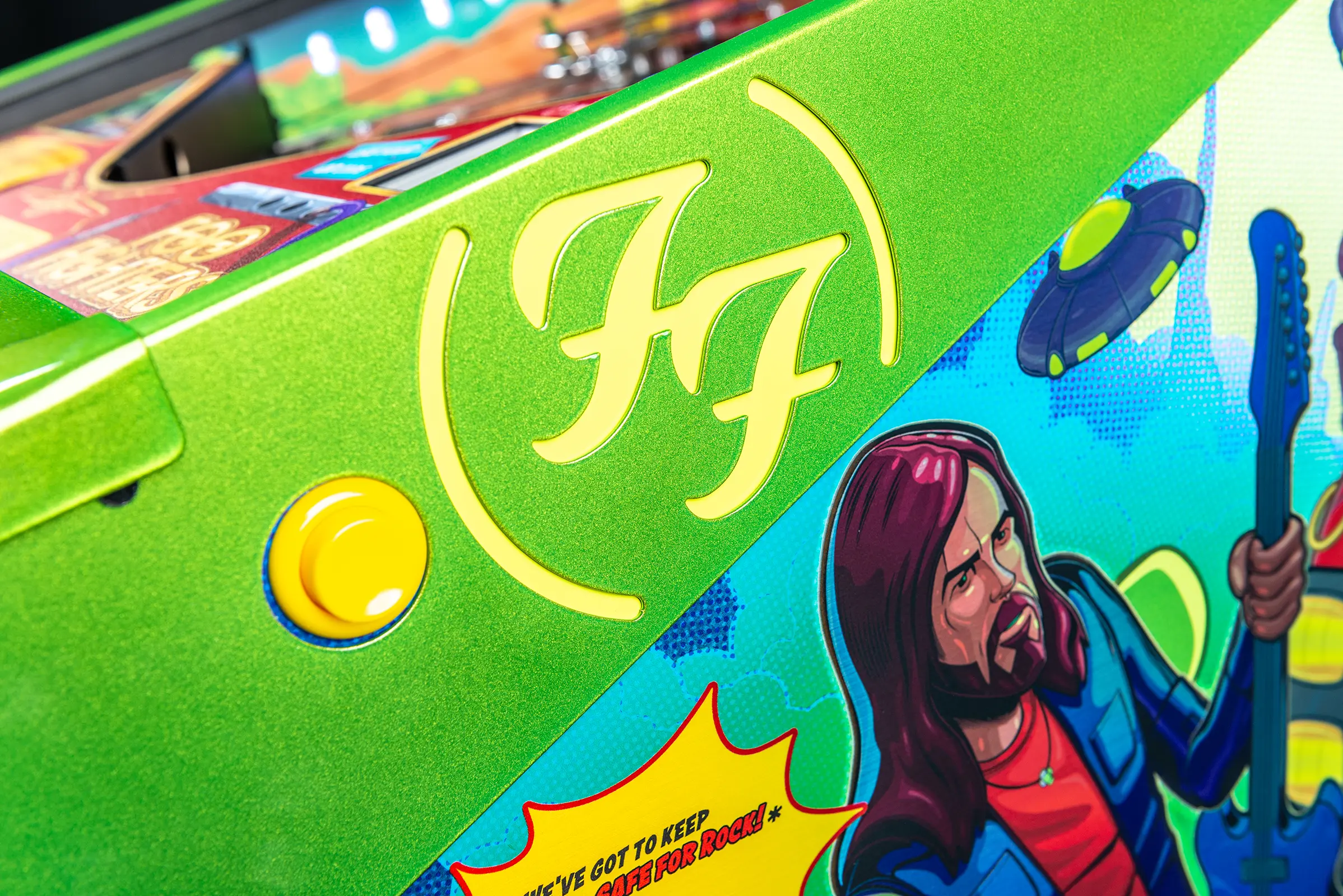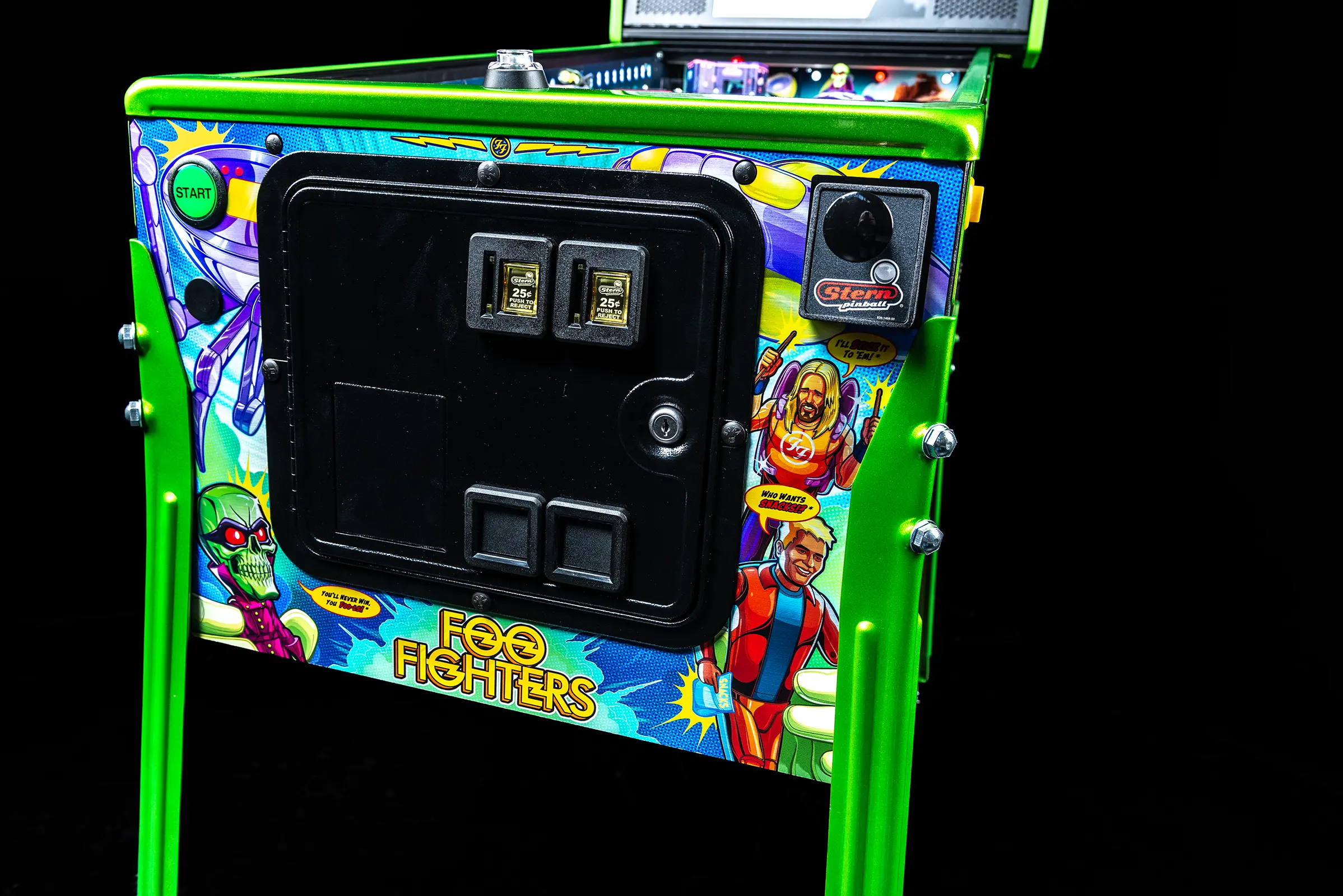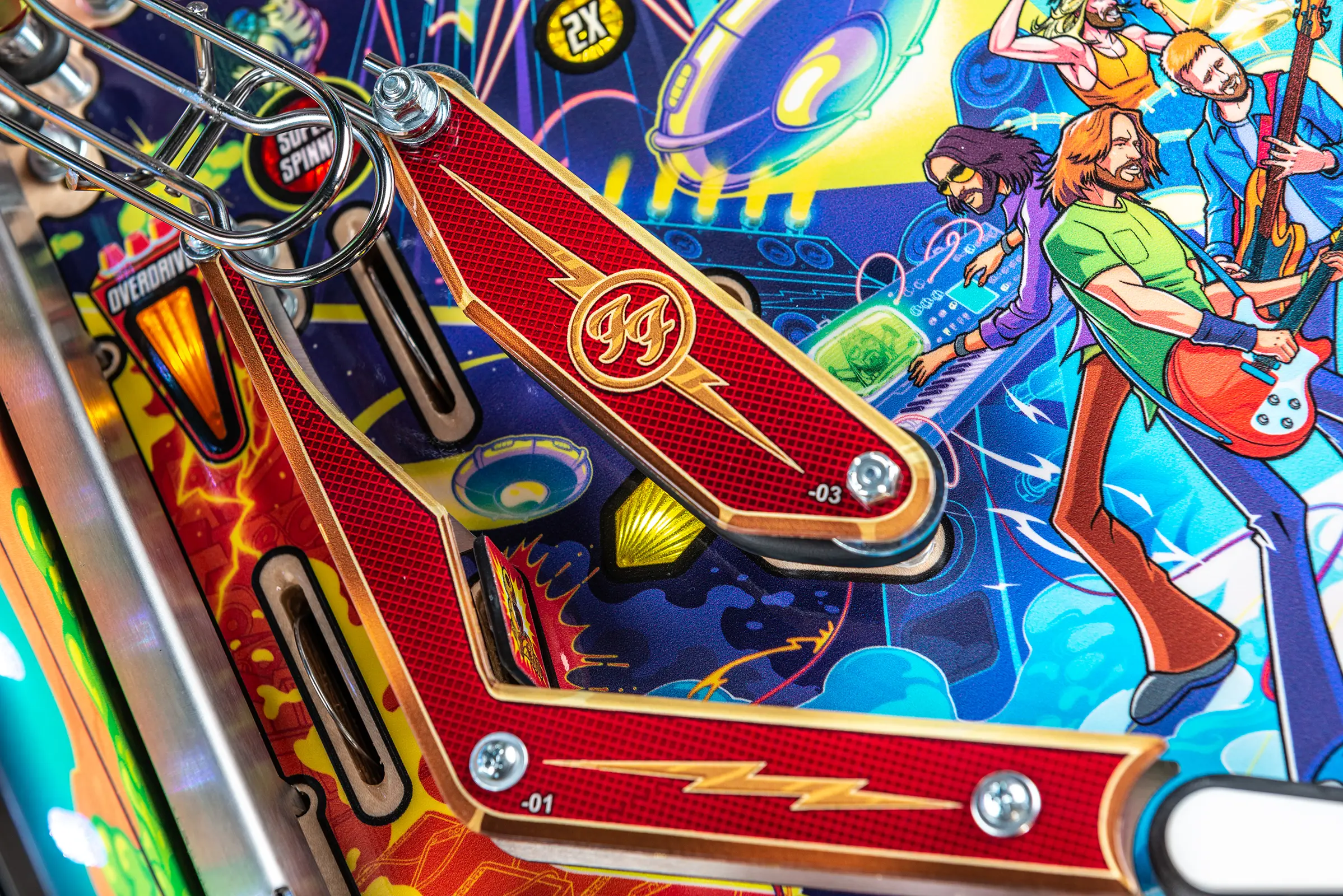 More than two years in the making and with creative input from the band’s own Dave Grohl, Nate Mendel, Pat Smear, Chris Shiflett, Rami Jaffee, and the late, great Taylor Hawkins, Stern’s Foo Fighters is a top-shelf pinball machine—and so much more. An entire new universe has been developed with jaw-dropping hand-drawn artwork and custom animations including “Foo Fighters Saturday Morning Action Time!”—a fictional TV series chronicling the band’s quest to save rock and roll… AND THE WORLD! Join Foo Fighters on this rescue mission to thwart the evil, mysterious alien Overlord and his army of bots. Search the Area 51 upper playfield to break into and unleash pinball chaos. Jump in the van for a righteous tour of duty to save humanity from extinction and let rock rule!