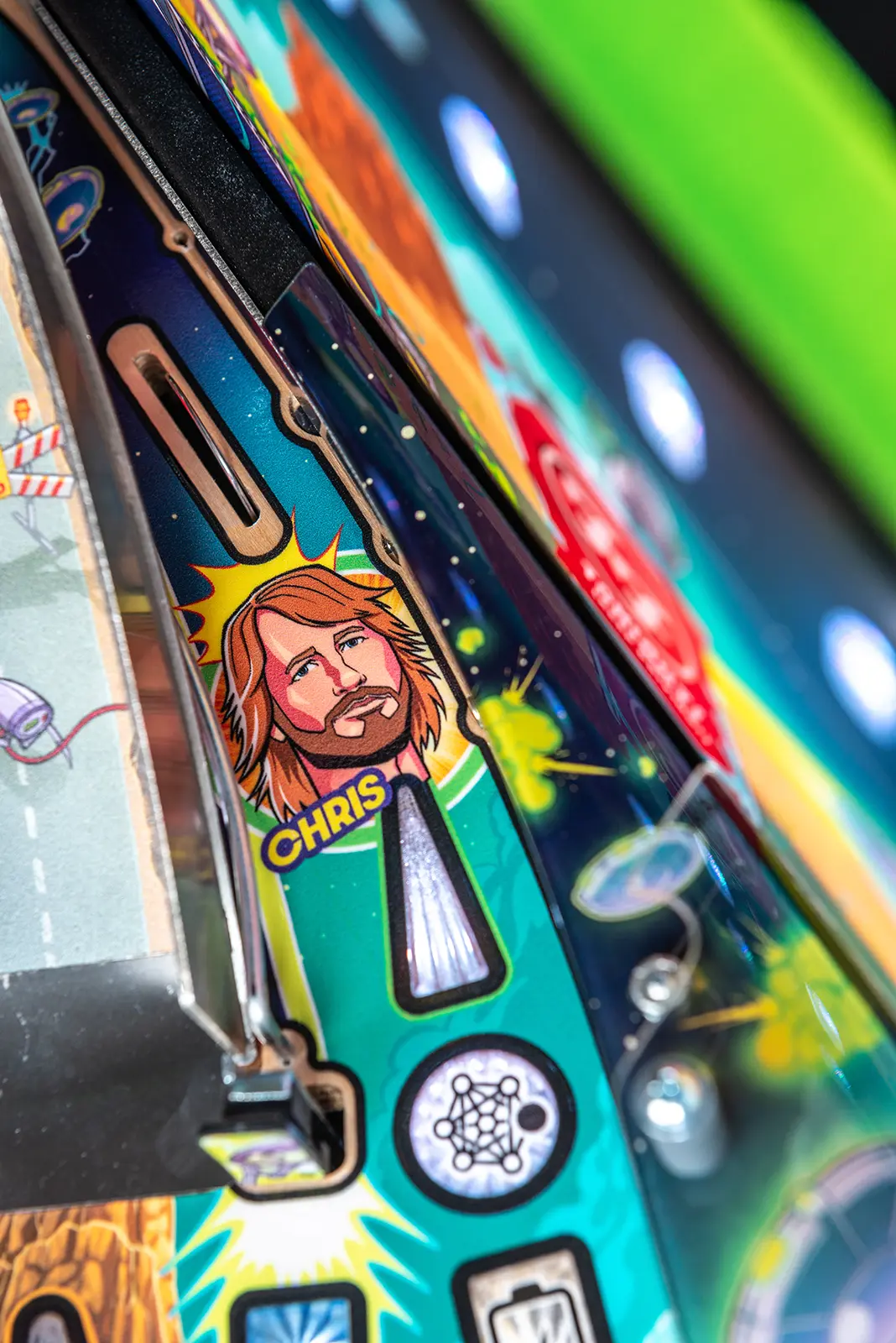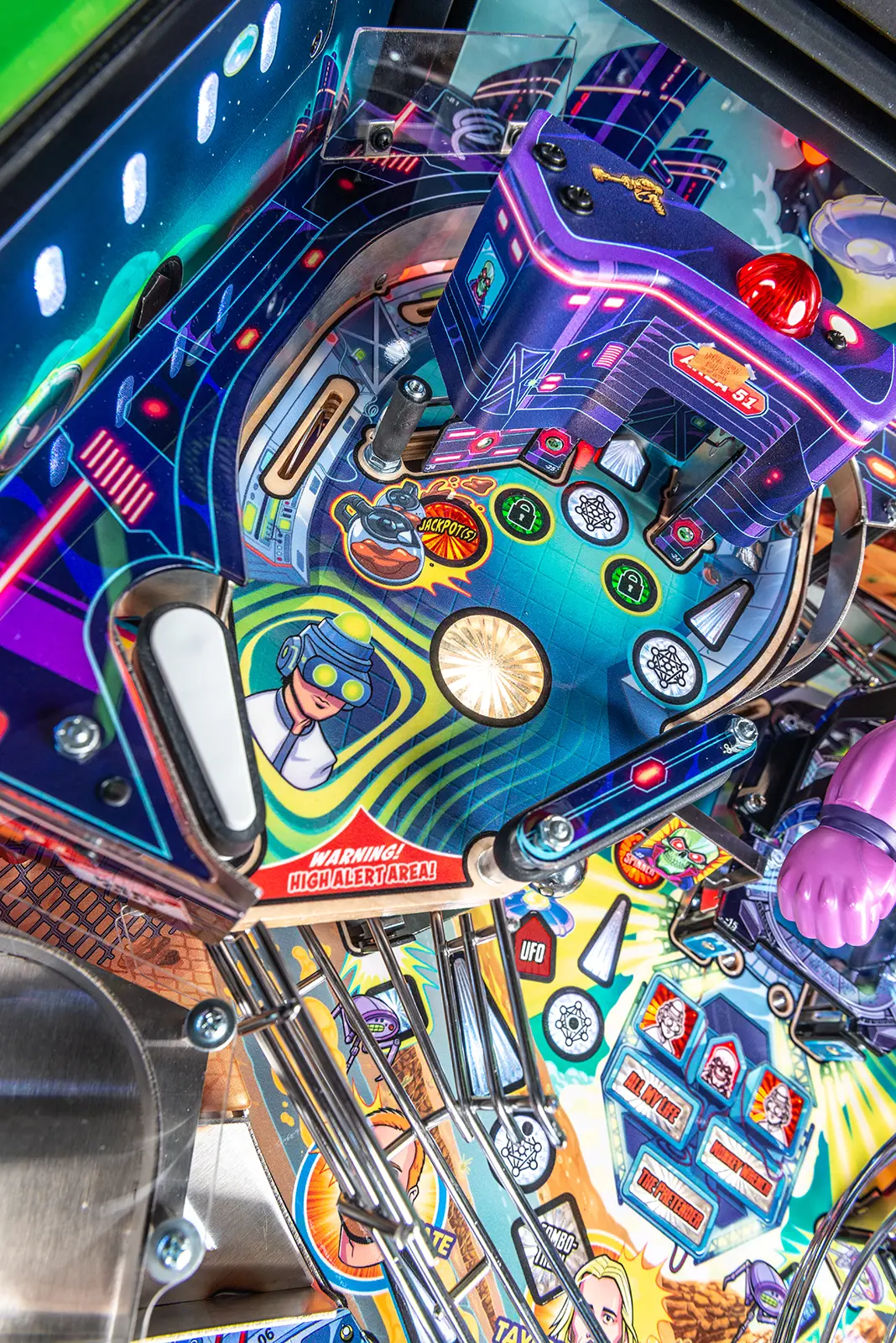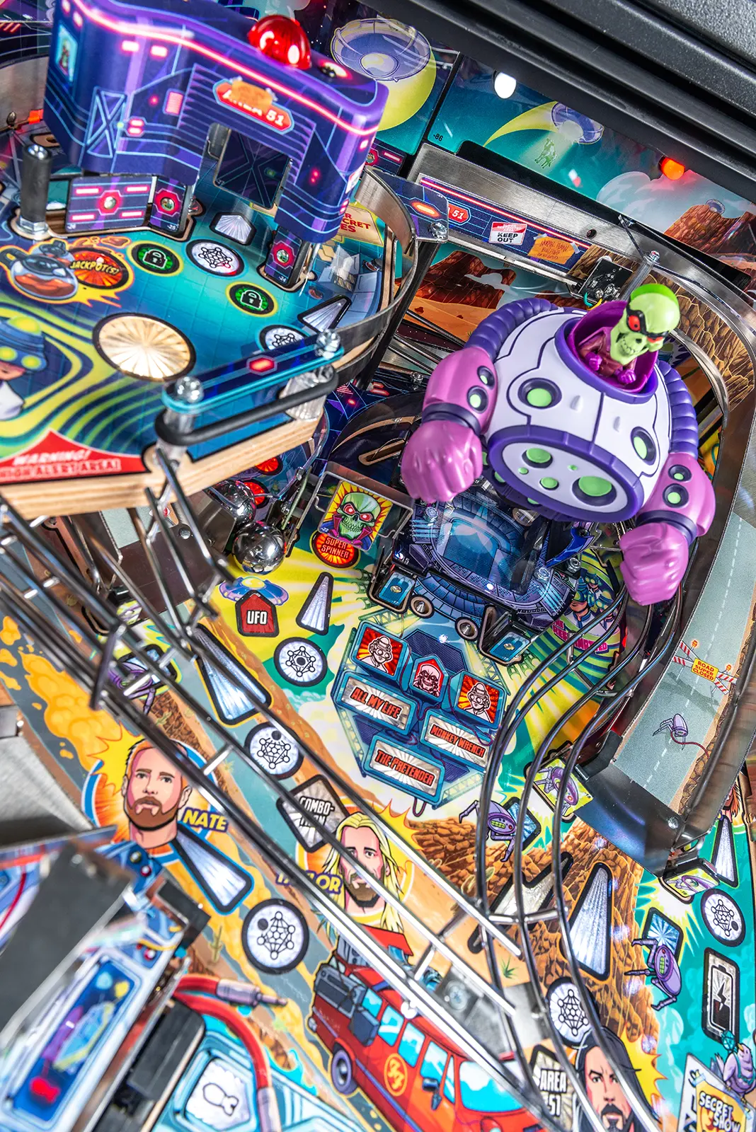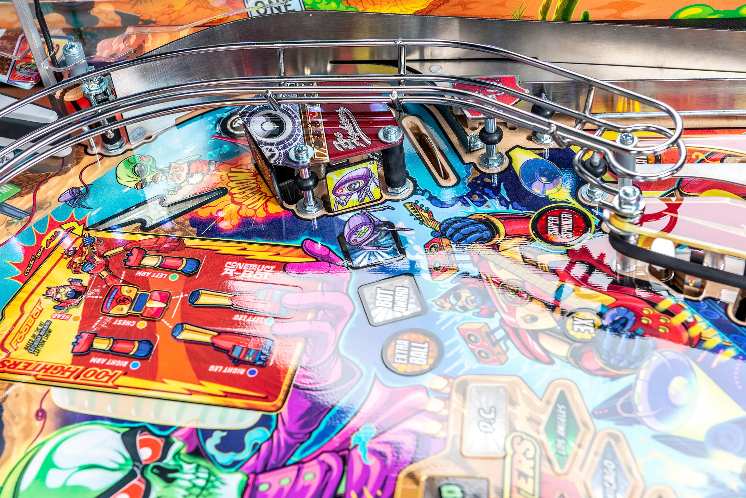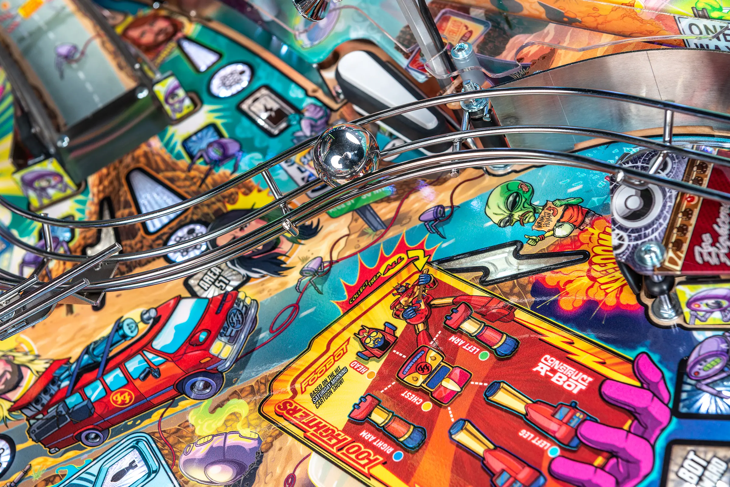 More than two years in the making and with creative input from the band’s own Dave Grohl, Nate Mendel, Pat Smear, Chris Shiflett, Rami Jaffee, and the late, great Taylor Hawkins, Stern’s Foo Fighters is a top-shelf pinball machine—and so much more. An entire new universe has been developed with jaw-dropping hand-drawn artwork and custom animations including “Foo Fighters Saturday Morning Action Time!”—a fictional TV series chronicling the band’s quest to save rock and roll… AND THE WORLD! Join Foo Fighters on this rescue mission to thwart the evil, mysterious alien Overlord and his army of bots. Search the Area 51 upper playfield to break into and unleash pinball chaos. Jump in the van for a righteous tour of duty to save humanity from extinction and let rock rule!