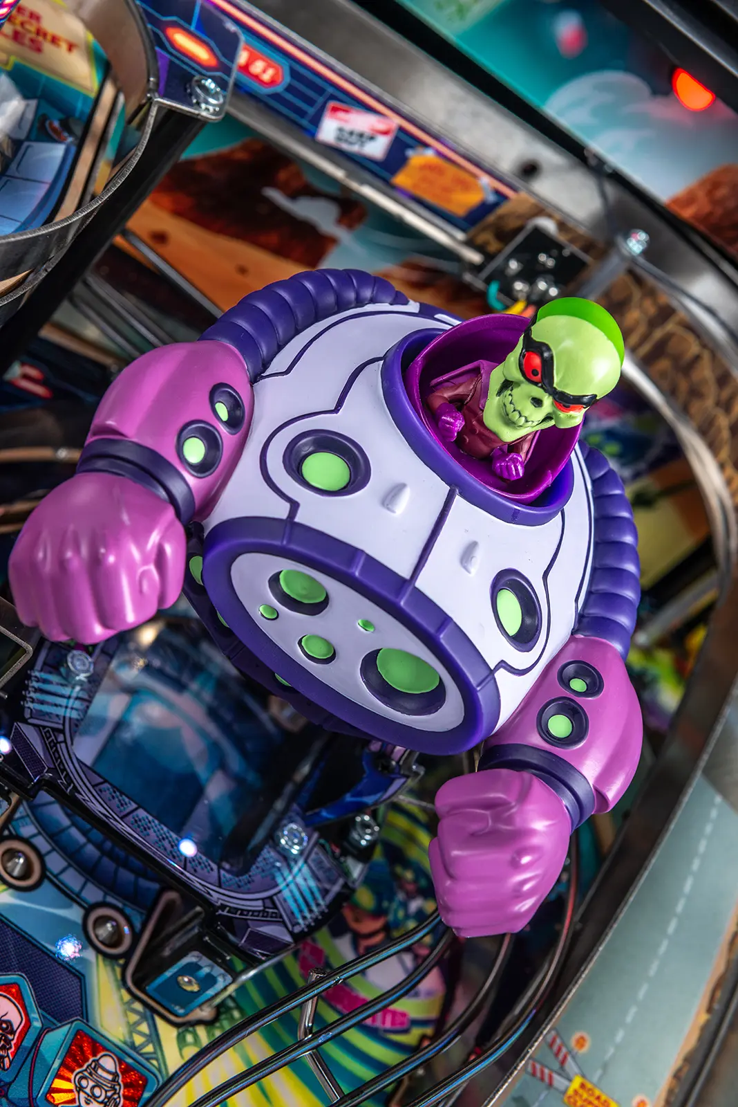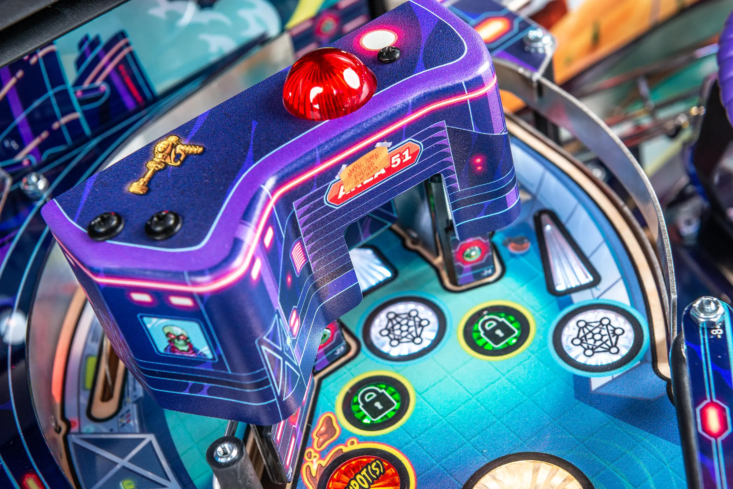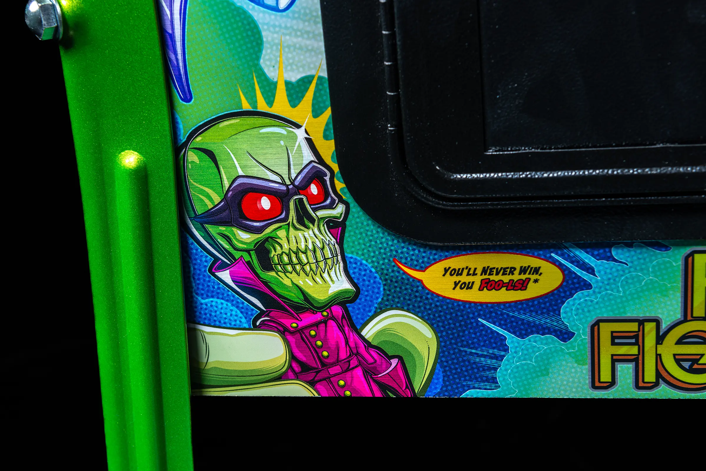 - Custom high gloss "Overlord Green" powder-coated pinball armor, legs, hinges and action button front molding.