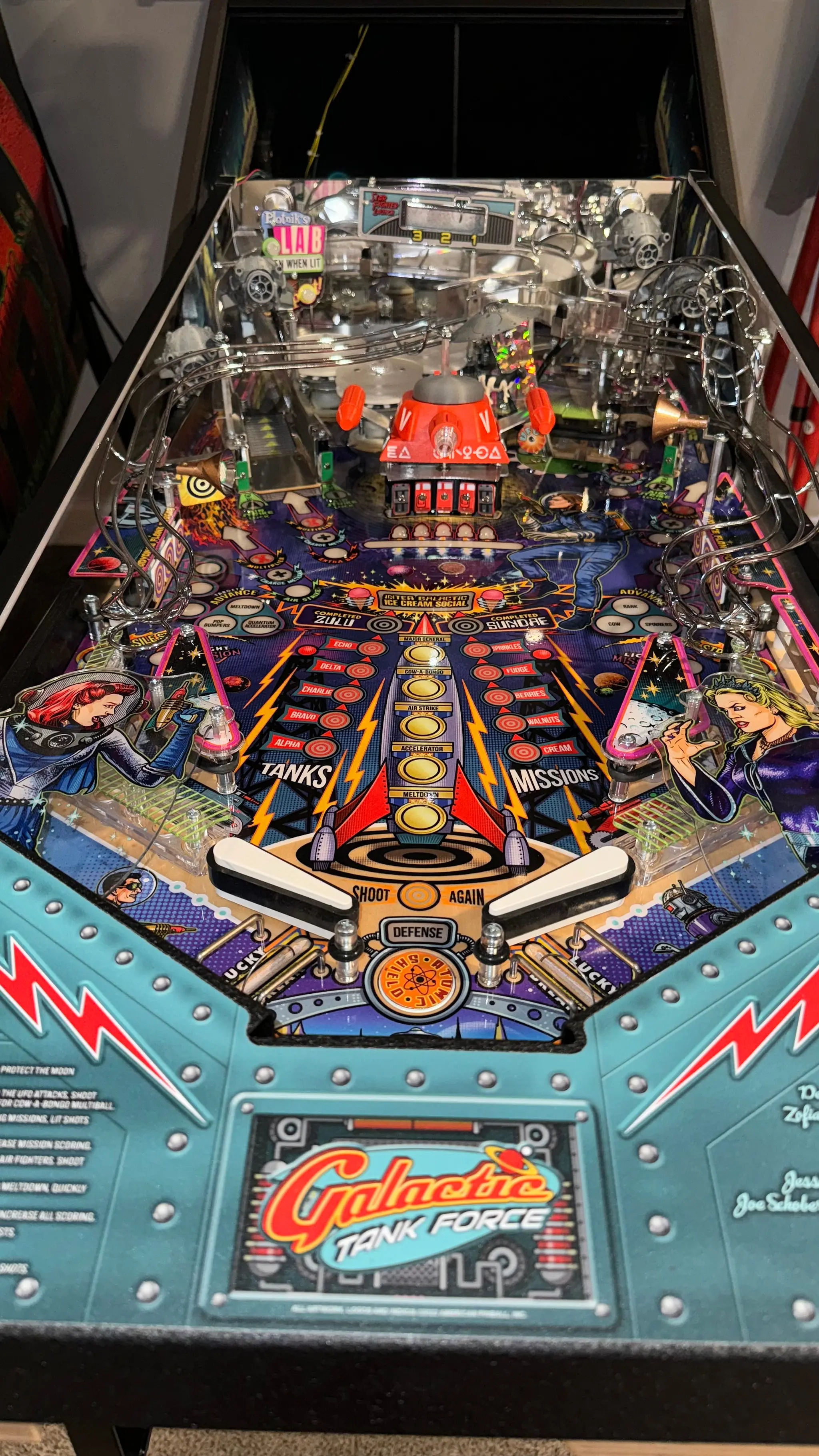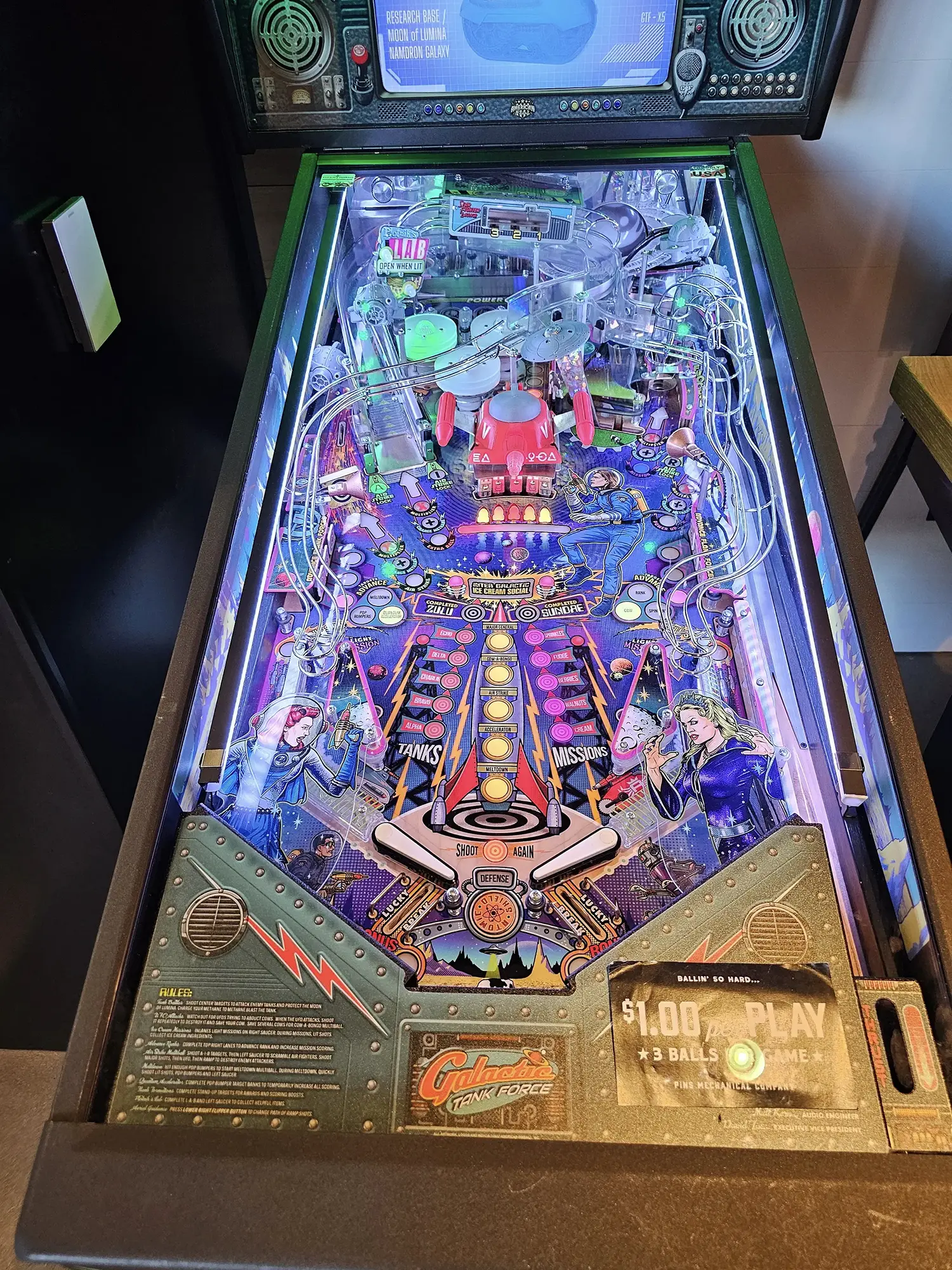 Experience the next level of pinball entertainment with Galactic Tank Force! This revolutionary game takes the industry by storm with its groundbreaking live-action performances from four talented actors: Kerri Hoskins, Jeff Hoover, Mitchell Politt, and Clementine Morfoot. Witness the characters come to life on the machine's display, adding a whole new level of immersion to your gameplay experience. As an American Pinball original theme, we have the freedom to create our own characters and story, making Galactic Tank Force a truly one-of-a-kind adventure. Get ready to dive into the action and enjoy an unforgettable pinball experience like no other!