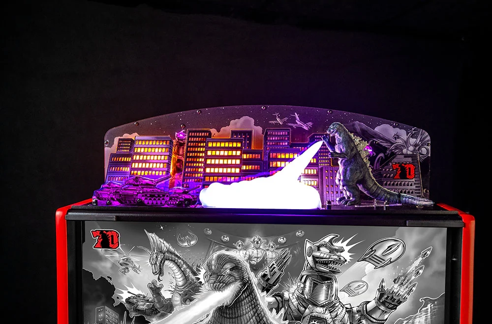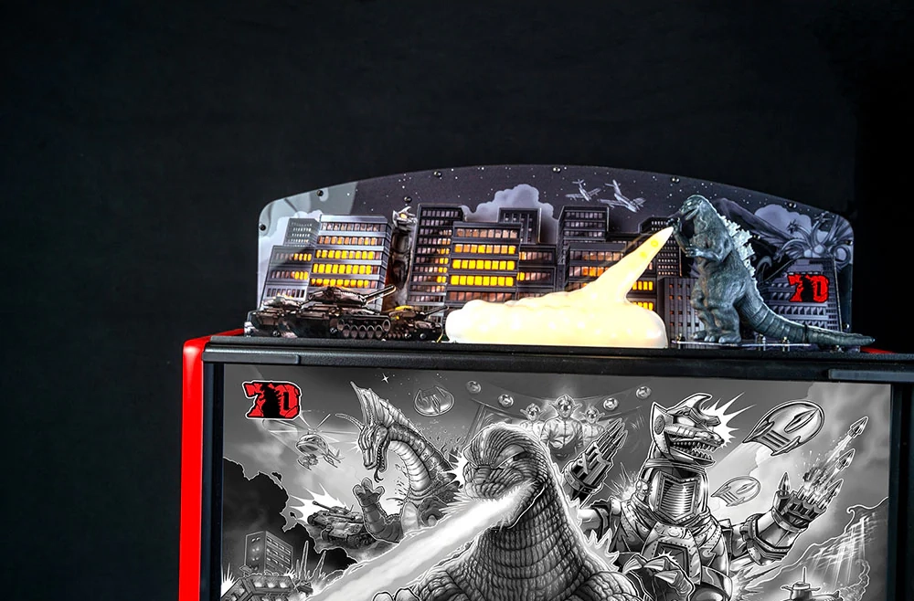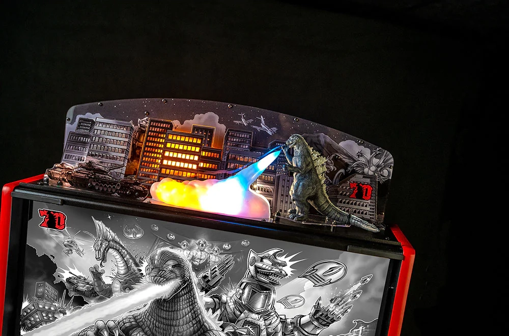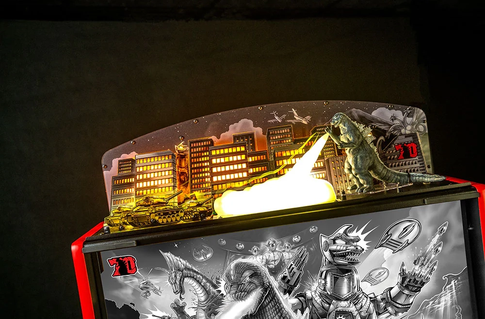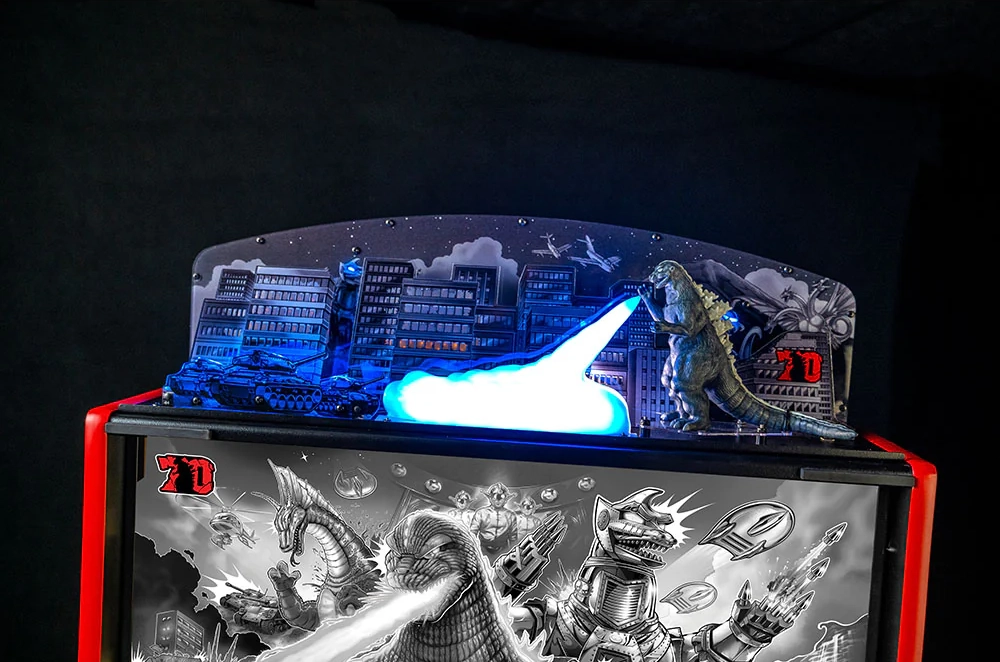 The Godzilla Heat Ray Destruction Topper accessory will immerse players into a world of chaos, incorporating a custom molded greyscale Godzilla sculpture breathing a heat ray against a city landscape. With 3 fire panels, a custom sculpted heat ray plume implementing 21 RGB lights, and a special flash lamp projecting Godzilla’s shadow, this exclusive decorative topper integrates distinct light shows and includes an exclusive “King of the Monsters Time Attack” mode elevating the entire gaming experience of Godzilla.