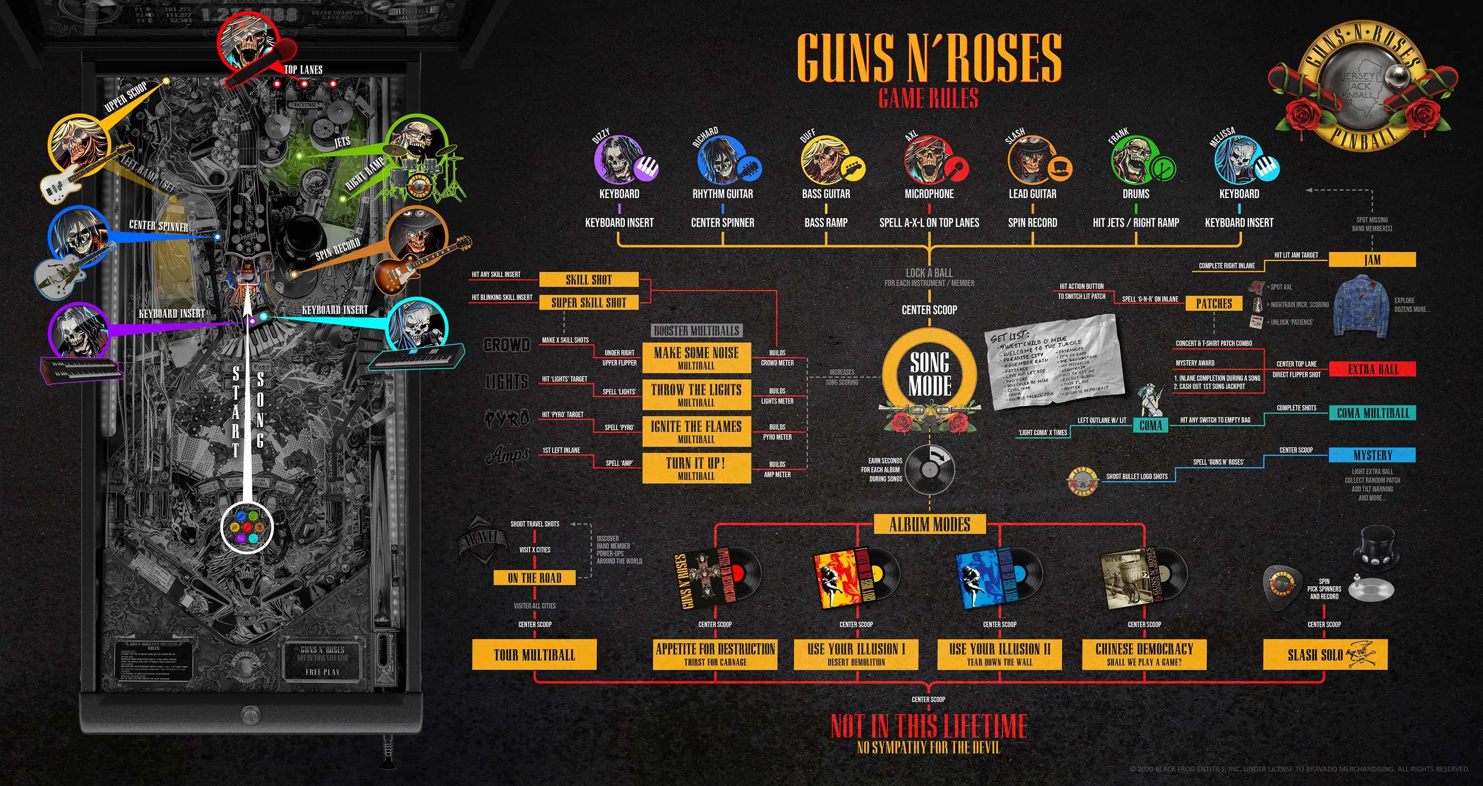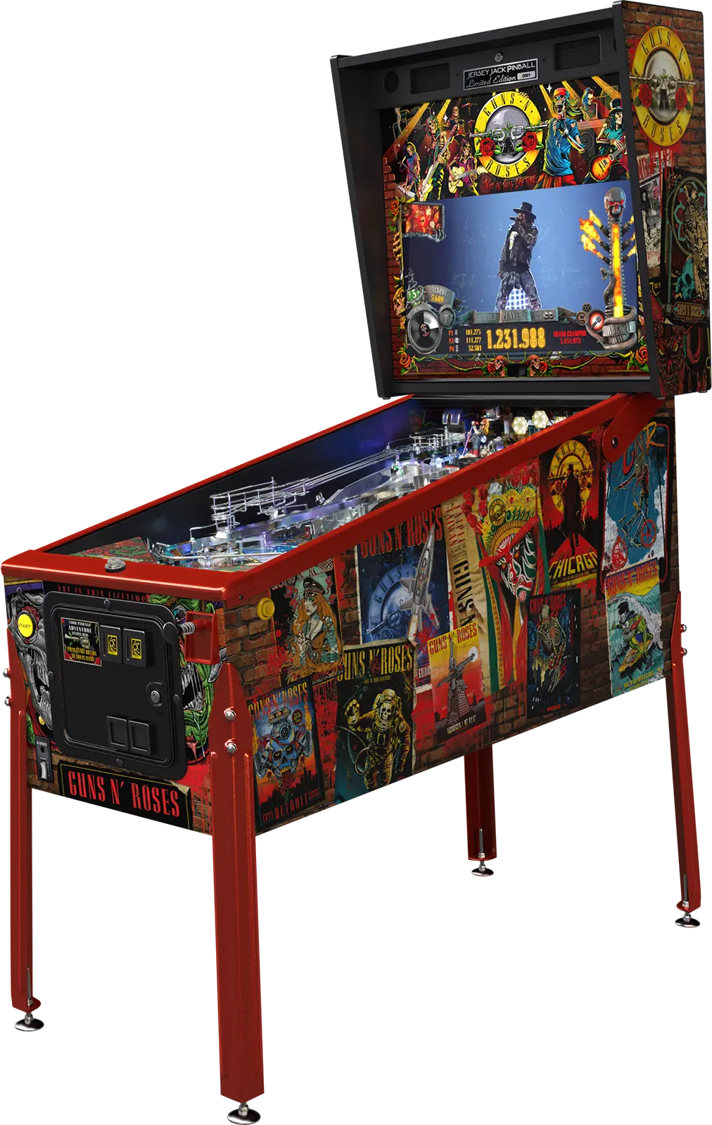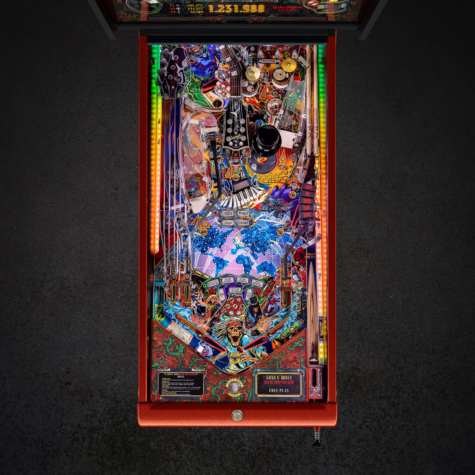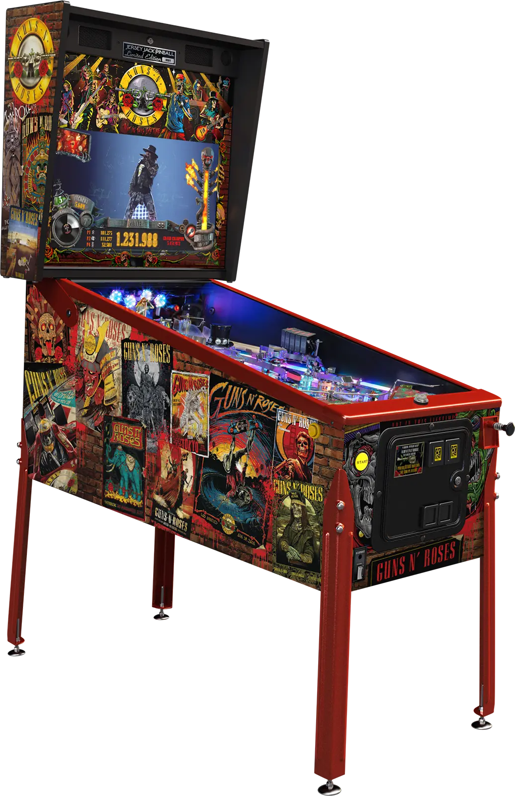 - GNR Tour Poster Cabinet Art Package, Red Brick Powder Coat Finish, and hand-drawn Skeletal Band backglass for a bold aesthetic.