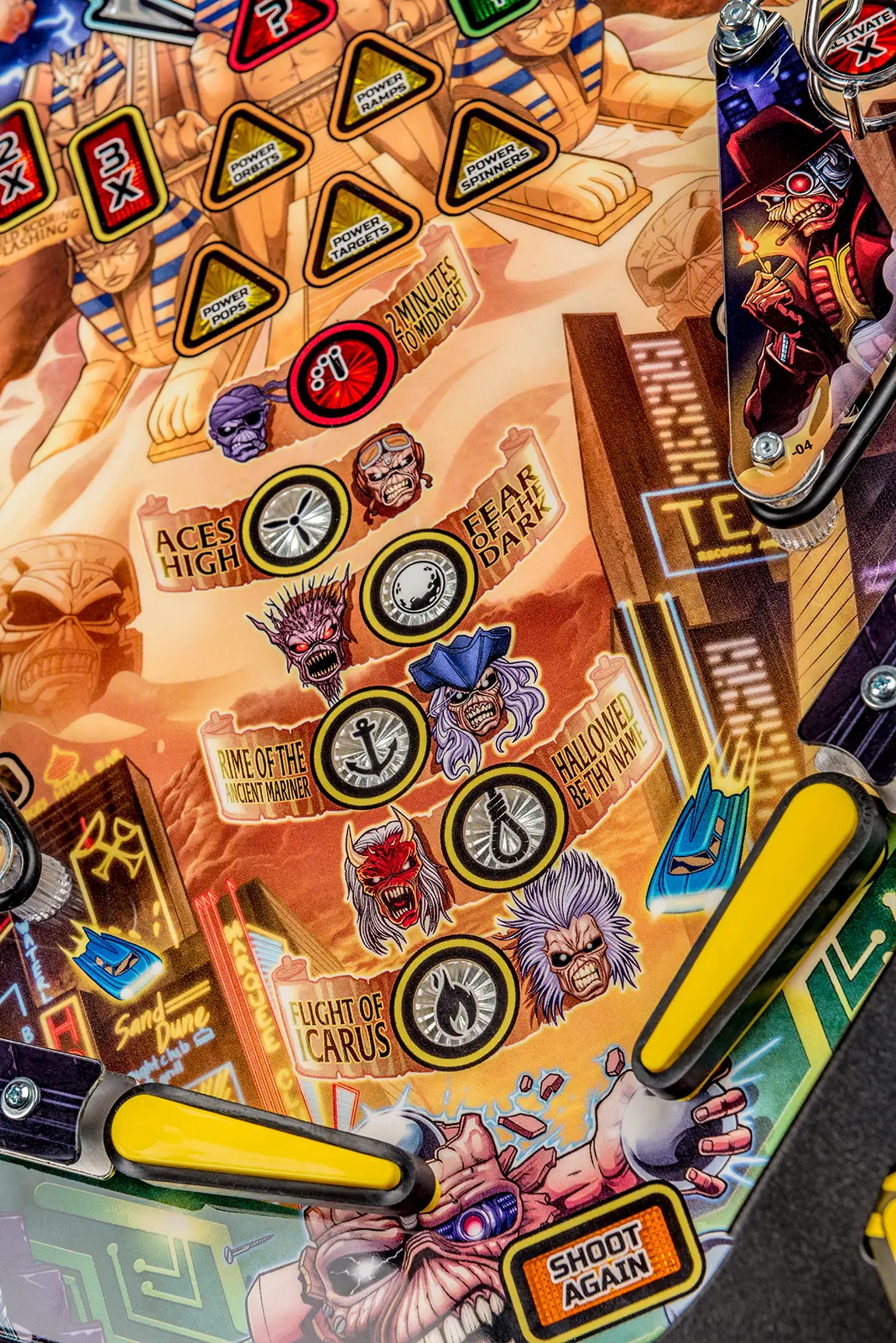 All models include twelve Iron Maiden songs with players going to battle as Eddie with the help of four flippers, two spinners, a set of 3-bank drop targets, metal and wireform ramps, a captive ball mechanism, a dual up-post lock mechanism, and a center bullseye target.
