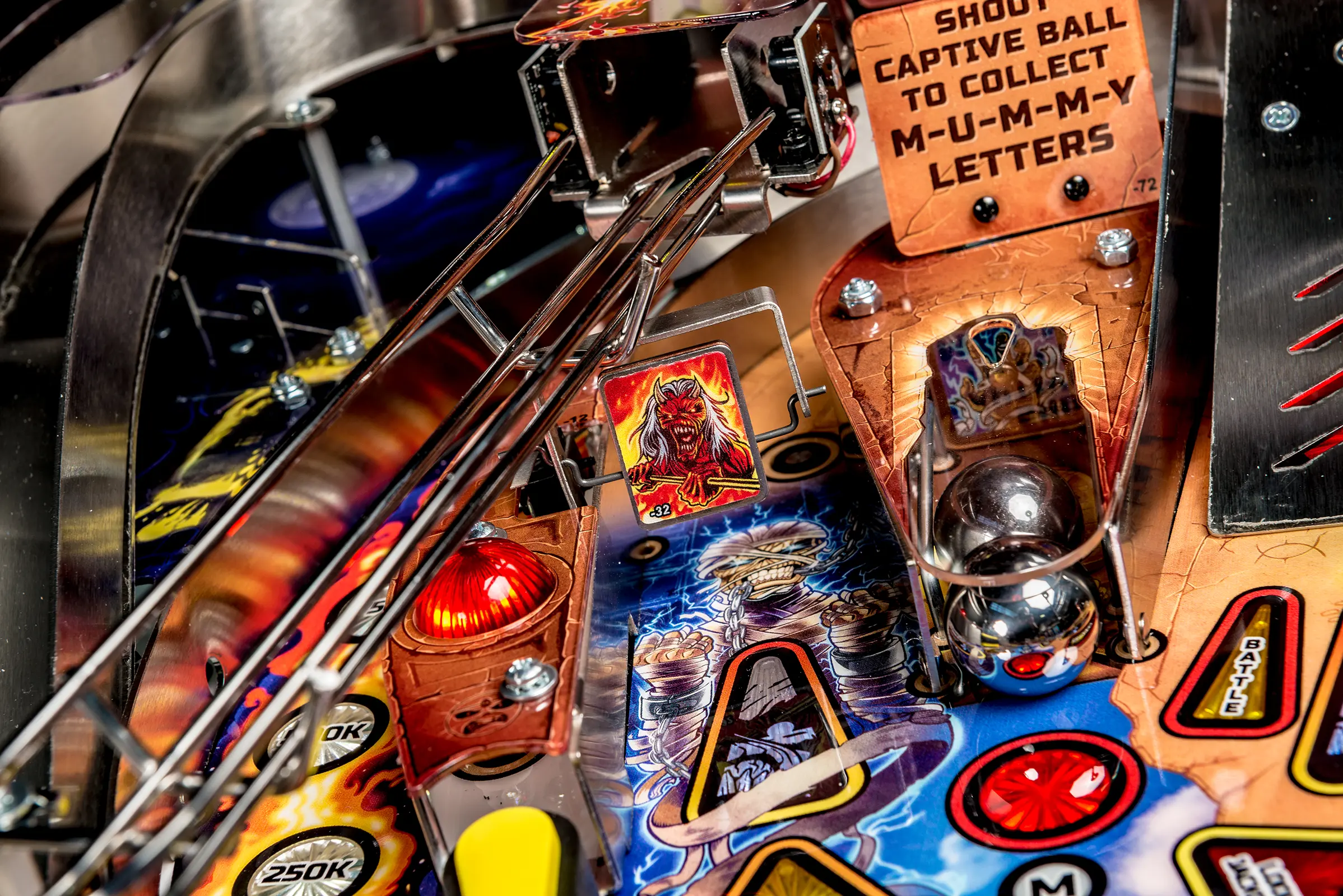 All models include twelve Iron Maiden songs with players going to battle as Eddie with the help of four flippers, two spinners, a set of 3-bank drop targets, metal and wireform ramps, a captive ball mechanism, a dual up-post lock mechanism, and a center bullseye target.