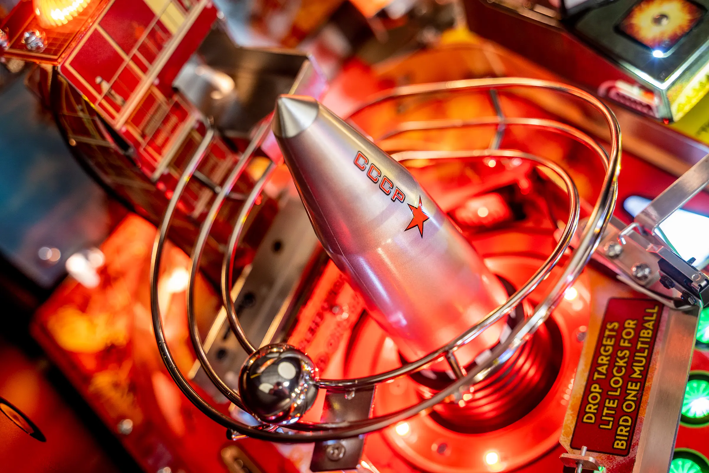 Gather gadgets from Q Branch as pinballs get ejected through the roof of a custom sculpted Aston Martin DB5. Break through the Osato Chemicals drop targets to battle SPECTRE at the Bird One rocket base. And hold your breath on the gravity defying, magnetic jetpack as it transports pinballs across the playfield.