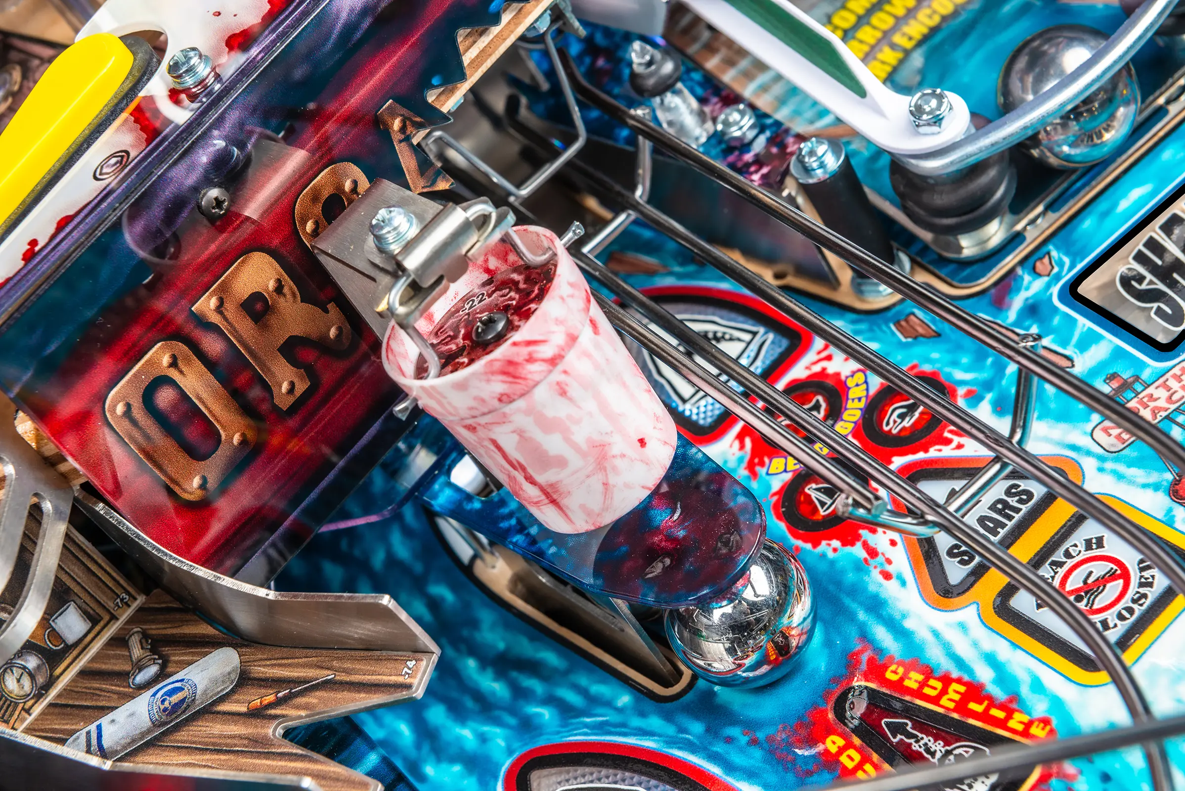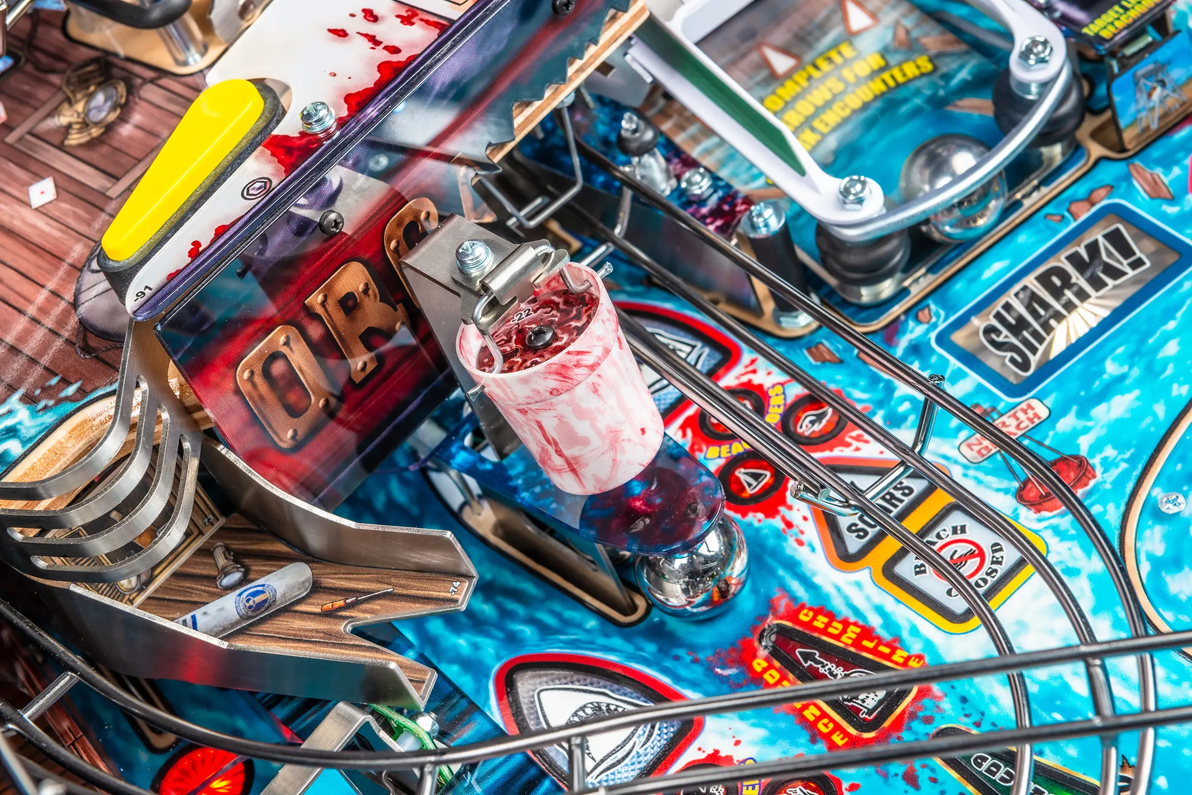 Stern’s JAWS pinball games will have players grabbing their harpoons and playing as Quint, Hooper, and Brody to save Amity Island’s residents and the Fourth of July! As the grizzled fishermen, tackle the most dangerous ocean creatures on the planet. Tension mounts as you see “blood in the water” from our animated lighting effects. Fire pinballs at the motorized “Shark Fin” target swimming across the playfield. Anticipation builds as you navigate the “Orca Boat” upper playfield, featuring a “Lookout Tower” ramp, a ship’s wheel horizontal spinner on the deck, and a “Radio” stand-up target to call for help. Lookout! A motorized custom sculpted “Great White Shark” bash toy comes crashing through the bottom of a fishing boat, terrorizing players in this thrilling pinball odyssey. Will you survive JAWS?!