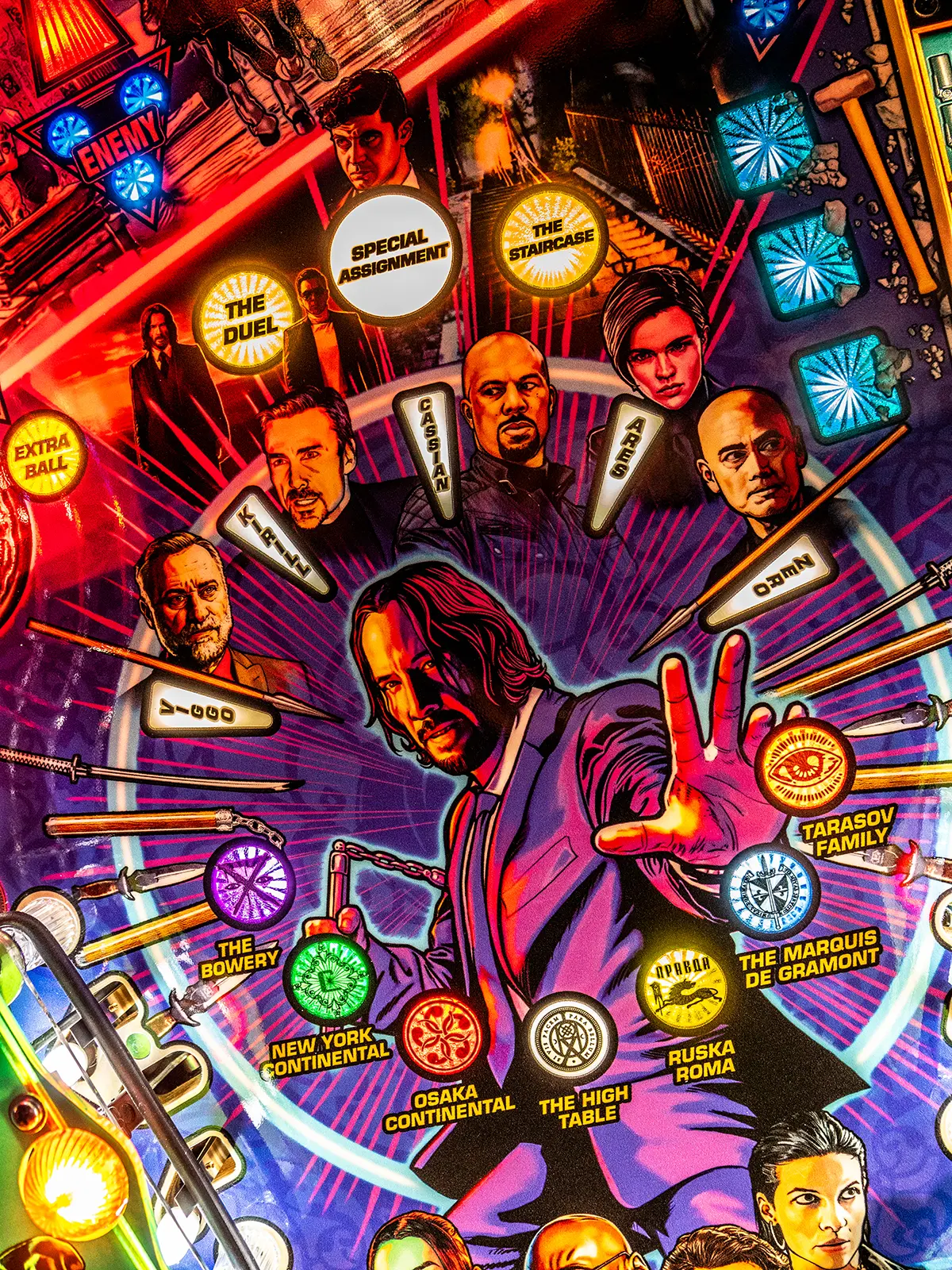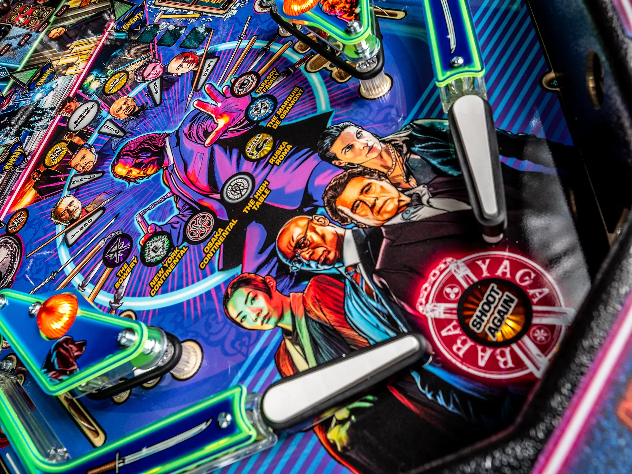 - Pro Edition features “The Continental” inspired translite and side cabinet featuring the New York Continental Hotel with John Wick and his Allies and Adversaries with illustrated artwork by Randy Martinez.
