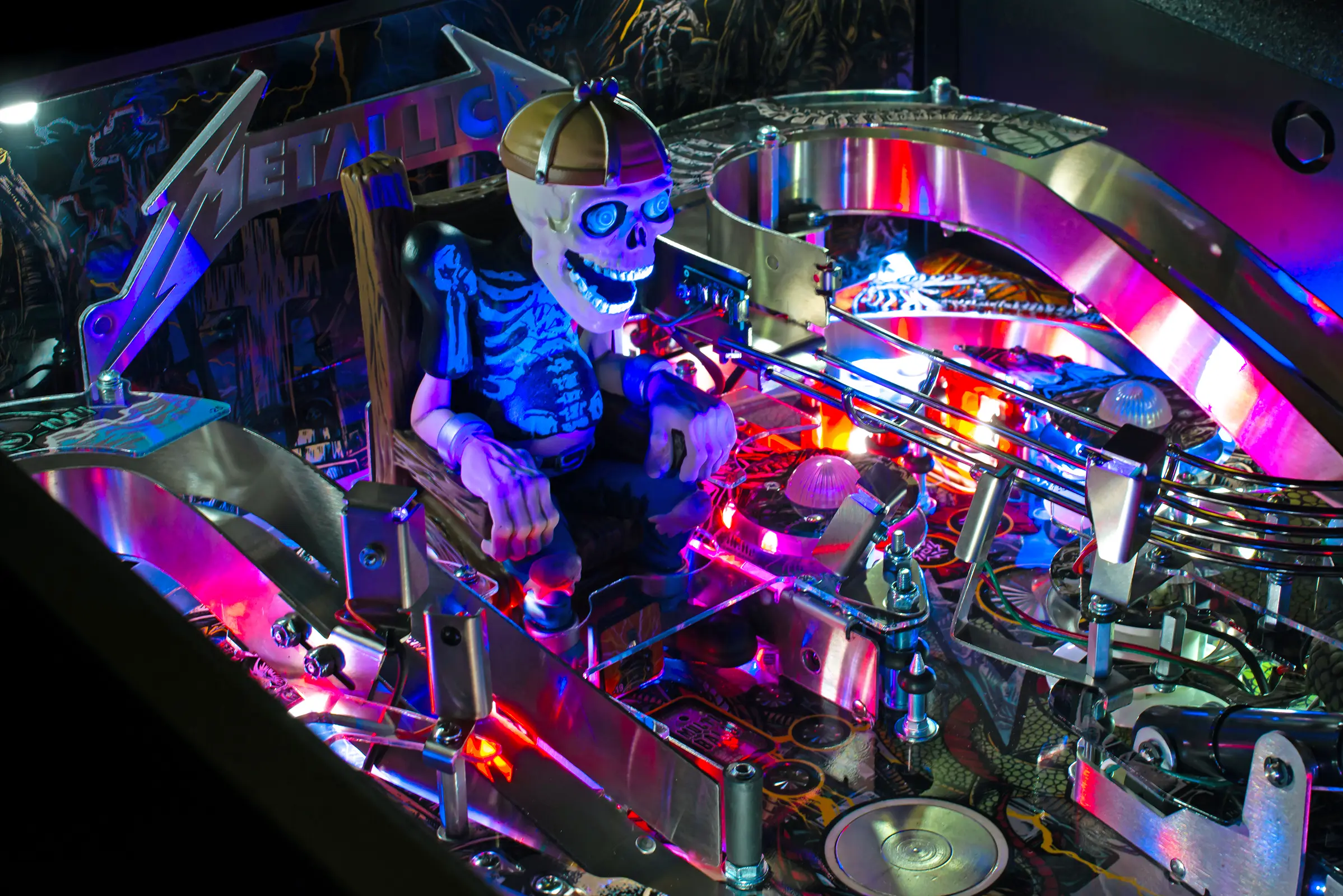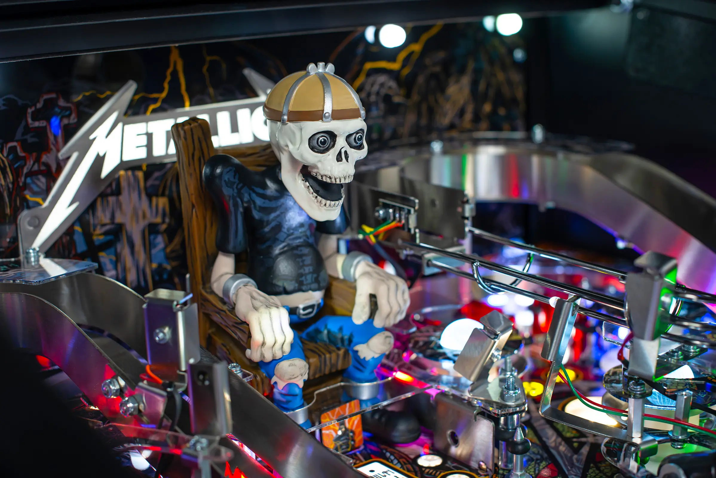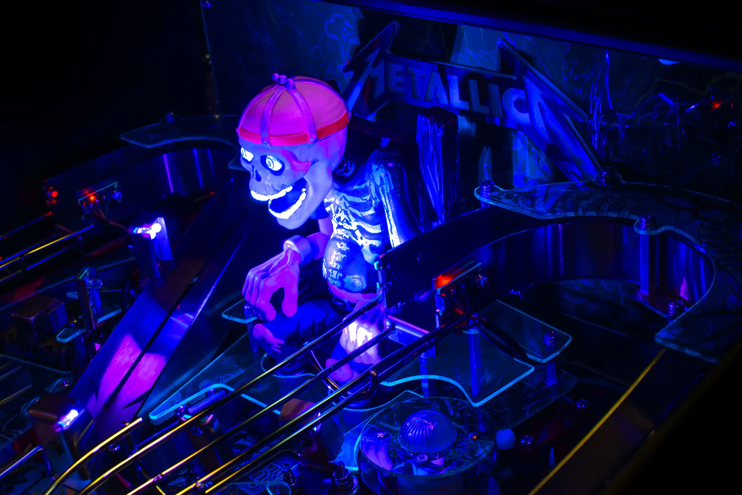 John Borg’s classic playfield architecture has been enhanced with three all-new sculptures: Sparky, the Hammer, new RGB-illuminated Skulls, and a new Metallica logo spell-out on the back panel. Dramatic UV lighting effects have been implemented throughout the playfield and on Sparky, and the game includes numerous quality and durability refinements.