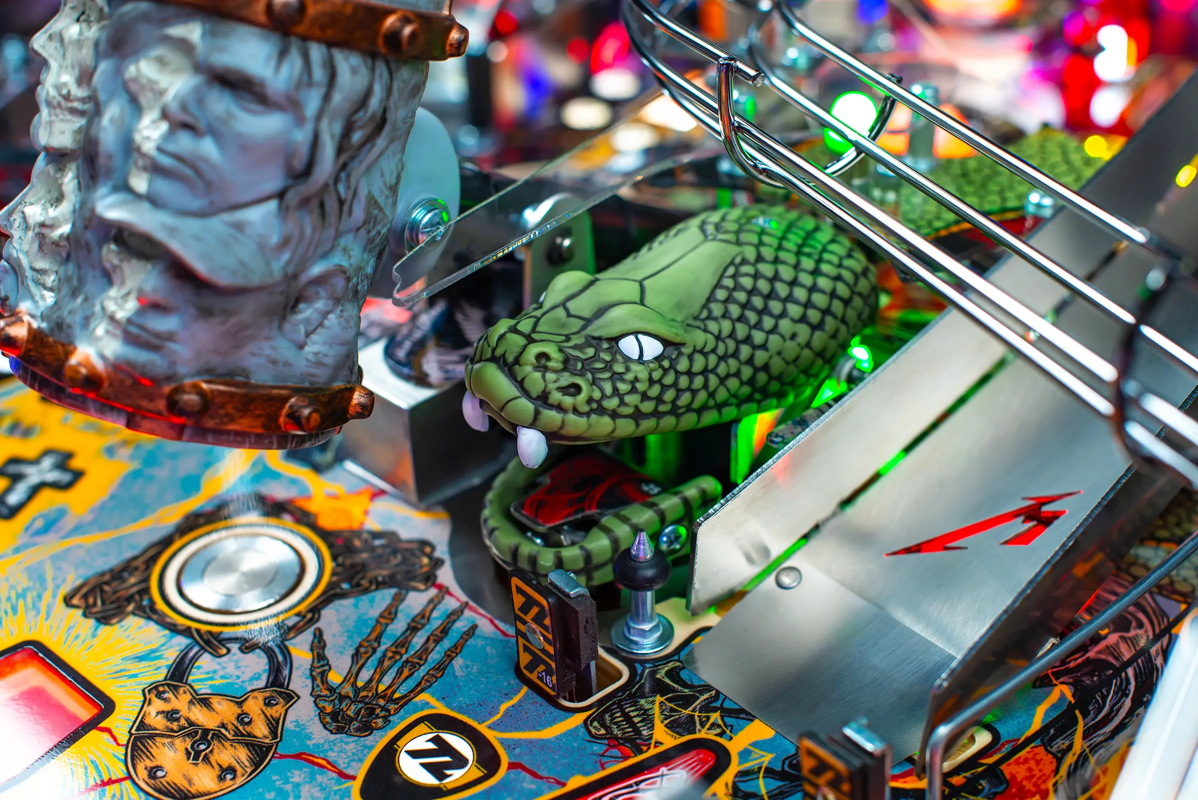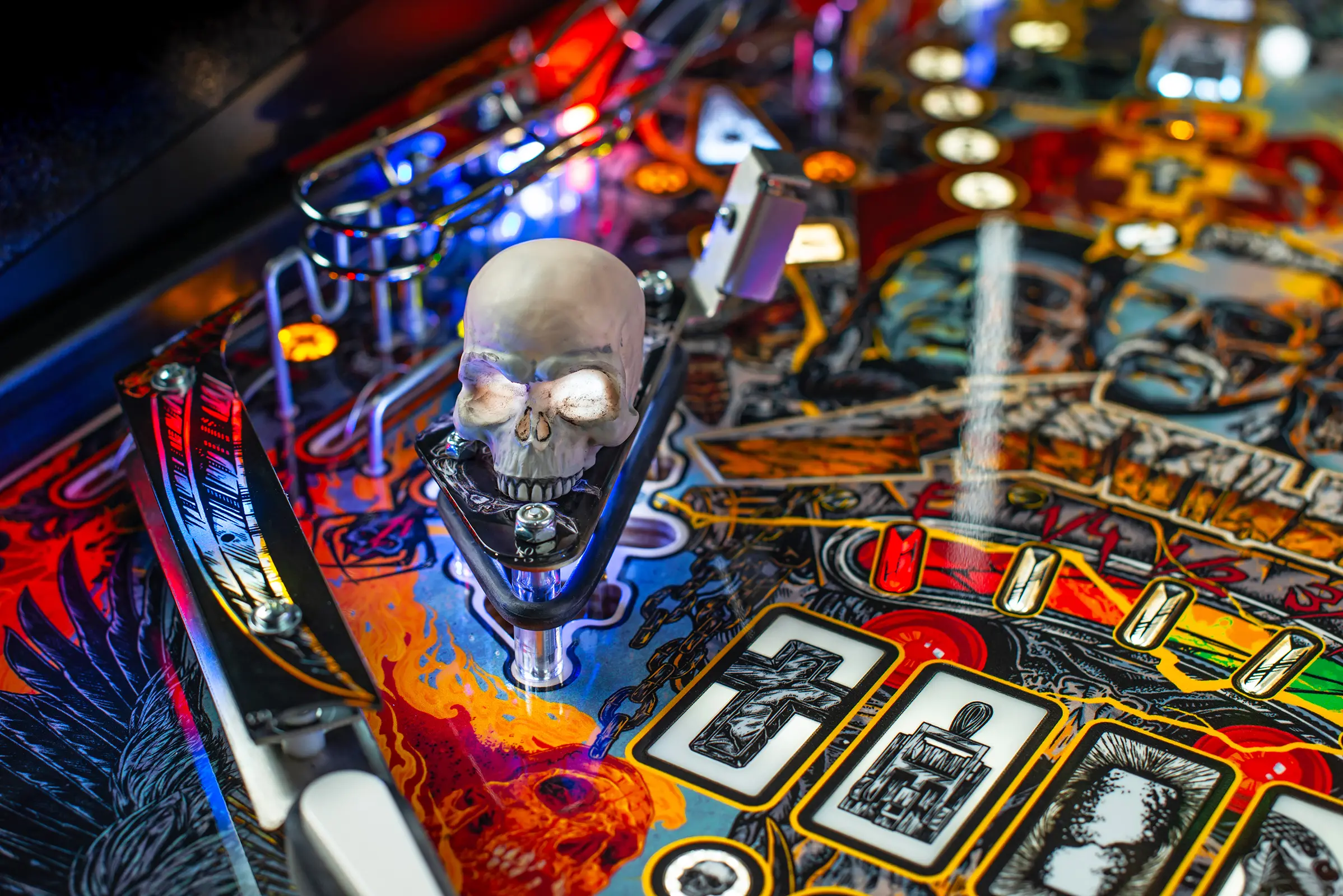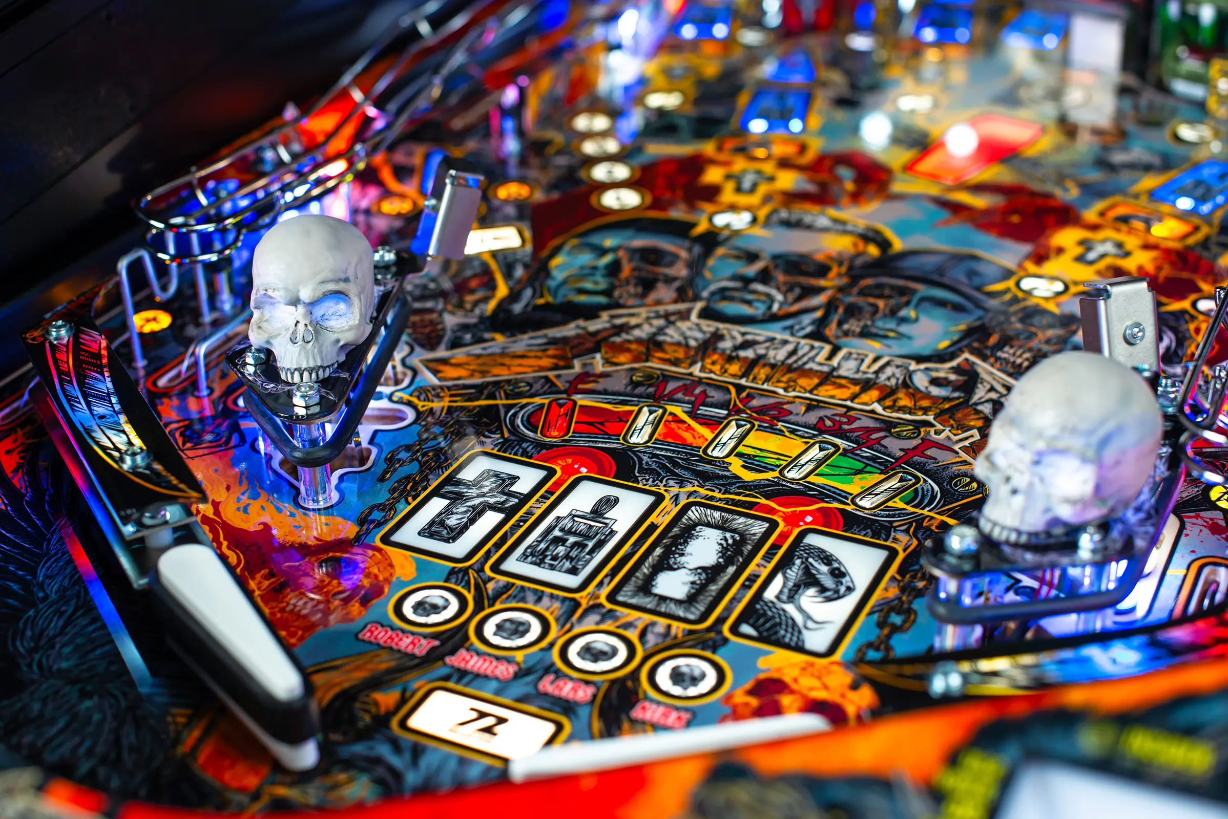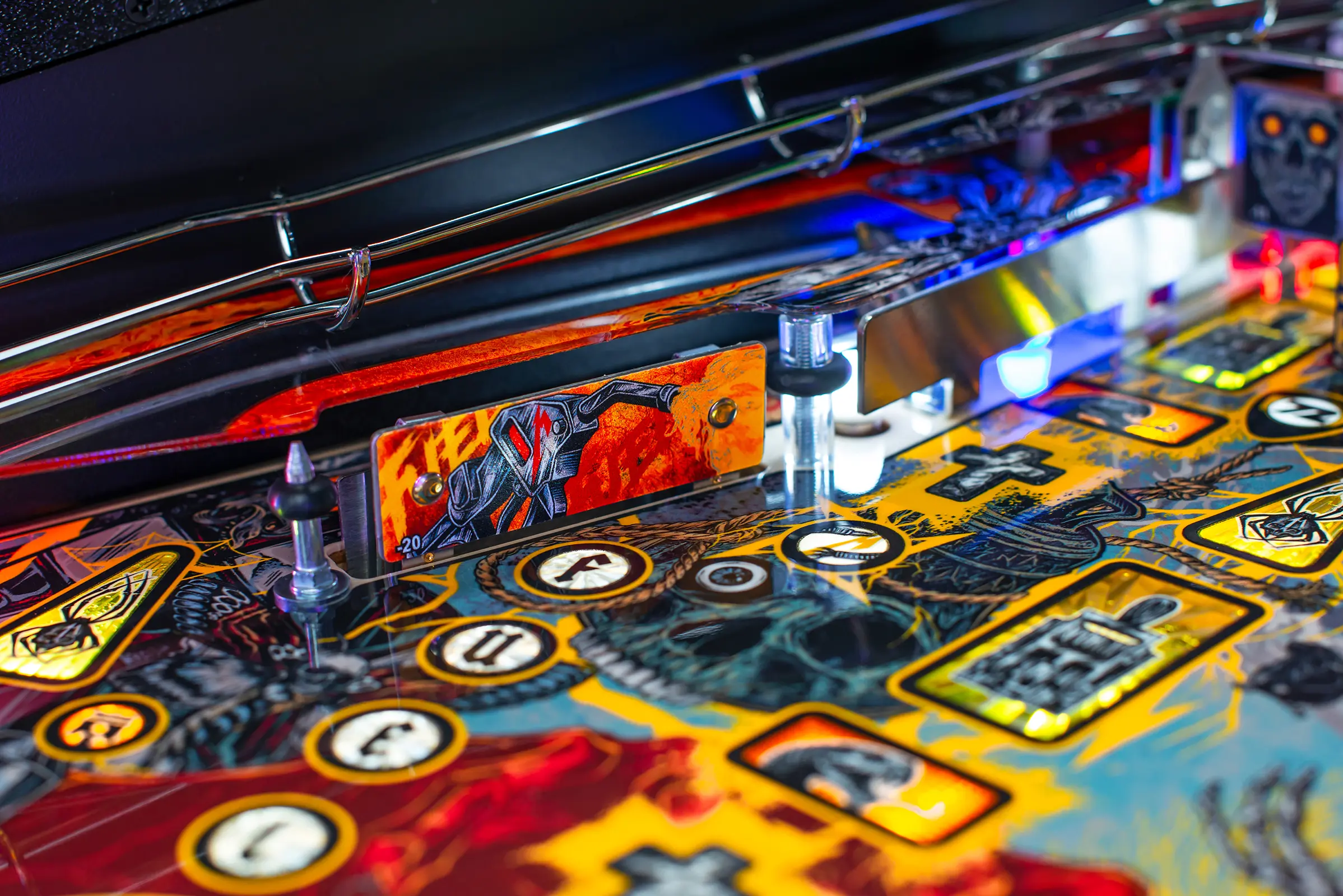 John Borg’s classic playfield architecture has been enhanced with three all-new sculptures: Sparky, the Hammer, new RGB-illuminated Skulls, and a new Metallica logo spell-out on the back panel. Dramatic UV lighting effects have been implemented throughout the playfield and on Sparky, and the game includes numerous quality and durability refinements.