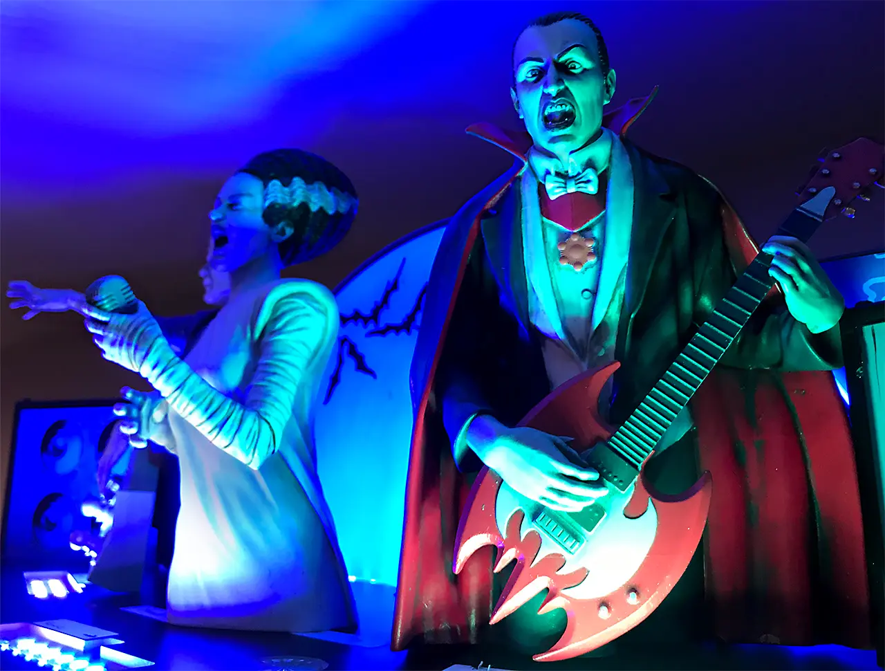 - Horror Icon Reunion! Custom 7” tall sculpted topper features Frankenstein, Dracula, and the Bride of Frankenstein on the stage in their full glory.