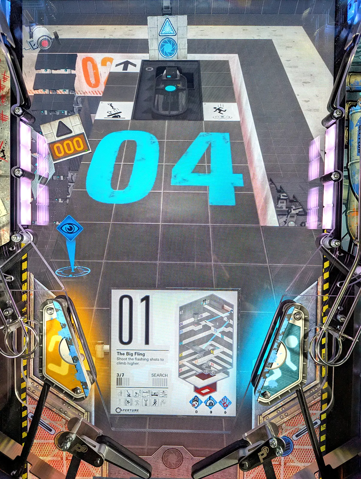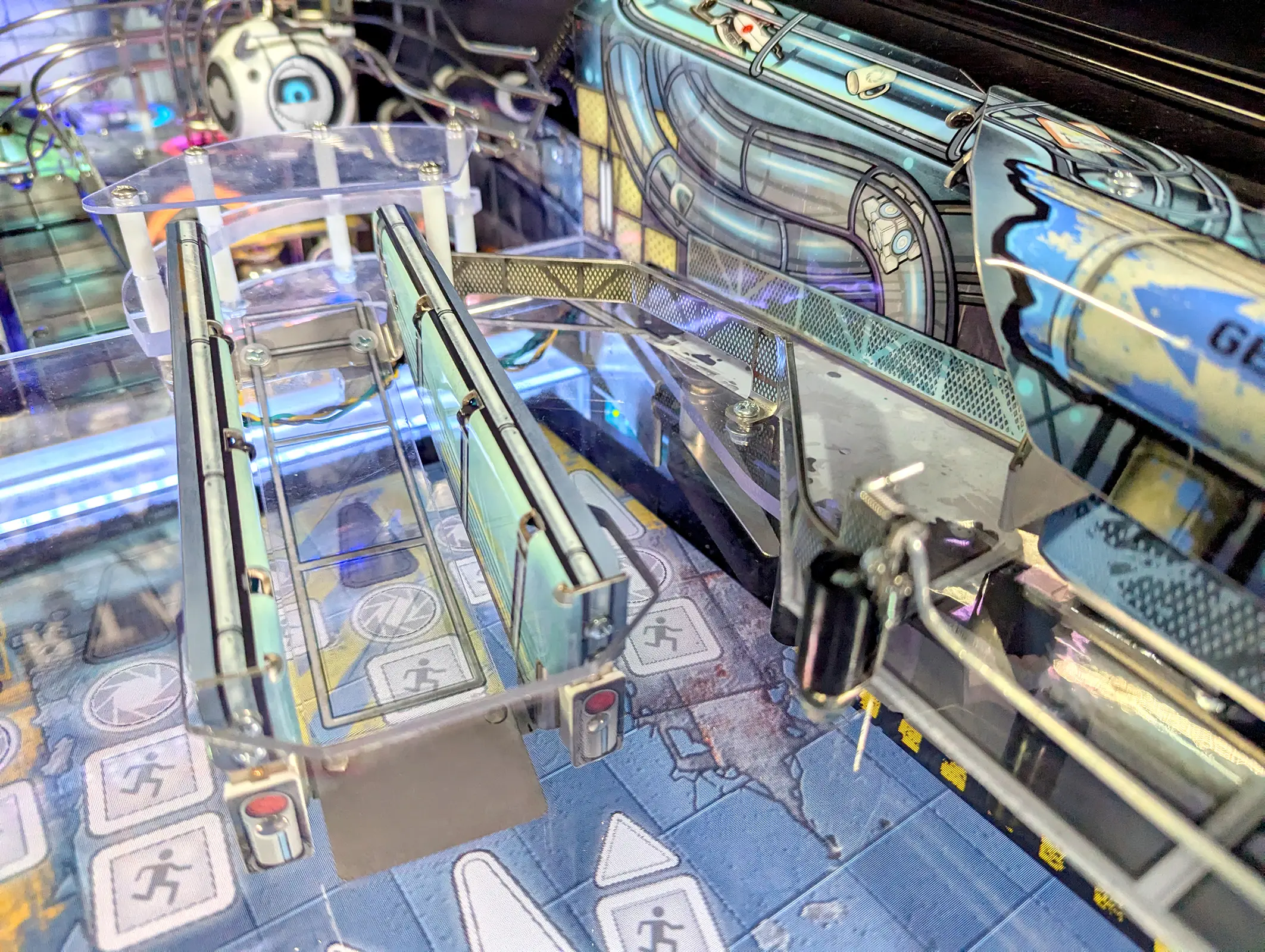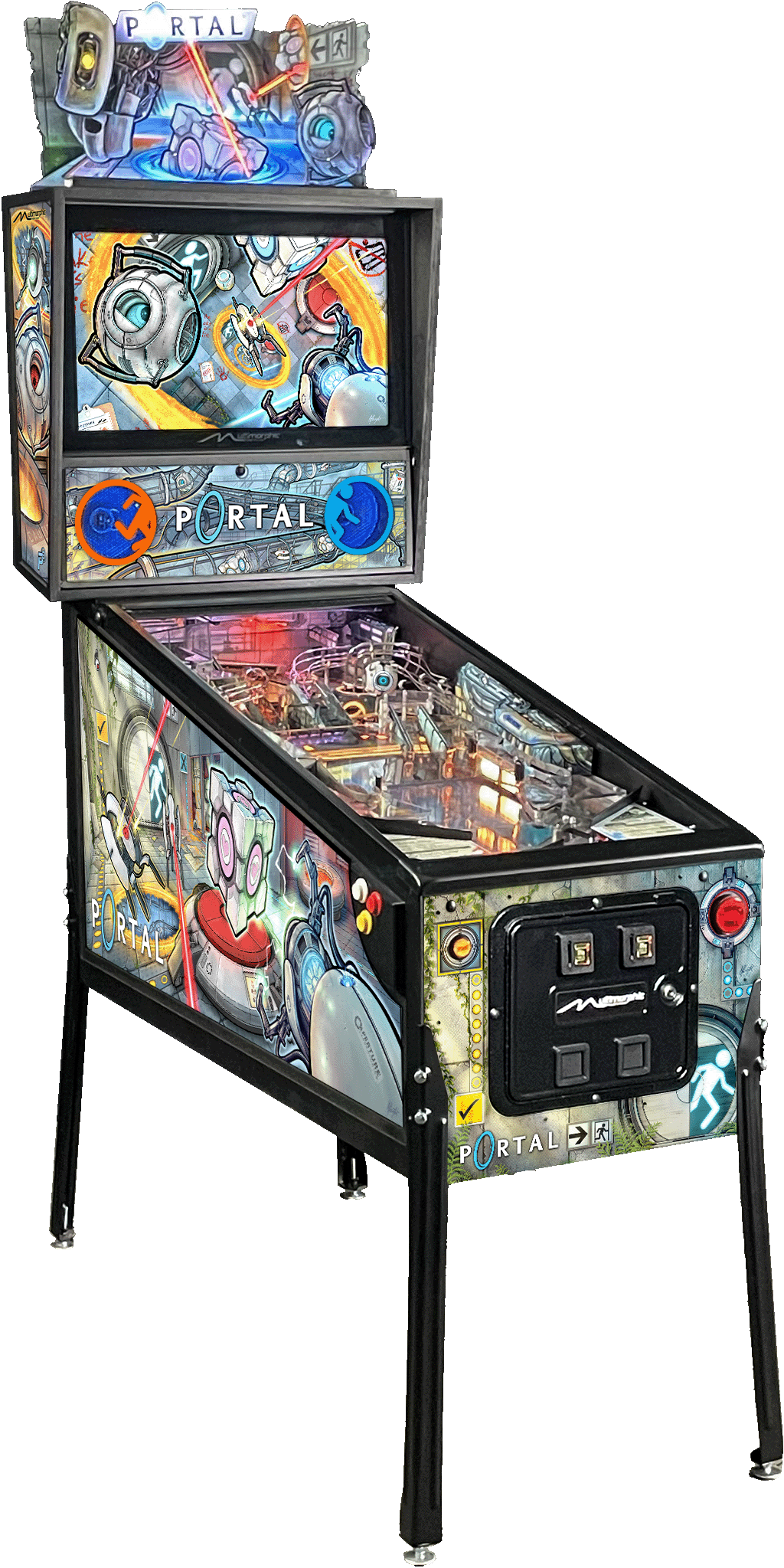 Portal is a pinball game based on the Portal series of video games from Valve. While playing the game, you will interact with many physical and virtual features modeled after elements from the Portal 1 and Portal 2 video games. The physical playfield is packed full of interactive mechs and 10 RGB illuminated physical playfield portals and 6 additional scoop portals, through which the pinball can “travel through” instantly.There are two editions of the game, Portal Standard and Portal Extended. Both editions include the same upper playfield module and game software, while the extended edition also includes the Portal module extension. The Portal module extension floats over the screen and brings gameplay closer to the flippers with additional decorated catwalks, a physical spinner, four physical targets, a third dynamic ramp, the hidden gel tube kickback mechanism, and the elevated, cross-playfield Hard Light Bridge experience. After adding a connection point to your left side target module, swapping in the Portal module extension is as simple as removing the inlane wireforms, lowering the module extension in from above, securing it with 4 screws, and connecting the cable harnesses to their mates on the sides of the upper playfield module. The game software detects the presence of the module extension and adjusts the game rules accordingly.