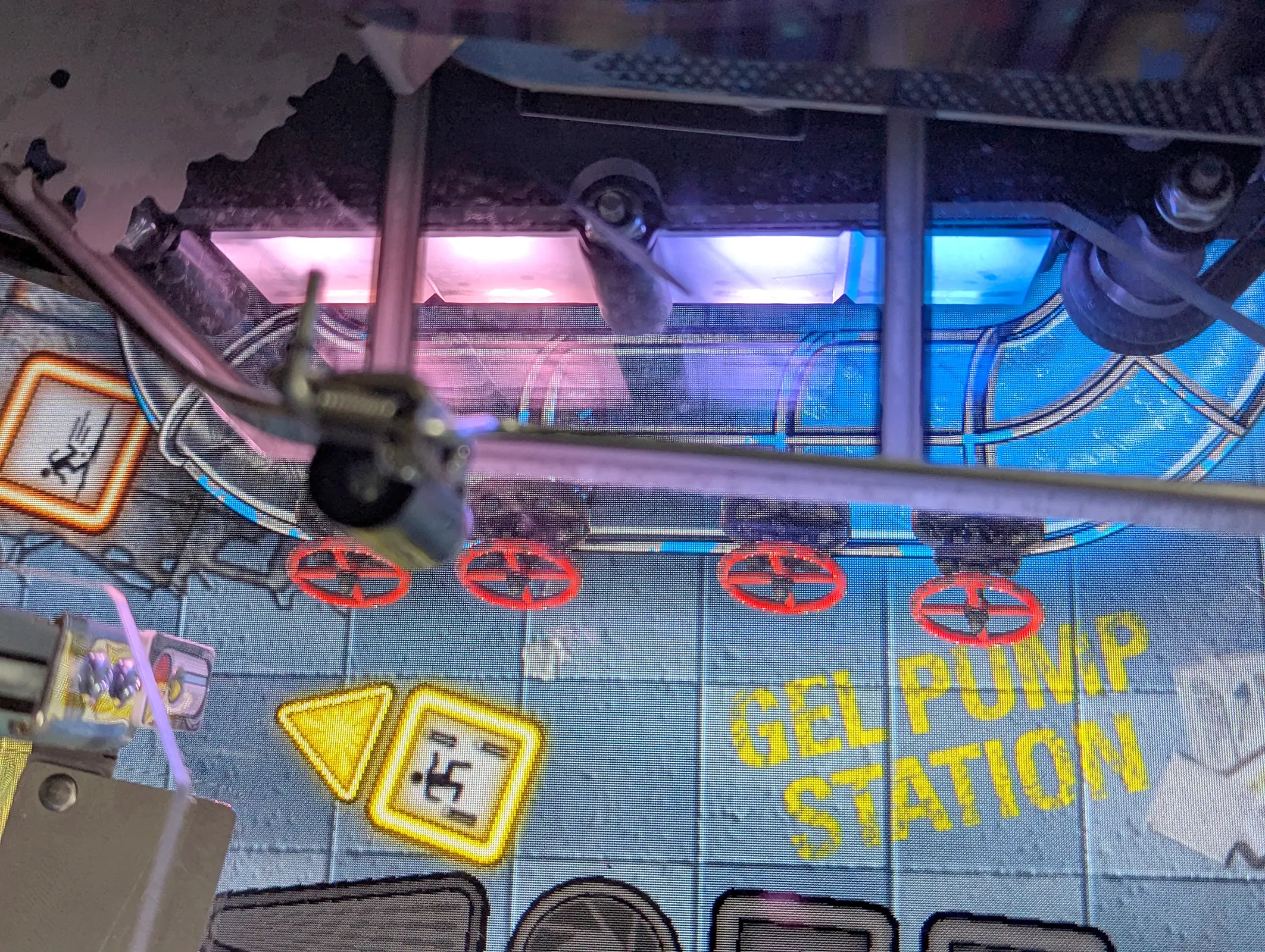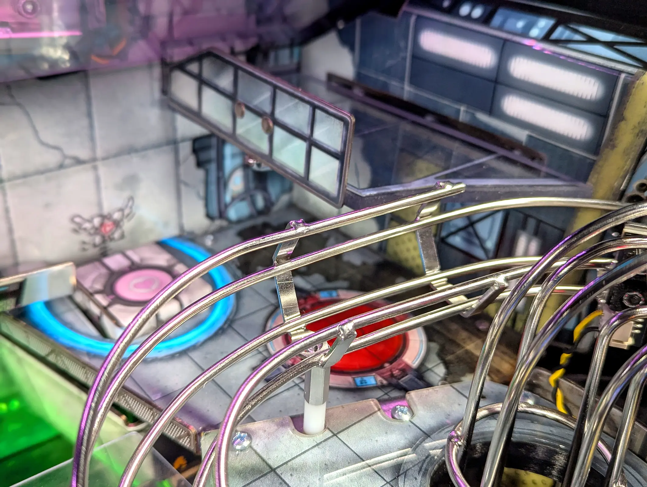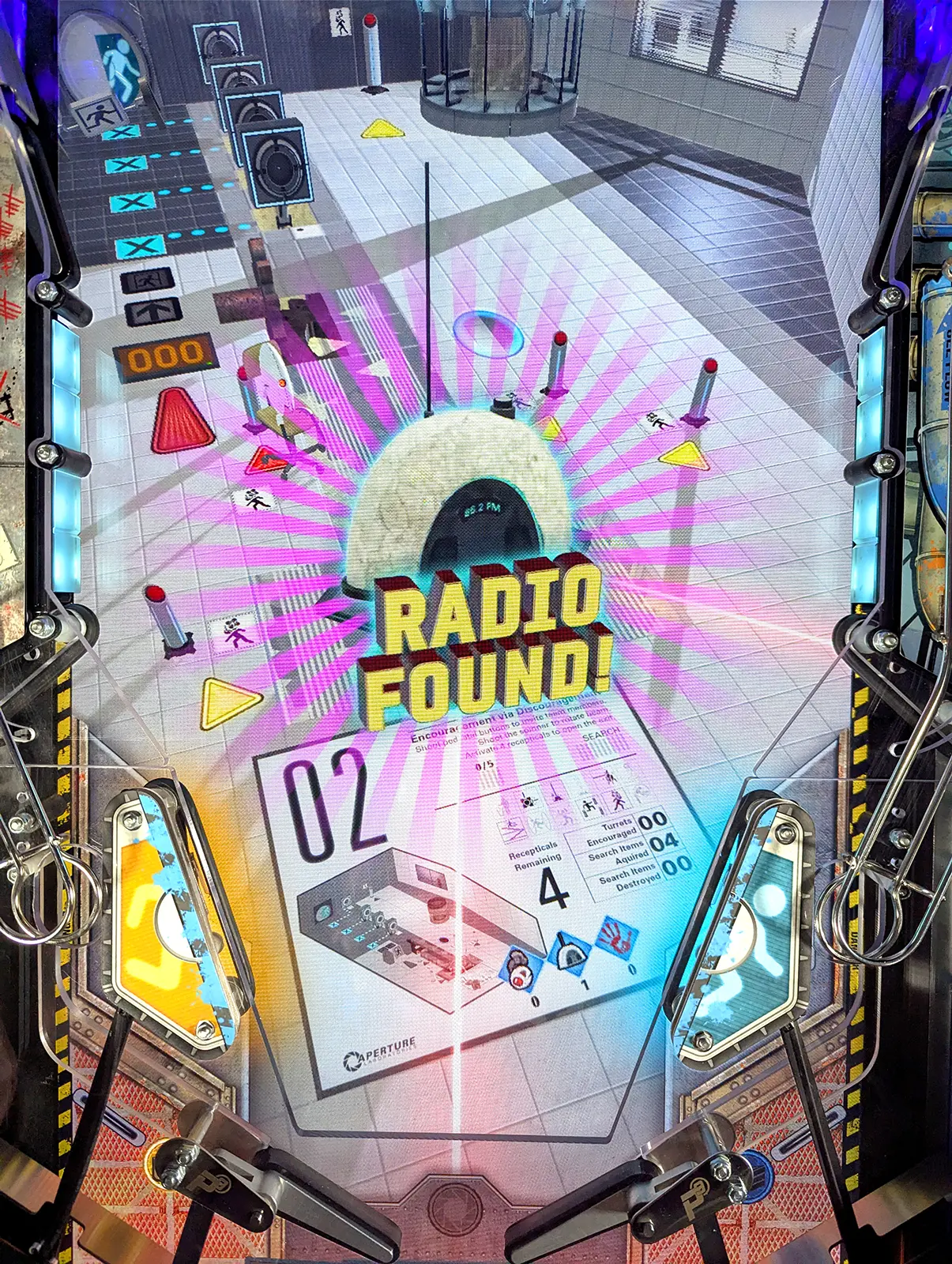 Portal is a pinball game based on the Portal series of video games from Valve. While playing the game, you will interact with many physical and virtual features modeled after elements from the Portal 1 and Portal 2 video games. The physical playfield is packed full of interactive mechs and 10 RGB illuminated physical playfield portals and 6 additional scoop portals, through which the pinball can “travel through” instantly.There are two editions of the game, Portal Standard and Portal Extended. Both editions include the same upper playfield module and game software, while the extended edition also includes the Portal module extension. The Portal module extension floats over the screen and brings gameplay closer to the flippers with additional decorated catwalks, a physical spinner, four physical targets, a third dynamic ramp, the hidden gel tube kickback mechanism, and the elevated, cross-playfield Hard Light Bridge experience. After adding a connection point to your left side target module, swapping in the Portal module extension is as simple as removing the inlane wireforms, lowering the module extension in from above, securing it with 4 screws, and connecting the cable harnesses to their mates on the sides of the upper playfield module. The game software detects the presence of the module extension and adjusts the game rules accordingly.