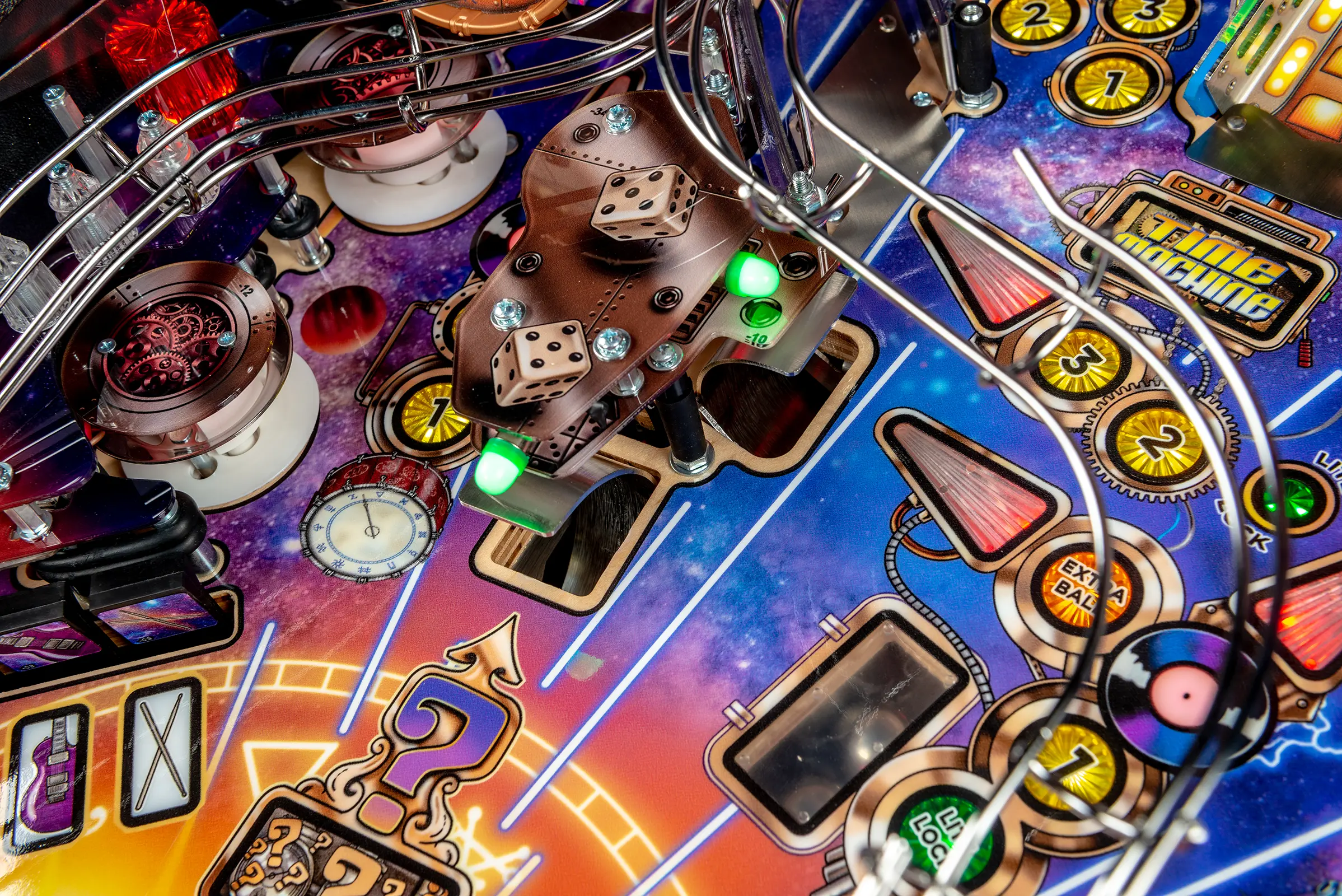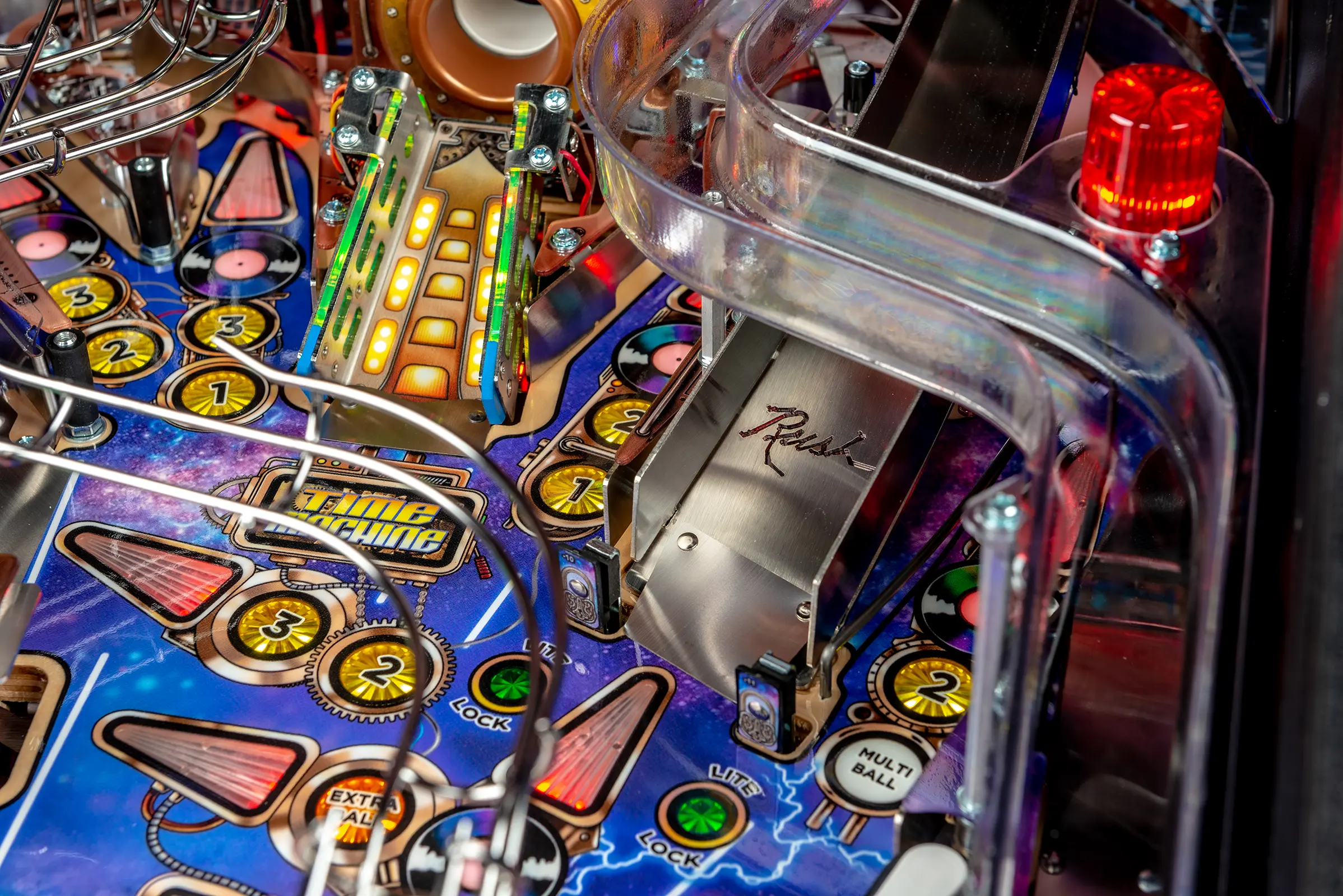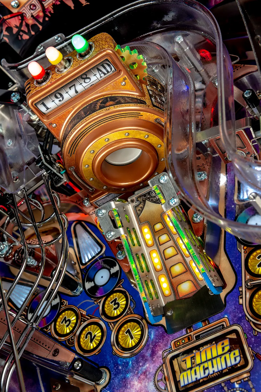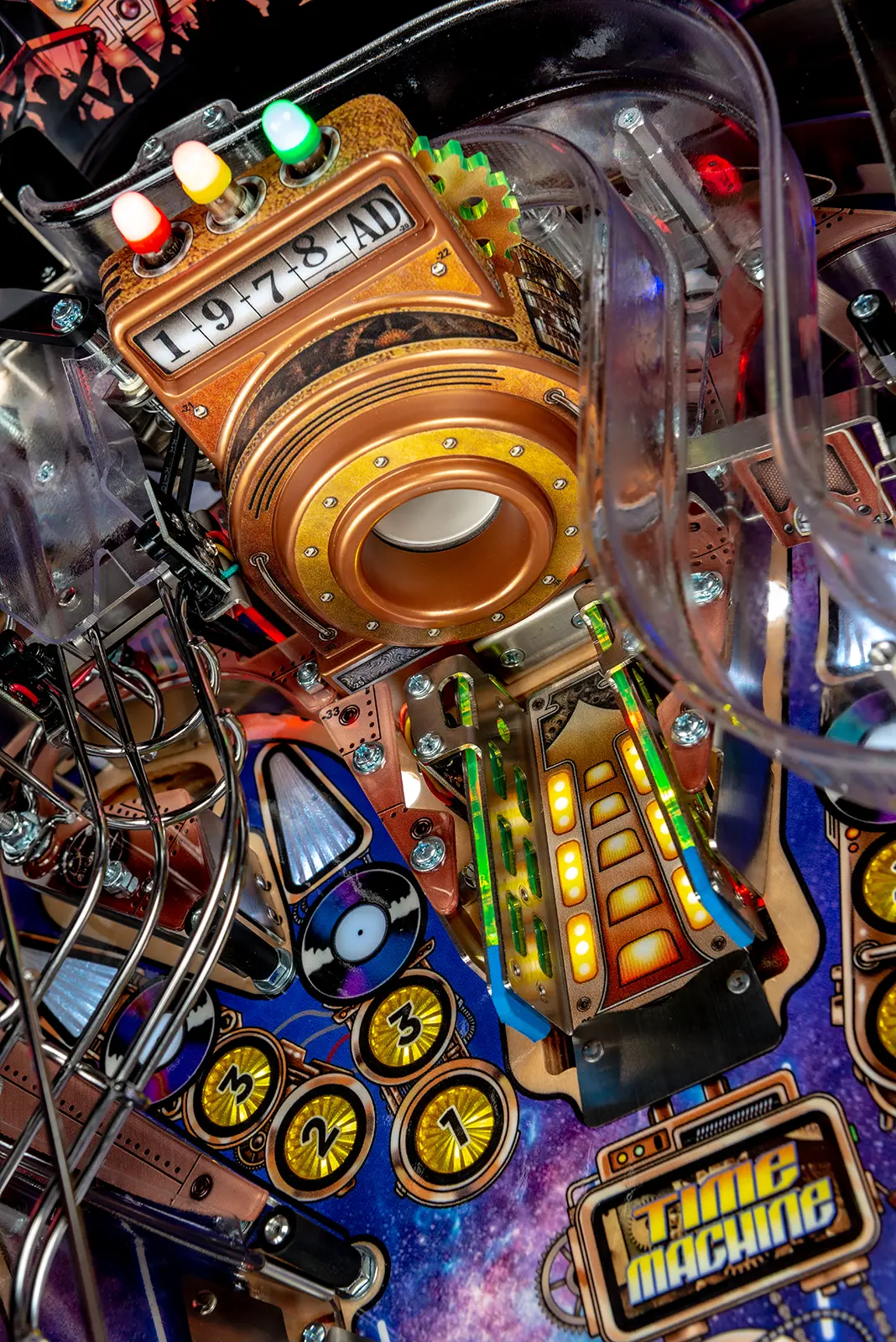 • Custom sculpted electromagnetic Time Machine ball lock with motorized ramp entrance and custom lighting effects across the sides and floor.