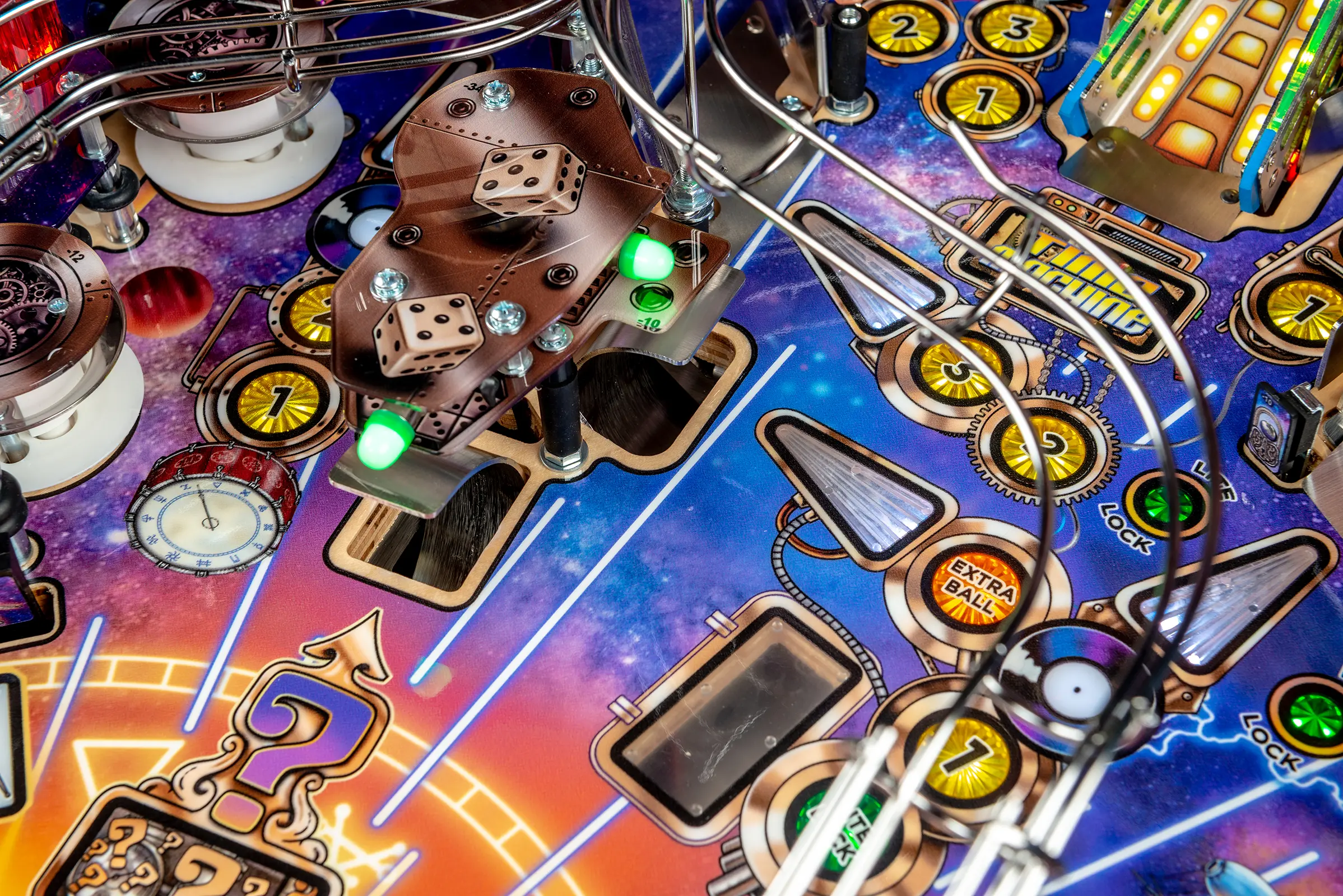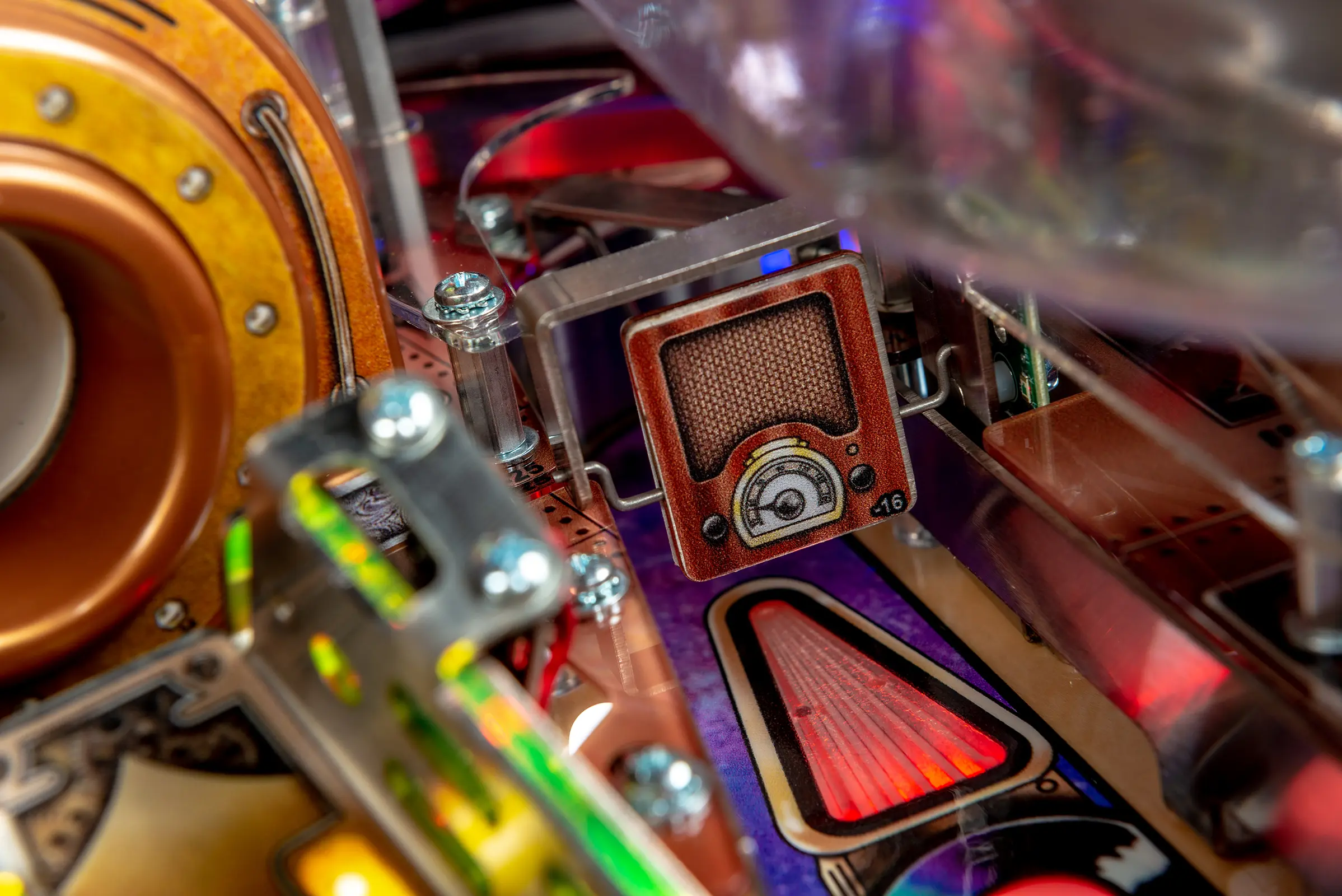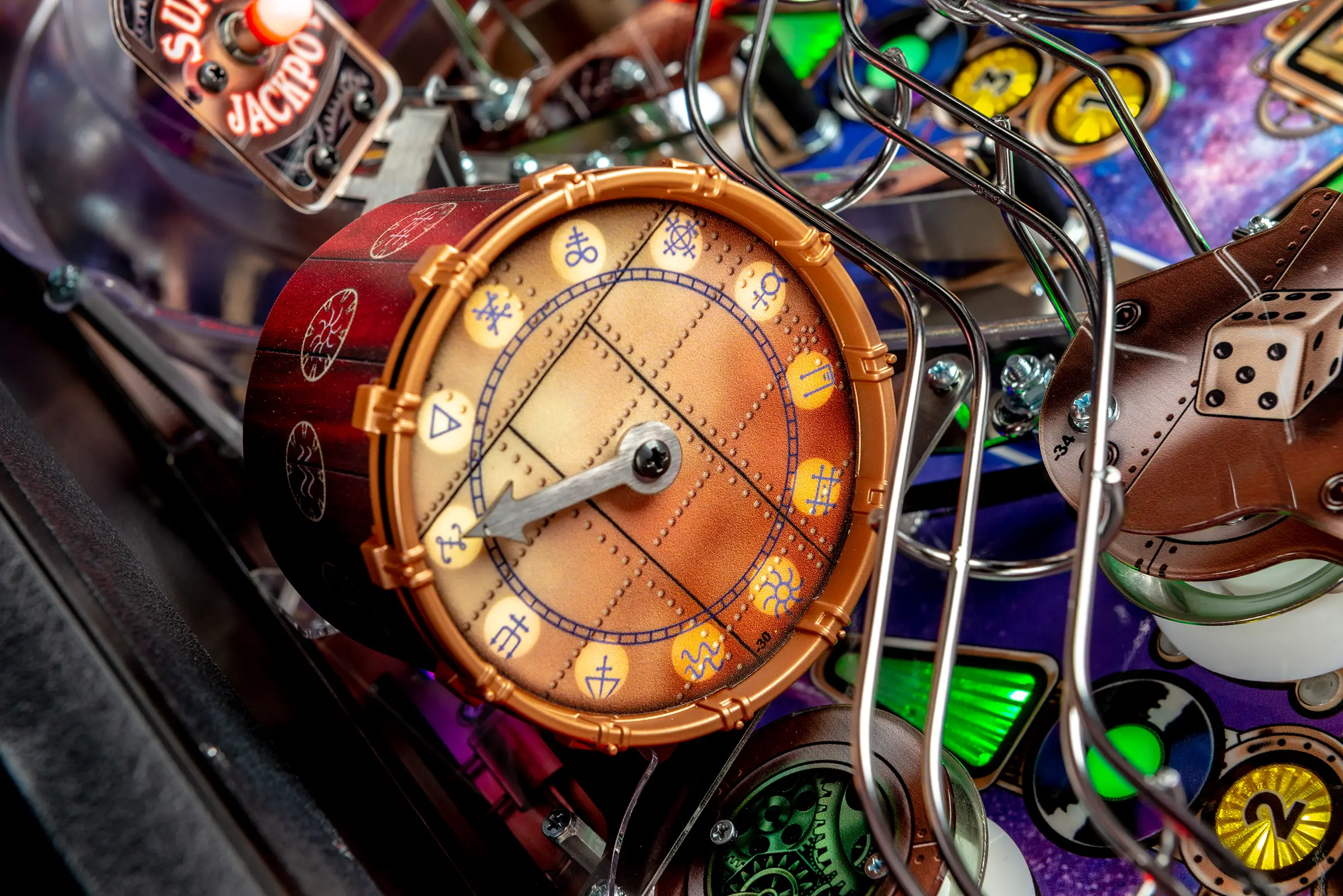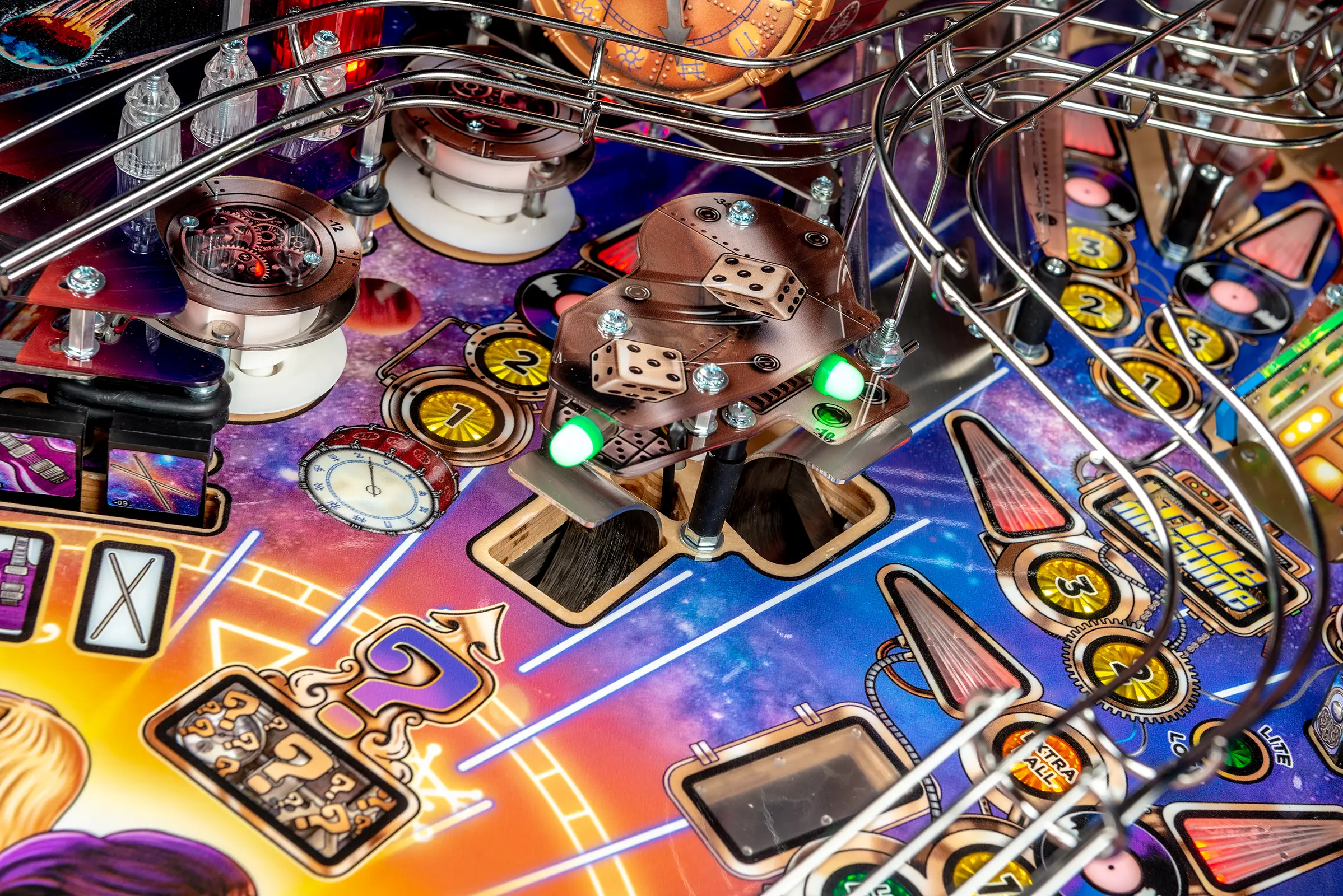 • Custom sculpted electromagnetic Time Machine ball lock with motorized ramp entrance and custom lighting effects across the sides and floor.