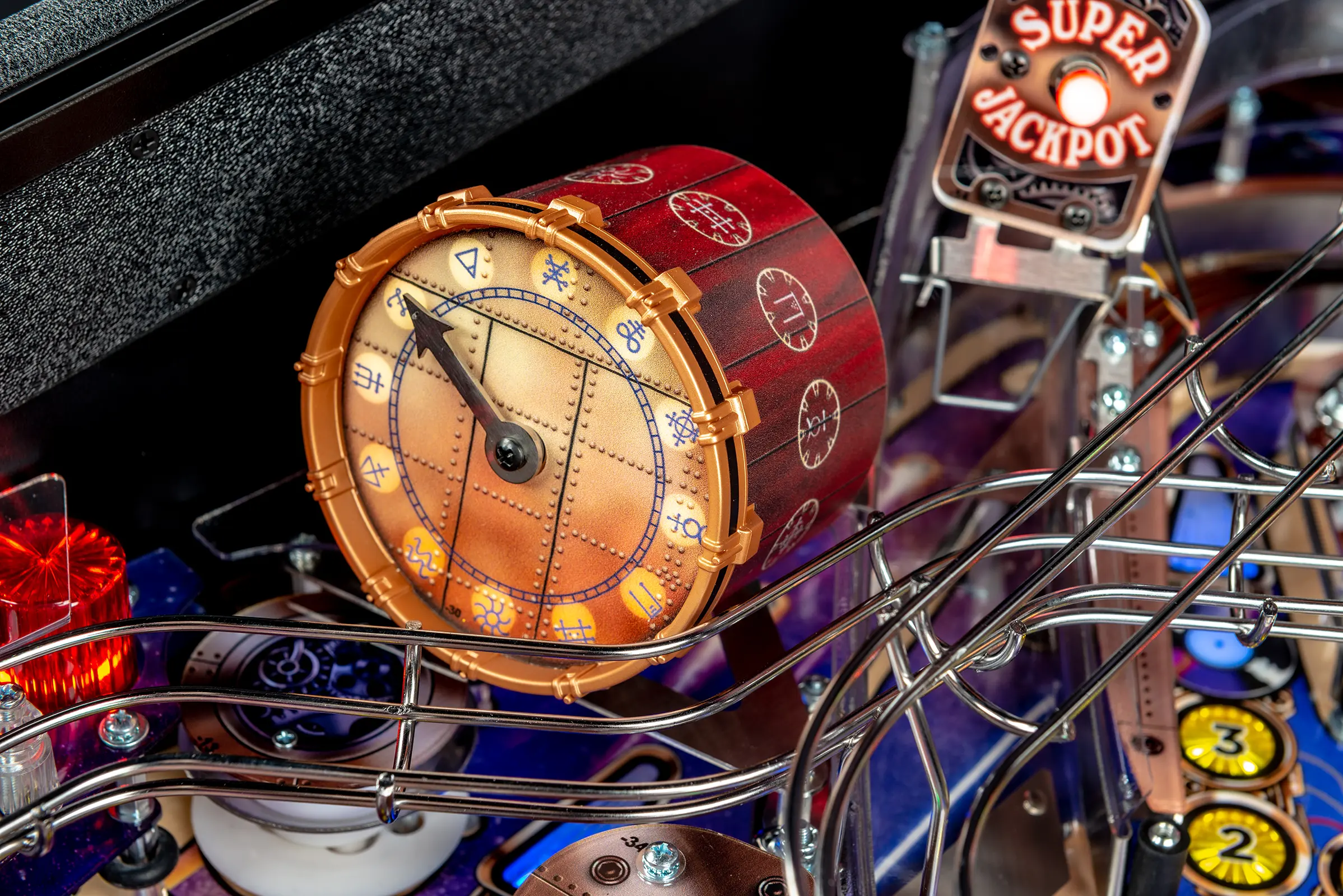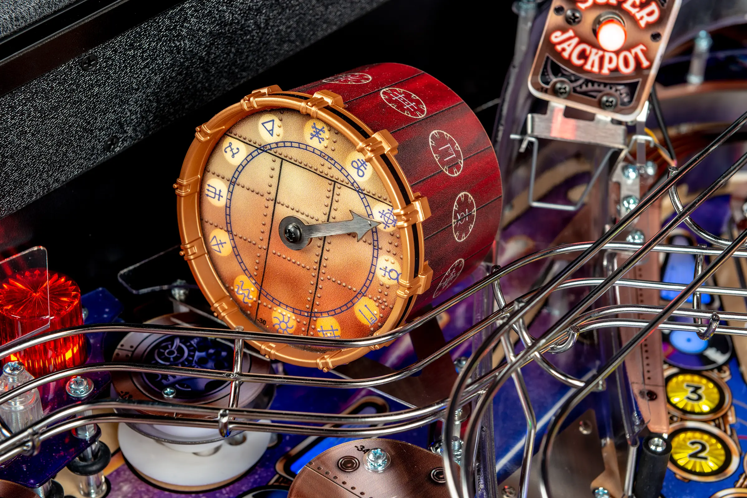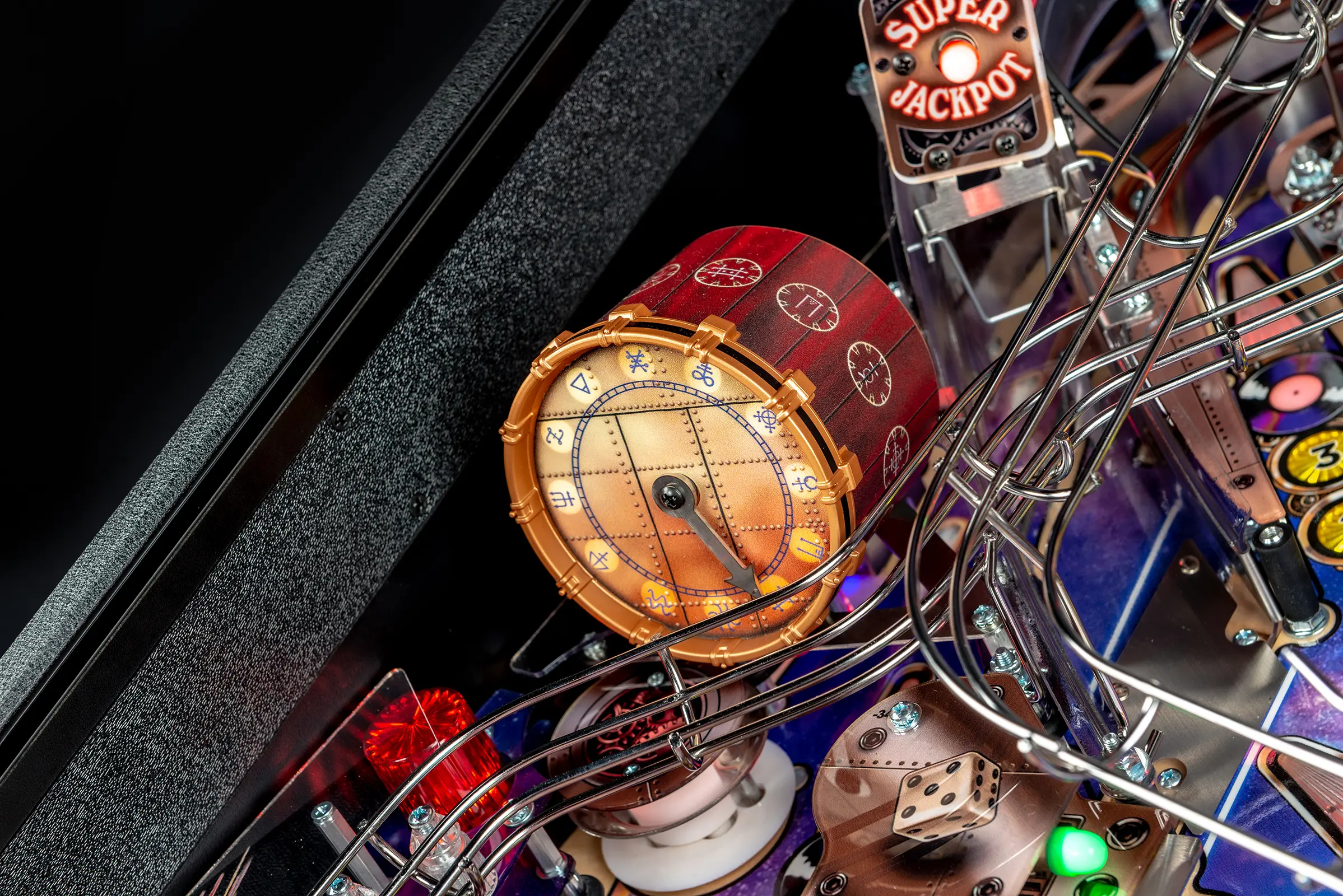 Travel back in time with Rush by shooting pinballs through a custom sculpted, electromagnetic Time Machine.  Players will explore Red Barchetta, Subdivisions, and Fly By Night Multiball action.  The Rush Premium and LE model pinball experience includes a motorized ramp with custom lighting effects and a custom sculpted Clockwork Angels Clock, inspired from Neil Peart’s bass drum from their Time Machine Tour.  This motorized clock illuminates, and when it strikes midnight players will be transported to a Headlong Flight Multiball frenzy.