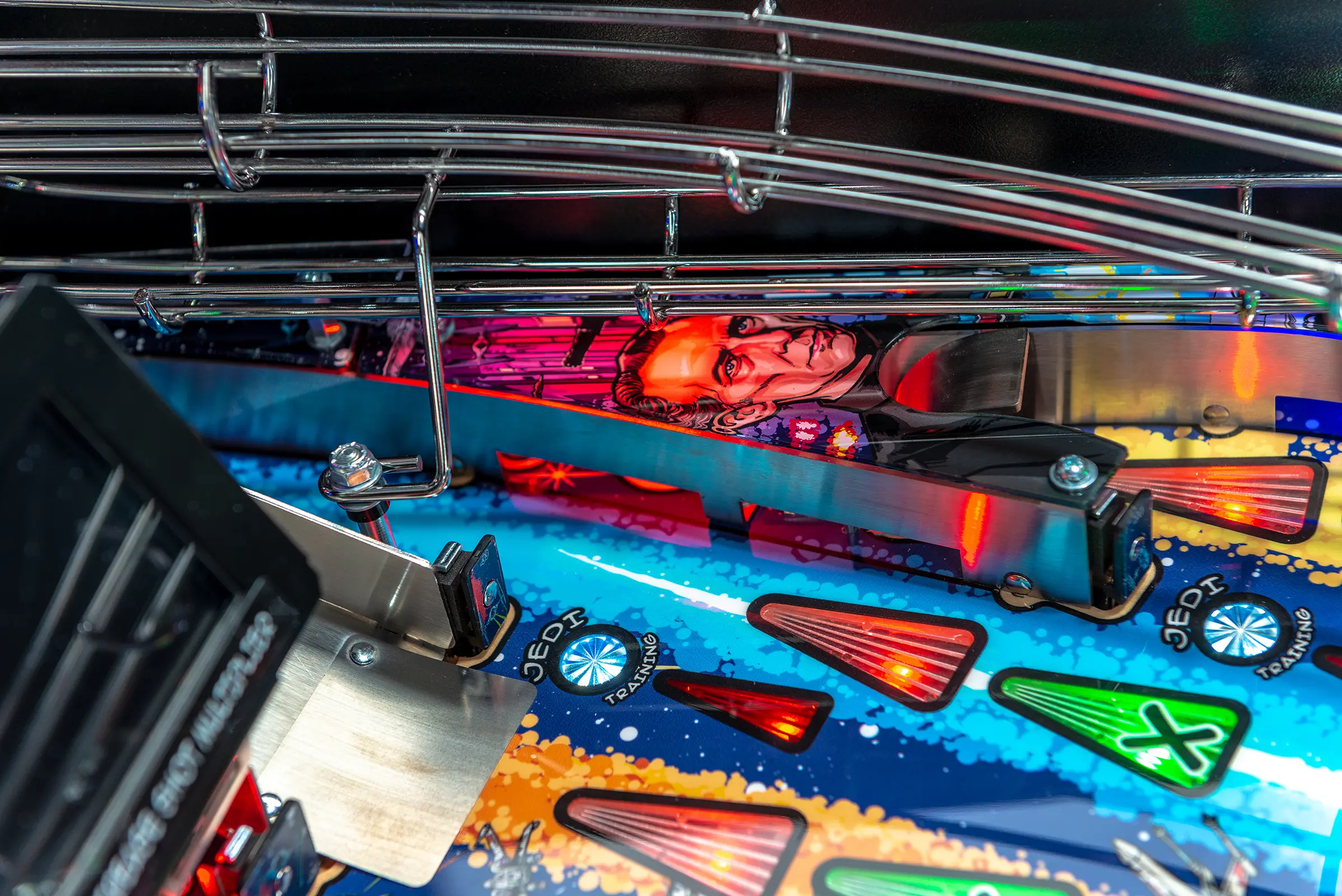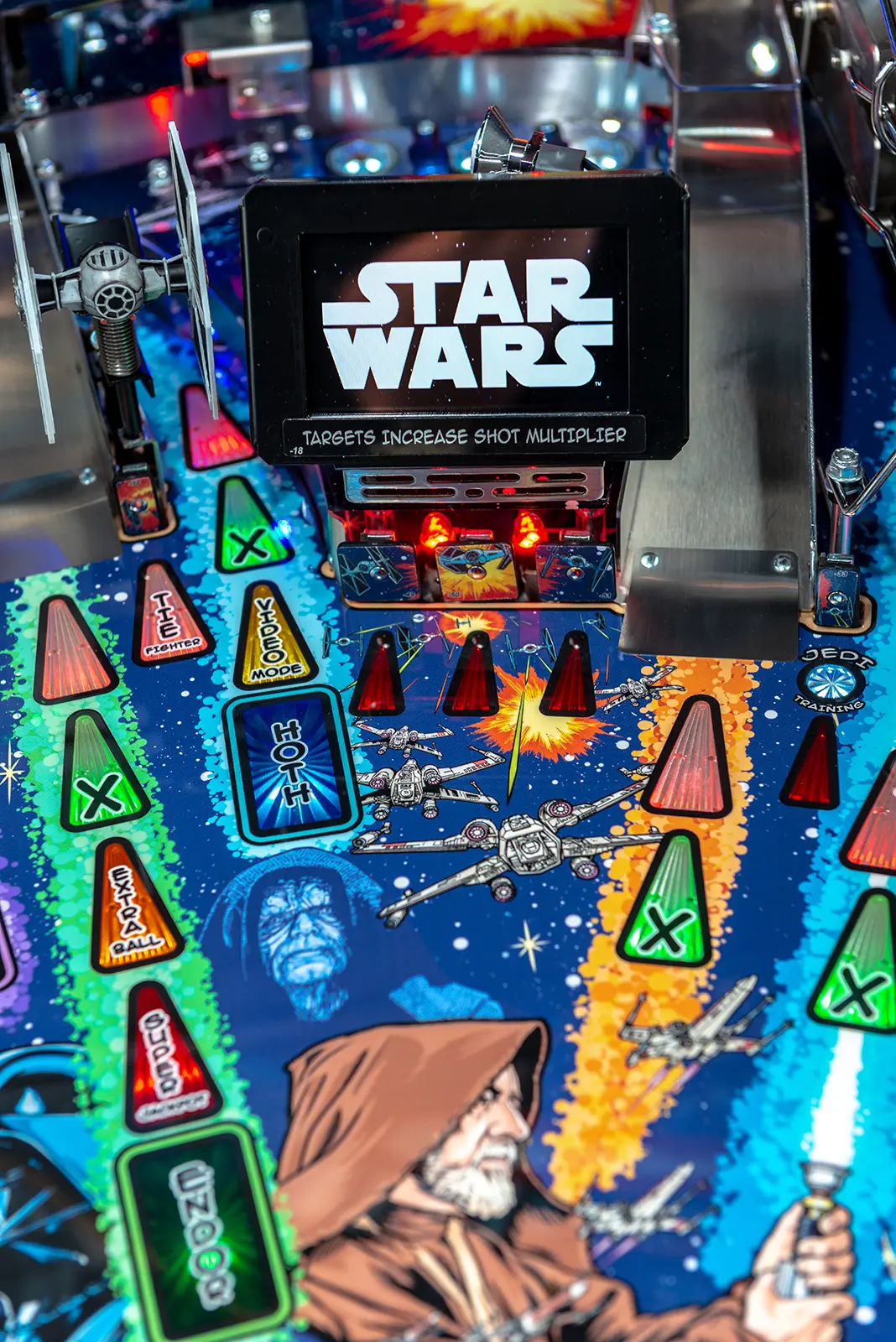 The Star Wars themed Comic Art Pro and Star Wars Comic Art Premium machines made by Stern are packed with features that provide an irresistible game experience. The game includes select dialogue and footage from the original Star Wars trilogy, color-changing LED-lighted inserts, and a sculpted TIE fighter. All models feature two LCD screens. The Premium model also features art representing an exploding Death Star, a sculpted LED-lit Millennium Falcon and an interactive hyperspace loop that encircles the playfield and can accommodate up to 5 pinballs at once.
