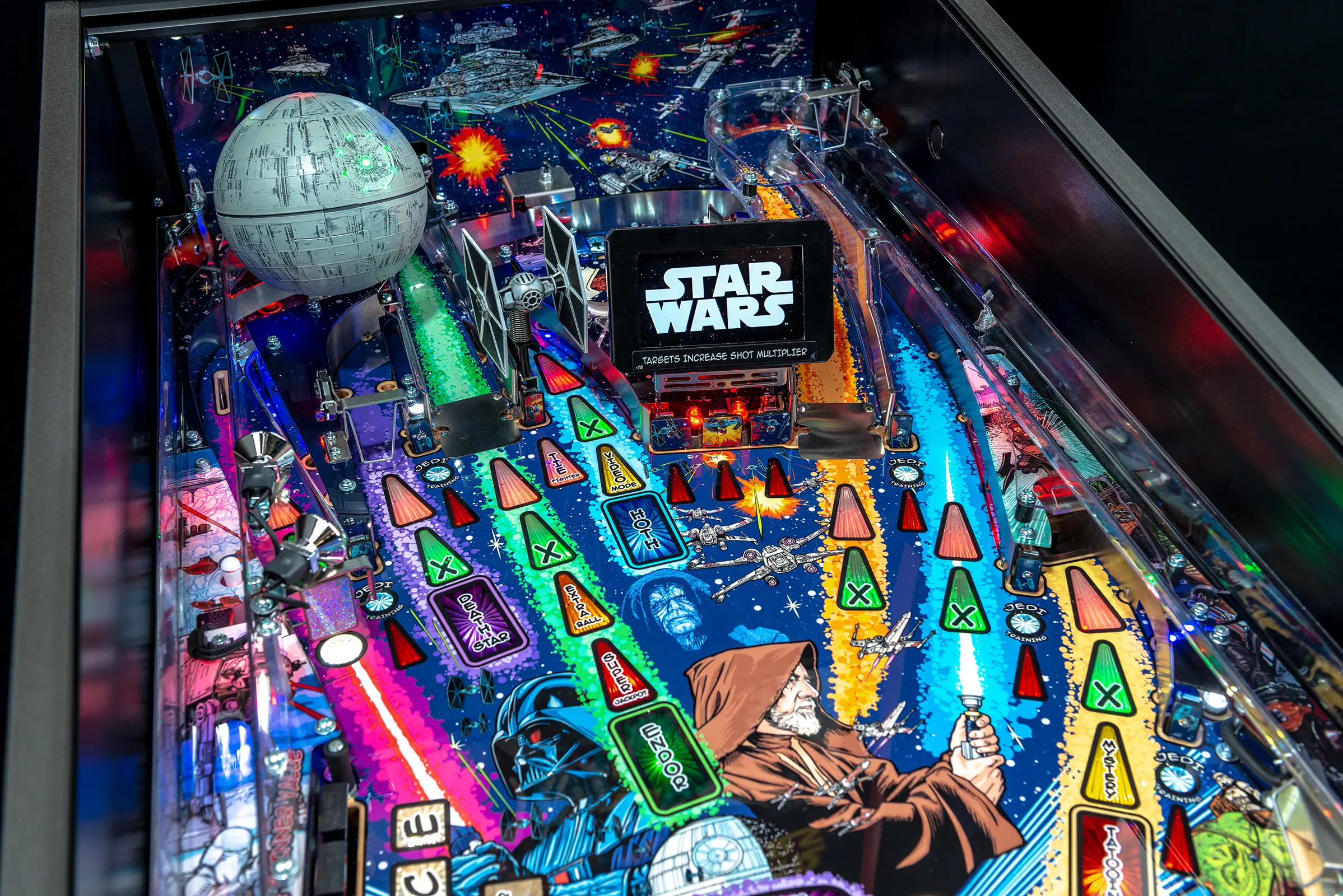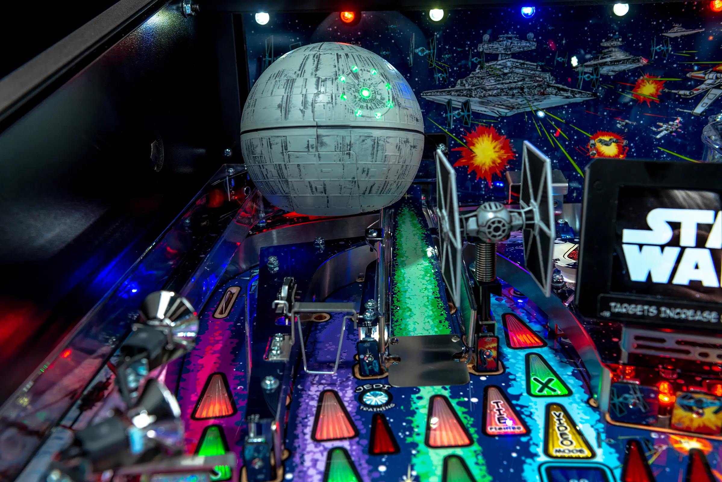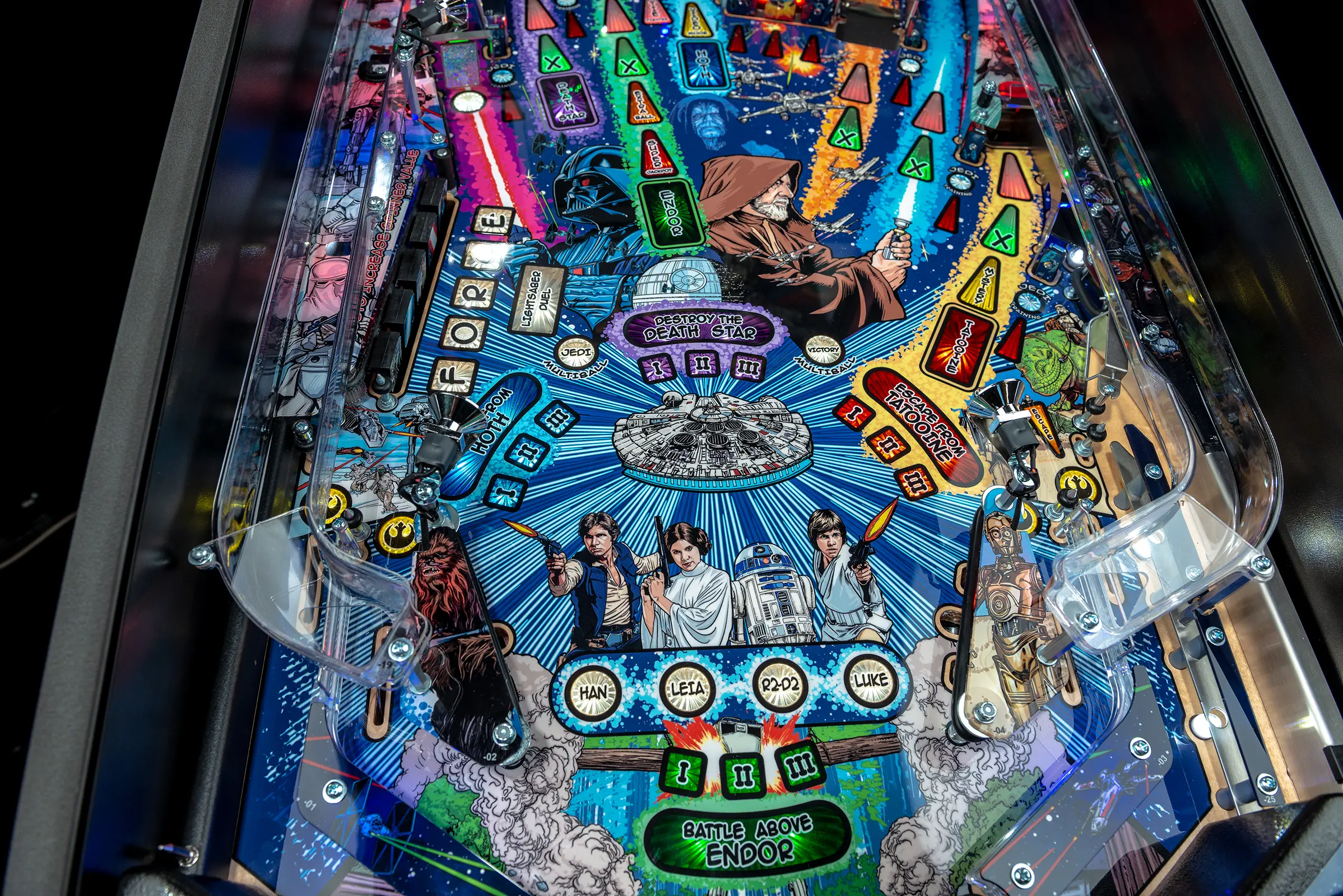 The Star Wars themed Comic Art Pro and Star Wars Comic Art Premium machines made by Stern are packed with features that provide an irresistible game experience. The game includes select dialogue and footage from the original Star Wars trilogy, color-changing LED-lighted inserts, and a sculpted TIE fighter. All models feature two LCD screens. The Premium model also features art representing an exploding Death Star, a sculpted LED-lit Millennium Falcon and an interactive hyperspace loop that encircles the playfield and can accommodate up to 5 pinballs at once.